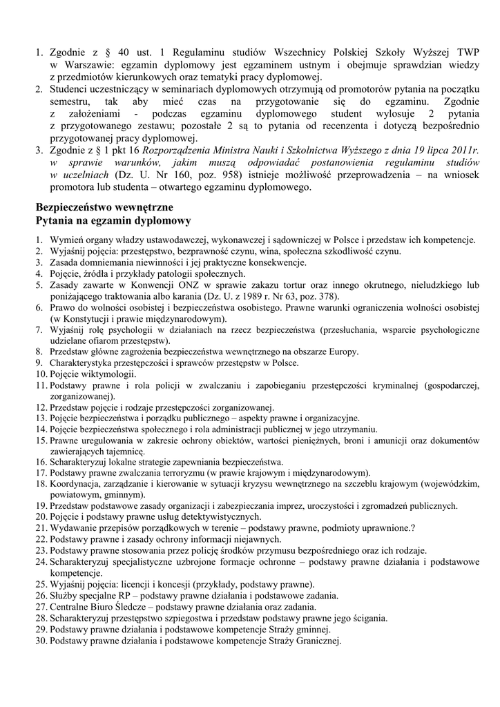 1. Zgodnie z § 40 ust. 1 Regulaminu studiów Wszechnicy Polskiej Szkoły WyŜszej TWP w Warszawie: egzamin dyplomowy jest egzaminem ustnym i obejmuje sprawdzian wiedzy z przedmiotów kierunkowych oraz tematyki pracy dyplomowej. 2. Studenci uczestniczący w seminariach dyplomowych otrzymują od promotorów pytania na początku semestru, tak aby mieć czas na przygotowanie się do egzaminu. Zgodnie z załoŜeniami - podczas egzaminu dyplomowego student wylosuje 2 pytania z przygotowanego zestawu; pozostałe 2 są to pytania od recenzenta i dotyczą bezpośrednio przygotowanej pracy dyplomowej. 3. Zgodnie z § 1 pkt 16 Rozporządzenia Ministra Nauki i Szkolnictwa WyŜszego z dnia 19 lipca 2011r. w sprawie warunków, jakim muszą odpowiadać postanowienia regulaminu studiów w uczelniach (Dz. U. Nr 160, poz. 958) istnieje moŜliwość przeprowadzenia – na wniosek promotora lub studenta – otwartego egzaminu dyplomowego. Bezpieczeństwo wewnętrzne Pytania na egzamin dyplomowy 1. 2. 3. 4. 5. Wymień organy władzy ustawodawczej, wykonawczej i sądowniczej w Polsce i przedstaw ich kompetencje. Wyjaśnij pojęcia: przestępstwo, bezprawność czynu, wina, społeczna szkodliwość czynu. Zasada domniemania niewinności i jej praktyczne konsekwencje. Pojęcie, źródła i przykłady patologii społecznych. Zasady zawarte w Konwencji ONZ w sprawie zakazu tortur oraz innego okrutnego, nieludzkiego lub poniŜającego traktowania albo karania (Dz. U. z 1989 r. Nr 63, poz. 378). 6. Prawo do wolności osobistej i bezpieczeństwa osobistego. Prawne warunki ograniczenia wolności osobistej (w Konstytucji i prawie międzynarodowym). 7. Wyjaśnij rolę psychologii w działaniach na rzecz bezpieczeństwa (przesłuchania, wsparcie psychologiczne udzielane ofiarom przestępstw). 8. Przedstaw główne zagroŜenia bezpieczeństwa wewnętrznego na obszarze Europy. 9. Charakterystyka przestępczości i sprawców przestępstw w Polsce. 10. Pojęcie wiktymologii. 11. Podstawy prawne i rola policji w zwalczaniu i zapobieganiu przestępczości kryminalnej (gospodarczej, zorganizowanej). 12. Przedstaw pojęcie i rodzaje przestępczości zorganizowanej. 13. Pojęcie bezpieczeństwa i porządku publicznego – aspekty prawne i organizacyjne. 14. Pojęcie bezpieczeństwa społecznego i rola administracji publicznej w jego utrzymaniu. 15. Prawne uregulowania w zakresie ochrony obiektów, wartości pienięŜnych, broni i amunicji oraz dokumentów zawierających tajemnicę. 16. Scharakteryzuj lokalne strategie zapewniania bezpieczeństwa. 17. Podstawy prawne zwalczania terroryzmu (w prawie krajowym i międzynarodowym). 18. Koordynacja, zarządzanie i kierowanie w sytuacji kryzysu wewnętrznego na szczeblu krajowym (wojewódzkim, powiatowym, gminnym). 19. Przedstaw podstawowe zasady organizacji i zabezpieczania imprez, uroczystości i zgromadzeń publicznych. 20. Pojęcie i podstawy prawne usług detektywistycznych. 21. Wydawanie przepisów porządkowych w terenie – podstawy prawne, podmioty uprawnione.? 22. Podstawy prawne i zasady ochrony informacji niejawnych. 23. Podstawy prawne stosowania przez policję środków przymusu bezpośredniego oraz ich rodzaje. 24. Scharakteryzuj specjalistyczne uzbrojone formacje ochronne – podstawy prawne działania i podstawowe kompetencje. 25. Wyjaśnij pojęcia: licencji i koncesji (przykłady, podstawy prawne). 26. SłuŜby specjalne RP – podstawy prawne działania i podstawowe zadania. 27. Centralne Biuro Śledcze – podstawy prawne działania oraz zadania. 28. Scharakteryzuj przestępstwo szpiegostwa i przedstaw podstawy prawne jego ścigania. 29. Podstawy prawne działania i podstawowe kompetencje StraŜy gminnej. 30. Podstawy prawne działania i podstawowe kompetencje StraŜy Granicznej.
