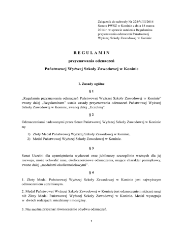 Załącznik do uchwały Nr 228/V/III/2014 Senatu PWSZ w Koninie z dnia 18 marca 2014 r. w sprawie ustalenia Regulaminu przyznawania odznaczeń Państwowej Wyższej Szkoły Zawodowej w Koninie REGULAMIN przyznawania odznaczeń Państwowej Wyższej Szkoły Zawodowej w Koninie I. Zasady ogólne §1 „Regulamin przyznawania odznaczeń Państwowej Wyższej Szkoły Zawodowej w Koninie” zwany dalej „Regulaminem” ustala zasady przyznawania odznaczeń Państwowej Wyższej Szkoły Zawodowej w Koninie, zwanej dalej „Uczelnią”. §2 Odznaczeniami nadawanymi przez Senat Państwowej Wyższej Szkoły Zawodowej w Koninie są: 1) Złoty Medal Państwowej Wyższej Szkoły Zawodowej w Koninie, 2) Medal Państwowej Wyższej Szkoły Zawodowej w Koninie. §3 Senat Uczelni dla upamiętnienia wydarzeń oraz jubileuszy szczególnie ważnych dla jej rozwoju, może uchwalić inne, okolicznościowe odznaczenia, mające charakter pamiątkowy, zwane dalej „medalami okolicznościowymi”. §4 1. Złoty Medal Państwowej Wyższej Szkoły Zawodowej w Koninie jest najwyższym odznaczeniem uczelnianym. 2. Medal Państwowej Wyższej Szkoły Zawodowej w Koninie jest odznaczeniem niższej rangi niż Złoty Medal Państwowej Wyższej Szkoły Zawodowej w Koninie. Medal występuje w dwóch rodzajach: miedziany i mosiężny. 3. Nie można przyznać równocześnie obydwu odznaczeń. 1 §5 1. Wnioski o nadanie odznaczeń, o których mowa w § 2 opiniuje senacka komisja do spraw odznaczeń. 2. Medale okolicznościowe nadaje rektor. O ich nadaniu rektor informuje Senat na najbliższym posiedzeniu. §6 1. Złoty Medal Państwowej Wyższej Szkoły Zawodowej w Koninie jest najwyższym uznaniem zasług na rzecz rozwoju Uczelni. Przyznawany jest osobom, które całokształtem swej działalności przyczyniły się wybitnie do rozwoju i promowania Uczelni oraz swą etyczną postawą przyczyniły się do tworzenia pozytywnego wizerunku Uczelni. 2. Złoty Medal Państwowej Wyższej Szkoły Zawodowej w Koninie może otrzymać pracownik lub były pracownik (jeśli od zakończenia pracy w Uczelni nie upłynęły dwa lata), w szczególności gdy: 1) 2) 3) 4) posiada co najmniej 15-letni staż pracy w Uczelni, posiada kwalifikacje zawodowe uznane przez środowisko naukowe lub zawodowe, uzyskuje wysoką ocenę swojej pracy, posiada zasługi w pracy na rzecz przynajmniej jednej z niżej wymienionych dziedzin: - nauki, - dydaktyki, - pracy organizacyjnej, - dorobku artystycznego. 3. W roku akademickim może zostać przyznany jeden Złoty Medal Państwowej Wyższej Szkoły Zawodowej w Koninie. 4. Wzór wniosku o nadanie Złotego Medalu Państwowej Wyższej Szkoły Zawodowej w Koninie określa załącznik nr 1 do regulaminu. §7 1. Medal Państwowej Wyższej Szkoły Zawodowej w Koninie (mosiężny) jest wyróżnieniem uczelnianym, w uznaniu zasług na rzecz rozwoju Uczelni przyznawanym osobom (obywatelom polskim i cudzoziemcom) oraz krajowym i zagranicznym instytucjom, którzy swoją działalnością wnieśli liczący się wkład na rzecz rozwoju organizacyjnego i dydaktycznego Uczelni oraz rozwijania współpracy między uczelniami zarówno w kraju jak i za granicą. 2 2. Medal Państwowej Wyższej Szkoły Zawodowej w Koninie (miedziany) może otrzymać pracownik lub były pracownik (jeśli od zakończenia pracy w Uczelni nie upłynęły dwa lata), w szczególności gdy: 1) posiada co najmniej 10-letni staż pracy w Uczelni, 2) sumiennie wykonuje obowiązki zawodowe oraz wyróżnia się nienaganną opinią i kulturą osobistą. 3) promuje Uczelnię w kraju lub poza jego granicami, 4) podejmuje działania na rzecz sprawnego funkcjonowania administracji Uczelni, 5) dba o mienie Uczelni, podejmuje działania na rzecz rozwoju jej infrastruktury. 3. Medal Państwowej Wyższej Szkoły Zawodowej w Koninie (miedziany) może także otrzymać absolwent Państwowej Wyższej Szkoły Zawodowej w Koninie, który wyróżni się: 1) wybitnymi osiągnięciami w nauce lub sporcie, 2) aktywną działalnością na rzecz społeczności akademickiej Uczelni, a także na rzecz społeczności lokalnej, 3) działaniami na rzecz promocji Uczelni. 4. W roku akademickim może zostać przyznanych łącznie osiem Medali Państwowej Wyższej Szkoły Zawodowej w Koninie, w tym maksymalnie trzy dla wyróżniających się absolwentów. 5. Wzór wniosku o nadanie Medalu Państwowej Wyższej Szkoły Zawodowej w Koninie określa załącznik nr 2 do regulaminu. §8 1. Medale okolicznościowe można wręczać z okazji jubileuszy Państwowej Wyższej Szkoły Zawodowej w Koninie lub aktualnych, ważnych dla Uczelni wydarzeń, zarówno pracownikom jak i osobom nie będącym pracownikami Uczelni, którzy odgrywają znacząca rolę w życiu Uczelni. 2. Wzór wniosku o nadanie medalu okolicznościowego określa załącznik nr 3 do regulaminu. 3. Wręczenie medalu okolicznościowego nie wyklucza wręczenia innego odznaczenia uczelnianego. II. Zgłaszanie kandydatów do odznaczeń oraz nadanie odznaczeń §9 1. Prawo wnioskowania o przyznanie odznaczeń uczelnianych, o których mowa w § 2 i 3 mają: 1) rektor, prorektorzy i dziekani, 2) przewodniczący Konwentu, 3 3) kanclerz, 4) kierownicy jednostek organizacyjnych Uczelni, 5) samorząd studencki. 2. Wniosek o odznaczenie uczelniane zawiera: 1) imię i nazwisko kandydata do wyróżnienia (wykształcenie, stopień/tytuł naukowy) lub nazwa instytucji, 2) miejsce pracy, 3) staż pracy, data zatrudnienia i stanowisko pracy w Uczelni, 4) nazwę wydziału/katedry, kierunek studiów oraz średnią ocen ze studiów w przypadku wniosku dotyczącego absolwenta, 5) uzasadnienie przyznania odznaczenia, zgodnie z kryteriami określonymi w § 6 i 7. § 10 1. Wniosek o przyznanie odznaczenia należy składać w Biurze Rektora, które sprawdza poprawność wniosku pod względem formalnym. W przypadku braków czy innych niezgodności, wniosek jest odsyłany do wnioskodawcy w celu uzupełnienia. 2. Po sprawdzeniu poprawności wniosku Biuro Rektora 