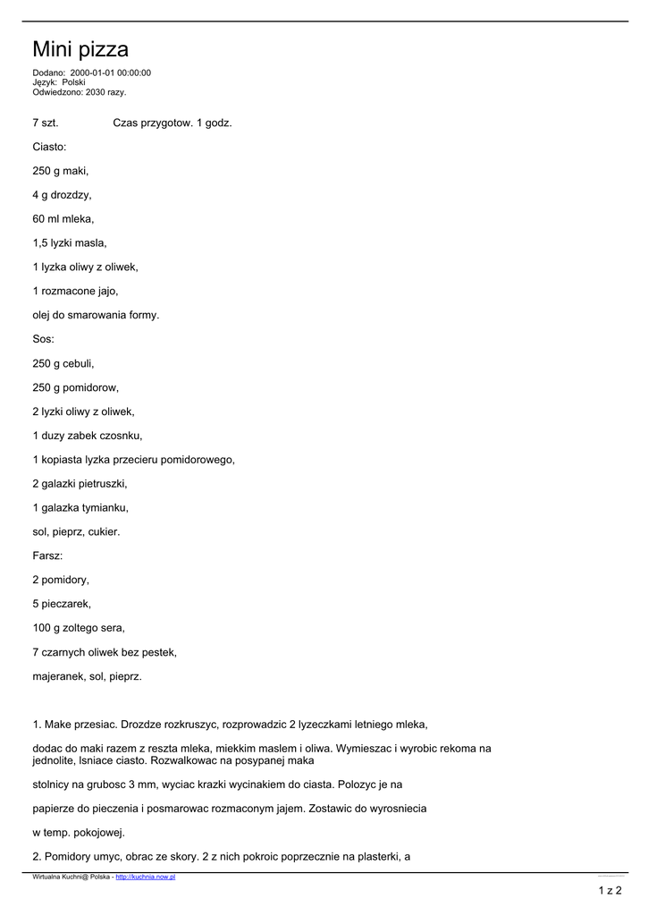 Mini pizza Dodano: 2000-01-01 00:00:00 Język: Polski Odwiedzono: 2030 razy. 7 szt. Czas przygotow. 1 godz. Ciasto: 250 g maki, 4 g drozdzy, 60 ml mleka, 1,5 lyzki masla, 1 lyzka oliwy z oliwek, 1 rozmacone jajo, olej do smarowania formy. Sos: 250 g cebuli, 250 g pomidorow, 2 lyzki oliwy z oliwek, 1 duzy zabek czosnku, 1 kopiasta lyzka przecieru pomidorowego, 2 galazki pietruszki, 1 galazka tymianku, sol, pieprz, cukier. Farsz: 2 pomidory, 5 pieczarek, 100 g zoltego sera, 7 czarnych oliwek bez pestek, majeranek, sol, pieprz. 1. Make przesiac. Drozdze rozkruszyc, rozprowadzic 2 lyzeczkami letniego mleka, dodac do maki razem z reszta mleka, miekkim maslem i oliwa. Wymieszac i wyrobic rekoma na jednolite, lsniace ciasto. Rozwalkowac na posypanej maka stolnicy na grubosc 3 mm, wyciac krazki wycinakiem do ciasta. Polozyc je na papierze do pieczenia i posmarowac rozmaconym jajem. Zostawic do wyrosniecia w temp. pokojowej. 2. Pomidory umyc, obrac ze skory. 2 z nich pokroic poprzecznie na plasterki, a Wirtualna Kuchni@ Polska - http://kuchnia.now.pl przepis nr 5518, plik wygenerowano 2017.03.08 02:44 1z2 reszte wypestkowac i drobno pokroic. Pieczarki umyc, oczyscic, obrac ze skory, pokroic w plasterki. Ser pokroic na kawalki - prostopadlosciany o wymiarach podstawy 2x2 cm i wysokosci 3 mm. 3. Cebule obrac, posiekac. Oliwe rozgrzac na patelni, usmazyc na niej cebule i drobno pokrojone pomidory do miekkosci. Dodac przecier pomidorowy i zmiazdzony czosnek, wymieszac. Dodac posiekane listki umytych i osuszonych ziol. Doprawic do smaku cukrem, sola i pieprzem. Trzymac na ogniu tak dlugo, poki sos nie stanie sie gesty. 4. Rozsmarowac rowno po lyzeczce sosu na kazdym krazku ciasta. Na sos polozyc plasterek pomidora. Posypac sola, pieprzem i majerankiem. Polozyc na to kawalek sera, a na nim plasterek pieczarki. Piec w bardzo goracym piecu (ok. 250żC) ok. 7-8 min. Natychmiast po wyjeciu z pieca na kazdej mini pizzy polozyc kawalek czarnej oliwki i posmarowac ja oliwa by blyszczala. Źródło: Encyklopedia sztuki kulinarnej, tom 21 "Pizze i tarty", strona 22. From: [email protected] (Radku's De Apaczu's) Wirtualna Kuchni@ Polska - http://kuchnia.now.pl przepis nr 5518, plik wygenerowano 2017.03.08 02:44 2z2