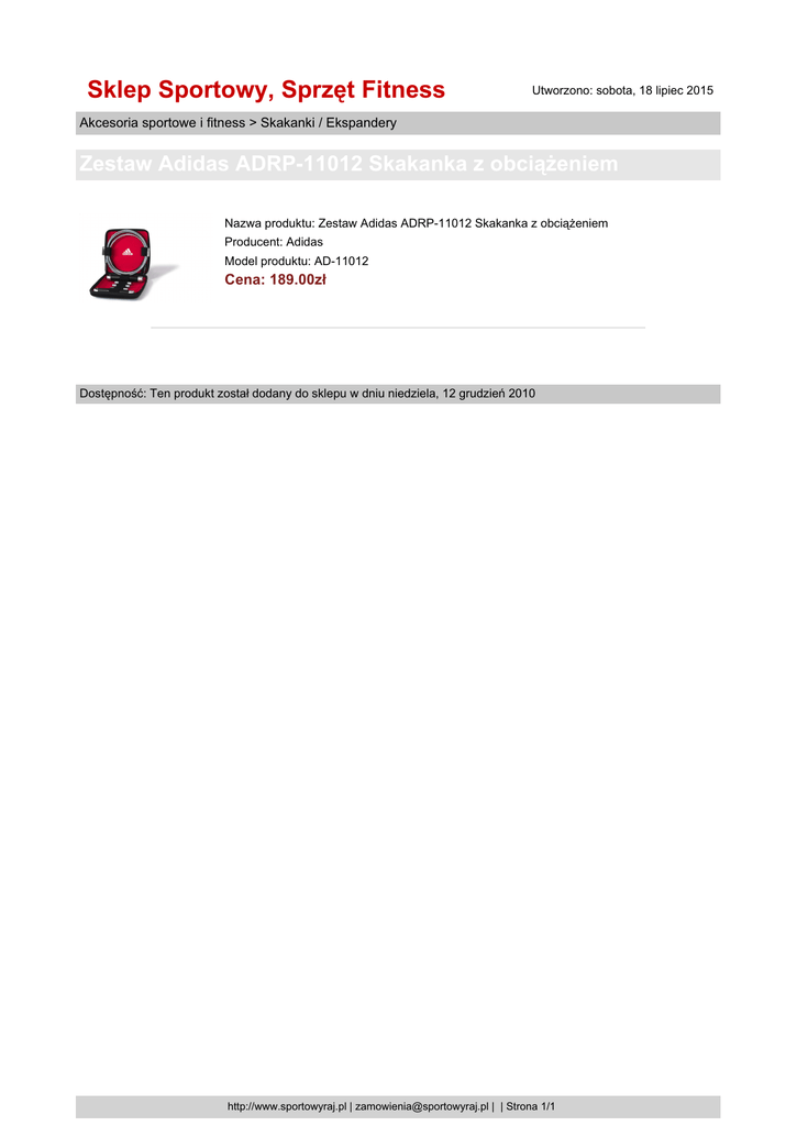 Sklep Sportowy, Sprzęt Fitness Utworzono: sobota, 18 lipiec 2015 Akcesoria sportowe i fitness > Skakanki / Ekspandery Zestaw Adidas ADRP-11012 Skakanka z obciążeniem Nazwa produktu: Zestaw Adidas ADRP-11012 Skakanka z obciążeniem Producent: Adidas Model produktu: AD-11012 Cena: 189.00zł Dostępność: Ten produkt został dodany do sklepu w dniu niedziela, 12 grudzień 2010 http://www.sportowyraj.pl | [email protected] | | Strona 1/1