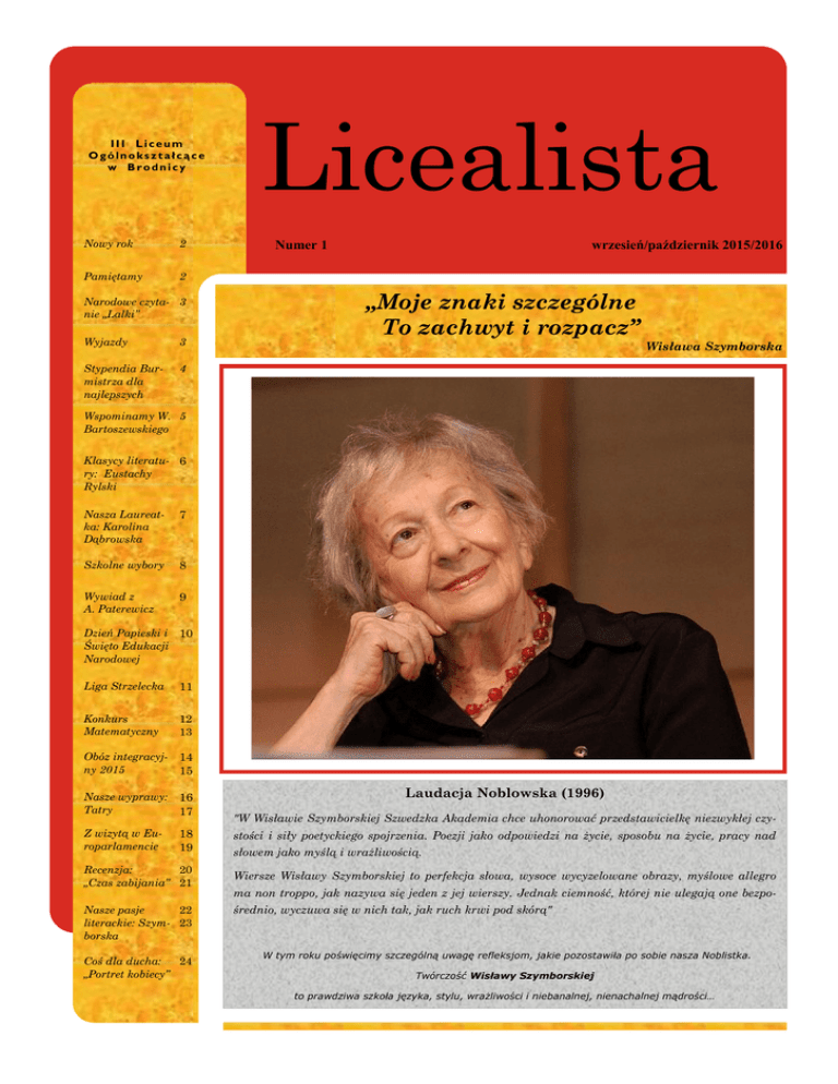 III Liceum Ogólnokształcące w Brodnicy Nowy rok 2 Pamiętamy 2 Narodowe czyta- 3 nie „Lalki” Wyjazdy 3 Stypendia Burmistrza dla najlepszych 4 Licealista Numer 1 wrzesień/październik 2015/2016 „Moje znaki szczególne To zachwyt i rozpacz” Wisława Szymborska Wspominamy W. 5 Bartoszewskiego Klasycy literatu- 6 ry: Eustachy Rylski Nasza Laureatka: Karolina Dąbrowska 7 Szkolne wybory 8 Wywiad z A. Paterewicz 9 Dzień Papieski i 10 Święto Edukacji Narodowej Liga Strzelecka 11 Konkurs Matematyczny 12 13 Obóz integracyjny 2015 14 15 Nasze wyprawy: Tatry 16 17 Z wizytą w Europarlamencie 18 19 stości i siły poetyckiego spojrzenia. Poezji jako odpowiedzi na życie, sposobu na życie, pracy nad Recenzja: 20 „Czas zabijania” 21 Wiersze Wisławy Szymborskiej to perfekcja słowa, wysoce wycyzelowane obrazy, myślowe allegro Nasze pasje 22 literackie: Szym- 23 borska Coś dla ducha: 24 „Portret kobiecy” Laudacja Noblowska (1996) "W Wisławie Szymborskiej Szwedzka Akademia chce uhonorować przedstawicielkę niezwykłej czysłowem jako myślą i wrażliwością. ma non troppo, jak nazywa się jeden z jej wierszy. Jednak ciemność, której nie ulegają one bezpośrednio, wyczuwa się w nich tak, jak ruch krwi pod skórą" W tym roku poświęcimy szczególną uwagę refleksjom, jakie pozostawiła po sobie nasza Noblistka. Twórczość Wisławy Szymborskiej to prawdziwa szkoła języka, stylu, wrażliwości i niebanalnej, nienachalnej mądrości… Nowy rok szkolny My to mamy szczęście 1 września powitaliśmy rok szkol- O tym, co nasz czeka w nowym roku ny 2015/2016. Na uroczystym spo- mówili pan dyrektor Tomasz Wysocki i tkaniu w sali audytoryjnej spotka- pani dyrektor Maria Malinowska. liśmy się wszyscy w komplecie, radośni, chociaż jeszcze nie do Red. końca przekonani, że chcemy pożegnać wakacje. "Ty to masz szczęście?" przypomniała nam Kasia Jaworska, pięknie śpiewając znaną piosenkę o kraju nad Wisłą. I rzeczywiście, chyba mamy szczęście, bo 1 września zobaczyliśmy wszystkich naszych kolegów - uśmiechnię- tych, pełnych energii, wszystkich - w komplecie. Mamy też świetnych pierwszaków. Pamiętamy! Przy Pomniku Wdzięczności w O bohaterach II wojny przypomniał Brodnicy razem z mieszkańcami nauczyciel historii Radosław Stawski Brodnicy uczciliśmy rocznicę wy- w prezentacji, traktującej o miejscach buchu kaźni i przybliżającej postaci bohate- II wojny światowej. rów. Tradycyjnie już 1 września brodniczanie uczcili pamięć ofiar, bohaterów II wojny światowej. Byliśmy tam także: poczet sztandarowy ZS nr 1 im. Karo- la Wojtyły w Brodnicy i przedstawiciele szkoły, którzy złożyli kwiaty pod Pomnikiem Wdzięczności. Pamięć nych, poległych, wywożonych koncentracyjnych, pomordowado do obozów obozów pracy i pamięć o walczących w czasie wojny uczciliśmy także w czasie uroczystego apelu w szkole. 2 Red. Narodowe czytanie „Lalki” Sylwia Panek w roli lektora "Lalka" Bolesława Prusa to nie tylko lektura obowiązkowa na język polski w klasie drugiej. To także "bohaterka" tegorocznej edycji "Narodowego czytania”. W tej ogólnopolskiej akcji III LO reprezentowała Sylwia Panek. W Miejskiej i Powiatowej Bibliotece Publicznej w Brodnicy w piątkowe południe rozpoczęła się ogólnopolska akcja "Narodowe czytanie". Młodzież ze szkół ponadgimnazjalnych powiatu brodnickiego czytała "Lalkę" Bolesława Prusa. Przed kamerami TV "Lalkę" czytała także Sylwia Panek z naszego LO. Red. Na dobry początek — wyjazdy!!! W III LO początek roku szkolnego wcale nie oznacza siedzenia w szkolnych ławkach. Pierwszy tydzień września to czas świetnych wyjazdów. Klasy pierwsze wyjeżdżają na obóz integracyjny nad morze. Uczniowie ze starszych klas jadą w góry. Już 4 września uczniowie klas 2 i 3 wyjeżdżają na wycieczkę w góry. Miejscem docelowym, gdzie młodzież i opiekunowie będą zakwaterowani jest pensjonat "Borowy" w Białym Dunajcu. Jedną z wielu atrakcji jest spacer po "Morskim Oku" oraz po najdłuższej i największej dolinie w polskich Tatrach - Dolinie Chochołowskiej. Ponadto dla naszych wycieczkowiczów zaplanowany jest wypoczynek w termach Szafiry, gdzie niewątpliwie wszyscy się zrelaksują przed wyprawą na szczyty. jest trzydniowy wyjazd integracyjny organizowany dla klas pierwszych. W poniedziałek, 7 września nasza młodzież wraz z opiekunami wyrusza nad morze. W organizację całego przedsięwzięcia zaangażowani są drugo- i trzecioklasiści wraz z nauczycielami. Co roku pierwszoklasiści wraz z wychowawcami zabierani są do Władysławowa. Tam czekają na nich różne atrakcje, zabawy, wyzwania i zadania. Oczywiście nie obędzie się także bez dyskoteki i karaoke, no i oczywiście tradycyjnych Otrzęsin. Niewątpliwie wyjazd nad morze to idealny czas na integrację klas z wychowawcami. Emilia Lenga Kolejnym bardzo ważnym wyjazdem, bez którego nie można byłoby się obyć, 3 Nagrody dla najlepszych Stypendia Burmistrza 2015 Najlepsi uczniowie brodnickich szkół młodzież z brodnickich gimnazjów i III Wszystkim stypendystom gratuluje- odebrali w piątek, 18 września nagro- LO, która osiągnęła najwyższe wyniki my i życzymy dalszych sukcesów w dy - stypendia Burmistrza Brodnicy. w swojej szkole. nauce, a pozostałym życzymy żeby w Wśród najlepszych są także uczniowie przyszłości znaleźli się gronie najlep- III LO. Burmistrz Miasta Jarosław Radacz wręczył prymusom dyplomy uzyskania stypendiów oraz drobne upominki. Nauka to nie tylko obowiązek, wynika- Oczywiście nie obyło się bez gratulacji jący z powszechnie przyjętych norm. i życzenia dalszych sukcesów w nauce. Dla niektórych jest ona ciężarem, dla innych przyjemnością oraz drogą do osiągnięcia wybranego celu. Dla tych drugich jest w Brodnicy wspaniała nagroda. Uczniowie brodnickich szkół, którzy osiągają bardzo wysokie wyniki w Z III LO stypendium Burmistrza Miasta Brodnica w okresie o