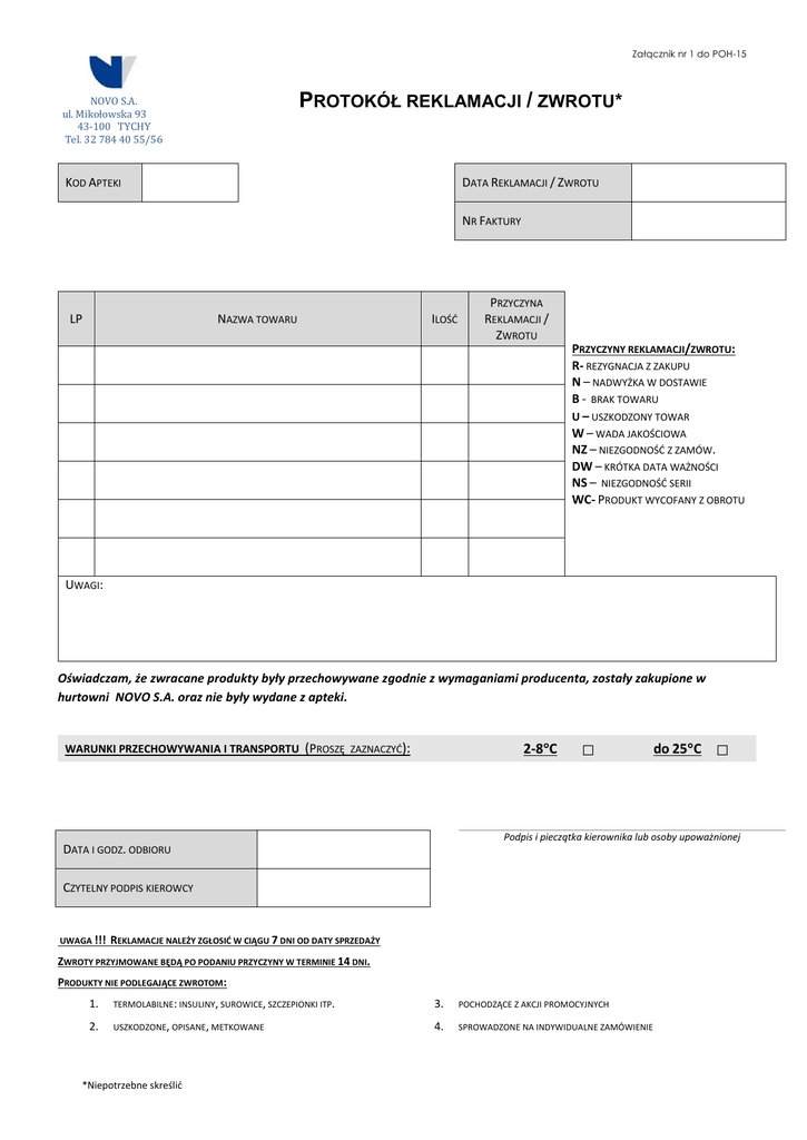 Załącznik nr 1 do POH-15 PROTOKÓŁ REKLAMACJI / ZWROTU* NOVO S.A. ul. Mikołowska 93 43-100 TYCHY Tel. 32 784 40 55/56 KOD APTEKI DATA REKLAMACJI / ZWROTU NR FAKTURY LP NAZWA TOWARU ILOŚĆ PRZYCZYNA REKLAMACJI / ZWROTU PRZYCZYNY REKLAMACJI/ZWROTU: R- REZYGNACJA Z ZAKUPU N – NADWYŻKA W DOSTAWIE B - BRAK TOWARU U – USZKODZONY TOWAR W – WADA JAKOŚCIOWA NZ – NIEZGODNOŚĆ Z ZAMÓW. DW – KRÓTKA DATA WAŻNOŚCI NS – NIEZGODNOŚĆ SERII WC- PRODUKT WYCOFANY Z OBROTU UWAGI: Oświadczam, że zwracane produkty były przechowywane zgodnie z wymaganiami producenta, zostały zakupione w hurtowni NOVO S.A. oraz nie były wydane z apteki. WARUNKI PRZECHOWYWANIA I TRANSPORTU (PROSZĘ ZAZNACZYĆ): 2-8C □ do 25C □ Podpis i pieczątka kierownika lub osoby upoważnionej DATA I GODZ. ODBIORU CZYTELNY PODPIS KIEROWCY UWAGA !!! REKLAMACJE NALEŻY ZGŁOSIĆ W CIĄGU 7 DNI OD DATY SPRZEDAŻY ZWROTY PRZYJMOWANE BĘDĄ PO PODANIU PRZYCZYNY W TERMINIE 14 DNI. PRODUKTY NIE PODLEGAJĄCE ZWROTOM: 1. TERMOLABILNE: INSULINY, SUROWICE, SZCZEPIONKI ITP. 3. POCHODZĄCE Z AKCJI PROMOCYJNYCH 2. USZKODZONE, OPISANE, METKOWANE 4. SPROWADZONE NA INDYWIDUALNE ZAMÓWIENIE *Niepotrzebne skreślić