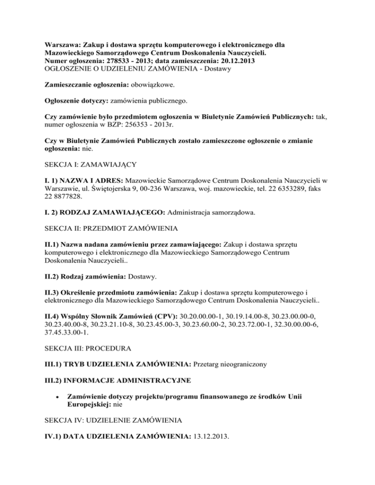 Warszawa: Zakup i dostawa sprzętu komputerowego i elektronicznego dla Mazowieckiego Samorządowego Centrum Doskonalenia Nauczycieli. Numer ogłoszenia: 278533 - 2013; data zamieszczenia: 20.12.2013 OGŁOSZENIE O UDZIELENIU ZAMÓWIENIA - Dostawy Zamieszczanie ogłoszenia: obowiązkowe. Ogłoszenie dotyczy: zamówienia publicznego. Czy zamówienie było przedmiotem ogłoszenia w Biuletynie Zamówień Publicznych: tak, numer ogłoszenia w BZP: 256353 - 2013r. Czy w Biuletynie Zamówień Publicznych zostało zamieszczone ogłoszenie o zmianie ogłoszenia: nie. SEKCJA I: ZAMAWIAJĄCY I. 1) NAZWA I ADRES: Mazowieckie Samorządowe Centrum Doskonalenia Nauczycieli w Warszawie, ul. Świętojerska 9, 00-236 Warszawa, woj. mazowieckie, tel. 22 6353289, faks 22 8877828. I. 2) RODZAJ ZAMAWIAJĄCEGO: Administracja samorządowa. SEKCJA II: PRZEDMIOT ZAMÓWIENIA II.1) Nazwa nadana zamówieniu przez zamawiającego: Zakup i dostawa sprzętu komputerowego i elektronicznego dla Mazowieckiego Samorządowego Centrum Doskonalenia Nauczycieli.. II.2) Rodzaj zamówienia: Dostawy. II.3) Określenie przedmiotu zamówienia: Zakup i dostawa sprzętu komputerowego i elektronicznego dla Mazowieckiego Samorządowego Centrum Doskonalenia Nauczycieli.. II.4) Wspólny Słownik Zamówień (CPV): 30.20.00.00-1, 30.19.14.00-8, 30.23.00.00-0, 30.23.40.00-8, 30.23.21.10-8, 30.23.45.00-3, 30.23.60.00-2, 30.23.72.00-1, 32.30.00.00-6, 37.45.33.00-1. SEKCJA III: PROCEDURA III.1) TRYB UDZIELENIA ZAMÓWIENIA: Przetarg nieograniczony III.2) INFORMACJE ADMINISTRACYJNE Zamówienie dotyczy projektu/programu finansowanego ze środków Unii Europejskiej: nie SEKCJA IV: UDZIELENIE ZAMÓWIENIA IV.1) DATA UDZIELENIA ZAMÓWIENIA: 13.12.2013. IV.2) LICZBA OTRZYMANYCH OFERT: 1. IV.3) LICZBA ODRZUCONYCH OFERT: 0. IV.4) NAZWA I ADRES WYKONAWCY, KTÓREMU UDZIELONO ZAMÓWIENIA: AZET Jolanta Chądzyńska i Maciej Chądzyński, ul. Tadeusza Gierzyńskiego 17, 09407 Płock, kraj/woj. mazowieckie. IV.5) Szacunkowa wartość zamówienia (bez VAT): 19512,20 PLN. IV.6) INFORMACJA O CENIE WYBRANEJ OFERTY ORAZ O OFERTACH Z NAJNIŻSZĄ I NAJWYŻSZĄ CENĄ Cena wybranej oferty: 23818,95 Oferta z najniższą ceną: 23818,95 / Oferta z najwyższą ceną: 23818,95 Waluta: PLN.