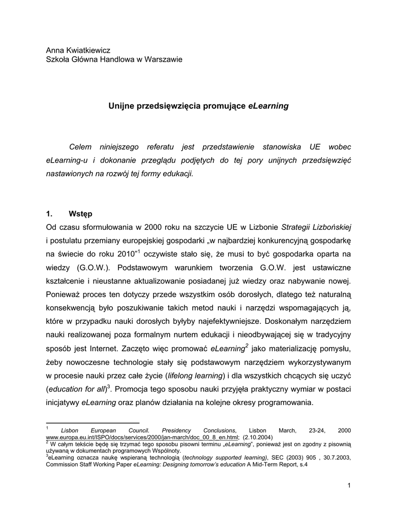 Anna Kwiatkiewicz Szkoła Główna Handlowa w Warszawie Unijne przedsięwzięcia promujące eLearning Celem niniejszego referatu jest przedstawienie stanowiska UE wobec eLearning-u i dokonanie przeglądu podjętych do tej pory unijnych przedsięwzięć nastawionych na rozwój tej formy edukacji. 1. Wstęp Od czasu sformułowania w 2000 roku na szczycie UE w Lizbonie Strategii Lizbońskiej i postulatu przemiany europejskiej gospodarki „w najbardziej konkurencyjną gospodarkę na świecie do roku 2010”1 oczywiste stało się, że musi to być gospodarka oparta na wiedzy (G.O.W.). Podstawowym warunkiem tworzenia G.O.W. jest ustawiczne kształcenie i nieustanne aktualizowanie posiadanej już wiedzy oraz nabywanie nowej. Ponieważ proces ten dotyczy przede wszystkim osób dorosłych, dlatego też naturalną konsekwencją było poszukiwanie takich metod nauki i narzędzi wspomagających ją, które w przypadku nauki dorosłych byłyby najefektywniejsze. Doskonałym narzędziem nauki realizowanej poza formalnym nurtem edukacji i nieodbywającej się w tradycyjny 2 sposób jest Internet. Zaczęto więc promować eLearning jako materializację pomysłu, żeby nowoczesne technologie stały się podstawowym narzędziem wykorzystywanym w procesie nauki przez całe życie (lifelong learning) i dla wszystkich chcących się uczyć (education for all)3. Promocja tego sposobu nauki przyjęła praktyczny wymiar w postaci inicjatywy eLearning oraz planów działania na kolejne okresy programowania. 1 Lisbon European Council. Presidency Conclusions, Lisbon March, 23-24, 2000 www.europa.eu.int/ISPO/docs/services/2000/jan-march/doc_00_8_en.html; (2.10.2004) 2 W całym tekście będę się trzymać tego sposobu pisowni terminu „eLearning”, ponieważ jest on zgodny z pisownią używaną w dokumentach programowych Wspólnoty. 3 eLearning oznacza naukę wspieraną technologią (technology supported learning), SEC (2003) 905 , 30.7.2003, Commission Staff Working Paper eLearning: Designing tomorrow’s education A Mid-Term Report, s.4 1 2. Inicjatywa eLearning Inicjatywa eLearning („eLearning: Designing tomorrow’s education” initiative) została przyjęta przez Komisję Europejską 24 maja 2000 roku4. Jej celem jest m.in. „upowszechnienie wykorzystywania nowych technologii multimedialnych i Internetu do poprawienia jakości nauczania poprzez ułatwianie dostępu do zasobów oraz usług, a także poprzez wzmacnianie wymiany naukowej/zawodowej i współpracy na odległość”5. Unijna inicjatywa eLearning w początkowej swej fazie opierała się na 4 filarach: zapewnianiu odpowiedniej infrastruktury informatycznej, prowadzeniu szkoleń z zakresu technologii cyfrowej, projektowaniu europejskich usług świadczonych w sieci i odpowiedniego oprogramowania oraz wspieraniu sieci współpracujących ze sobą partnerów6. Zapewnianie odpowiedniej infrastruktury informatycznej oznaczało wyposażenie europejskich szkół w komputery bardzo dobrej jakości po rozsądnych kosztach. Planowano zamieszczenie w Internecie zasobów edukacyjnych, takich jak programy autorskie czy też przykładowe narzędzia. Miały zostać podjęte działania, które wpłynęłyby na unowocześnienie zawartości programów szkolnych poprzez włączenie w nie nowych metod nauczania opartych na technologiach informacyjnych i komunikacyjnych (ICT). Prowadzenie szkoleń w zakresie technologii cyfrowej miało na celu umożliwienie zdobycia podstawowych umiejętności cyfrowych przez jak największą liczbę osób. Szkolenia dla nauczycieli z tego zakresu były postrzegane jako szczególnie istotne: dla tej grupy przewidziano szkolenia na temat wykorzystywania ICT do celów edukacyjnych. Szkoły, uniwersytety i centra szkoleniowe miały być zachęcane do przekształcenia się 4 COM (2000) 318 final, 24.05.2000; http://www.europa.eu.int/comm/eLearning, (6.10.2004) http://eLearningeuropa.info/dir_programs.php?lng=1& (5.10.2004) 6 The importance of education and training in an economy based on innovation and knowledge, przemówienie Viviane Reding, komisarza ds. edukacji i kultury, wygłoszone w Birmingham, 20.03.2000 na konferencji rozpoczynającej II fazę programu Socrates; http://europa.eu.int/rapid/pressReleasesAction.do?reference=SPEECH/00/88&format=HTML&aged=1&language=EN &guiLanguage=enwww, (2.10.2004) 5 2 w lokalne centra pozyskiwania wiedzy, z których mogliby korzystać wszyscy zainteresowani bez względu na wiek. Zaprojektowanie europejskich usług świadczonych w sieci i odpowiedniego oprogramowania w wymiarze edukacyjnym miało na celu zapewnienie odpowiednich warunków tworzenia otoczenia sprzyjającego nauce. Miało się to przejawiać w wypracowaniu zestawu odpowiednich standardów, które mogłyby stanowić punkty odniesienia dla dalszych działań. Tworzenie sieci współpracujących ze sobą partnerów oznaczać miało stymulowanie dialogu partnerów na różnych poziomach (lokalnym, regionalnym i krajowym) oraz reprezentujących różne sektory (prywatny, państwowy i pozarządowy). Propagowane miało być formowanie partnerstw publiczno- prywatnych (PPP) w celu wymiany doświadczeń, transferu technologii oraz zwiększania inwestycji w infrastrukturę cyfrową. 3. Plan działania eLearning (eLearning Action Plan) Inicjatywa eLearning jest przedsięwzięciem o charakterze strategicznym określającym długoterminowe cele promocji nauki za pomocą Internetu. Sposób wdrażania tej inicjatywy, a więc dokument o charakterze operacyjnym stanowi Plan Działania eLearning (eLearning Action Plan). Pierwszy Plan Działania Designing tomorrow’s education obejmował lata 2001-2004, drugi Programme for the Effective Integration of Information and Communication Technologies (ICT) in Education and Training Systems in Europe obejmuje lata 2004-2006. 3.1 Plan Działania 2001-2004 Designing tomorrow’s education W Planie Działania na lata 2001-2004 wyjaśniono, jak inicjatywa eLearning wpisuje się w ogólną koncepcję eEurope,