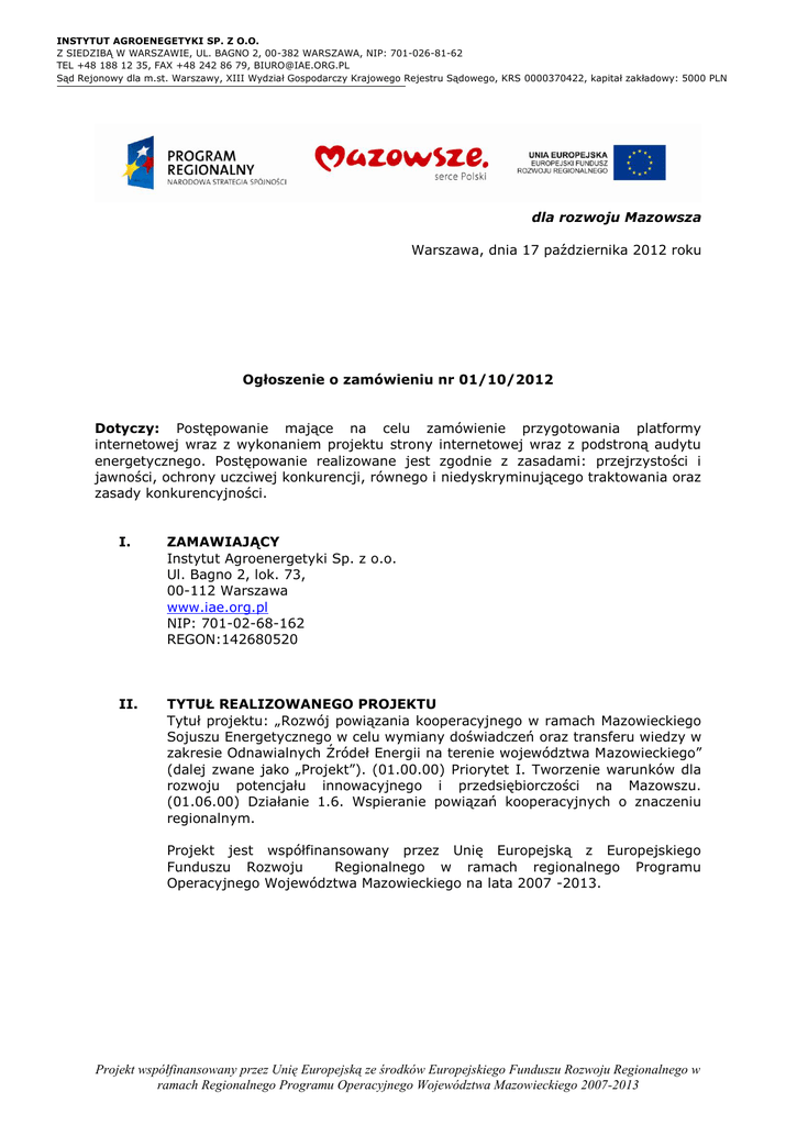 INSTYTUT AGROENEGETYKI SP. Z O.O. Z SIEDZIBĄ W WARSZAWIE, UL. BAGNO 2, 00-382 WARSZAWA, NIP: 701-026-81-62 TEL +48 188 12 35, FAX +48 242 86 79, [email protected] Sąd Rejonowy dla m.st. Warszawy, XIII Wydział Gospodarczy Krajowego Rejestru Sądowego, KRS 0000370422, kapitał zakładowy: 5000 PLN dla rozwoju Mazowsza Warszawa, dnia 17 października 2012 roku Ogłoszenie o zamówieniu nr 01/10/2012 Dotyczy: Postępowanie mające na celu zamówienie przygotowania platformy internetowej wraz z wykonaniem projektu strony internetowej wraz z podstroną audytu energetycznego. Postępowanie realizowane jest zgodnie z zasadami: przejrzystości i jawności, ochrony uczciwej konkurencji, równego i niedyskryminującego traktowania oraz zasady konkurencyjności. I. ZAMAWIAJĄCY Instytut Agroenergetyki Sp. z o.o. Ul. Bagno 2, lok. 73, 00-112 Warszawa www.iae.org.pl NIP: 701-02-68-162 REGON:142680520 II. TYTUŁ REALIZOWANEGO PROJEKTU Tytuł projektu: „Rozwój powiązania kooperacyjnego w ramach Mazowieckiego Sojuszu Energetycznego w celu wymiany doświadczeń oraz transferu wiedzy w zakresie Odnawialnych Źródeł Energii na terenie województwa Mazowieckiego” (dalej zwane jako „Projekt”). (01.00.00) Priorytet I. Tworzenie warunków dla rozwoju potencjału innowacyjnego i przedsiębiorczości na Mazowszu. (01.06.00) Działanie 1.6. Wspieranie powiązań kooperacyjnych o znaczeniu regionalnym. Projekt jest współfinansowany przez Unię Europejską z Europejskiego Funduszu Rozwoju Regionalnego w ramach regionalnego Programu Operacyjnego Województwa Mazowieckiego na lata 2007 -2013. Projekt współfinansowany przez Unię Europejską ze środków Europejskiego Funduszu Rozwoju Regionalnego w ramach Regionalnego Programu Operacyjnego Województwa Mazowieckiego 2007-2013 INSTYTUT AGROENEGETYKI SP. Z O.O. Z SIEDZIBĄ W WARSZAWIE, UL. BAGNO 2, 00-382 WARSZAWA, NIP: 701-026-81-62 TEL +48 188 12 35, FAX +48 242 86 79, [email protected] Sąd Rejonowy dla m.st. Warszawy, XIII Wydział Gospodarczy Krajowego Rejestru Sądowego, KRS 0000370422, kapitał zakładowy: 5000 PLN III. TRYB UDZIELANIA ZAMÓWIENIA Zamówienie dotyczy realizacji usługi poniżej 14000 € netto, jest udzielane zgodnie z zachowaniem zasady konkurencyjności i zasadą z przejrzystości. Zamówienie nie podlega przepisom ustawy Prawo zamówień publicznych. Czy dopuszcza się składanie ofert częściowych: nie Czy dopuszcza się składanie ofert wariantowych: nie Czy przewiduje się wniesienie przez potencjalnego wykonawcę wadium: nie. IV. TERMIN SKŁADANIA OFERT Prosimy o przesłanie ofert w wersji elektronicznej na adres [email protected] bądź drogą pocztową na adres: Instytut Agroenergetyki Sp. z o.o. Ul. Bagno 2, lok 73 00-112 Warszawa Oferty należy składać w terminie do dnia 24 października 2012 roku do godziny 12.00 w siedzibie Zamawiającego. O terminie złożenia oferty decyduje data jej wpływu na skrzynkę odbiorczą Zamawiającego bądź data wpływu wersji papierowej. Oferty złożone po upłynięciu wskazanego terminu nie będą rozpatrywane. W ofertach należy podać datę jej sporządzenia, osobę upoważnioną do kontaktu (imię, nazwisko, telefon kontaktowy, adres e-mail), termin ważności oferty (min. do 16 listopada 2012 r.), cenę netto i brutto oferty. V. TERMIN OTWARCIA KOPERT Koperty z nadesłanymi ofertami zostaną otworzone dnia 24 października 2012 roku o godzinie 12.15 w siedzibie Zamawiającego w Warszawie ul. Bagno 2, lok. 73. Zamawiający nie przewiduje możliwość udziału oferentów w otwarciu kopert. Zamawiający poinformuje oferentów o wyborze Wykonawcy do końca dnia 24 października 2012 roku drogą elektroniczną, zgodnie z danymi kontaktowymi oferentów. VI. OPIS PRZEDMIOTU ZAMÓWIENIA Opis przedmiotu zamówienia znajduje się w Załączniku nr 2 do niniejszego Zawiadomienia i stanowi jego integralną część. VII. TERMIN WYKONANIA ZAMÓWIENIA Nieprzekraczalny termin wykonania zamówienia to 31 października 2012 roku. Projekt współfinansowany przez Unię Europejską ze środków Europejskiego Funduszu Rozwoju Regionalnego w ramach Regionalnego Programu Operacyjnego Województwa Mazowieckiego 2007-2013 INSTYTUT AGROENEGETYKI SP. Z O.O. Z SIEDZIBĄ W WARSZAWIE, UL. BAGNO 2, 00-382 WARSZAWA, NIP: 701-026-81-62 TEL +48 188 12 35, FAX +48 242 86 79, [email protected] Sąd Rejonowy dla m.st. Warszawy, XIII Wydział Gospodarczy Krajowego Rejestru Sądowego, KRS 0000370422, kapitał zakładowy: 5000 PLN VIII. OPIS WARUNKÓW UDZIAŁU W POSTĘPOWANIU ORAZ SPOSOBU DOKONYWANIA OCENY SPEŁNIENIA TYCH WARUNKÓW Kryteria dostępu: 1. Dokument rejestrowy oferenta (wypis z KRS wystawiony nie wcześniej niż 6 miesięcy przed upływem terminu składania ofert, wypis z ewidencji działalności gospodarczej, w przypadku spółki cywilnej również umowa spółki) wraz z oświadczeniem potwierdzającym aktualność informacji przedstawionych w jednym z wyżej wymienionych dokumentów. W przypadku prowadzenia działalności gospodarczej – kopia zaświadczenia o wpisie do ewidencji działalności gospodarczej. 2. Oświadczenie, że oferent akceptuje warunki umowy stanowiącej Załącznik nr 1 do ogłoszenia. 3. Pełnomocnictwo do reprezentacji oferenta, potwierdzające uprawnienia osób podpisujących ofertę, o ile nie wynikają z przepisów prawa lub innych. 4. Oświadczenie, że wobec Wykonawcy nie jest prowadzone żadne postępowanie egzekucyjne i nie ogłoszono wobec niego upadłości. IX. OPIS KRYTERIÓW, KTÓRYMI BENEFICJENT BĘDZIE SIĘ KIEROWAŁ PRZY WYBORZE NAJKORZYSTNIEJSZEJ OFERTY WRAZ Z PODANIEM ZNACZENIA TCH KRYTERIÓW Kryteria wyboru: W przypadku złożenia oferty przez więcej niż jednego oferenta, zamawiający dokona oceny ważnych ofert na podstawie poniżej przedstawionych kryteriów oceny ofert: KRYTERIUM Cena netto łączna wybranych przez Zamawiającego wariantów urządzeń WAGA pkt max. 100 pkt. (dla najniższej cenowo oferty= 100 pkt.; dla pierwszej oferty, która jest wy