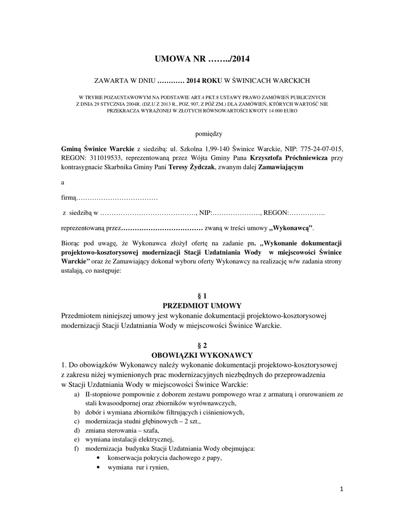 UMOWA NR ……../2014 ZAWARTA W DNIU ………… 2014 ROKU W WINICACH WARCKICH W TRYBIE POZAUSTAWOWYM NA PODSTAWIE ART.4 PKT.8 USTAWY PRAWO ZAMÓWIE PUBLICZNYCH Z DNIA 29 STYCZNIA 2004R. (DZ.U Z 2013 R., POZ. 907, Z PÓ ZM.) DLA ZAMÓWIE , KTÓRYCH WARTO NIE PRZEKRACZA WYRA ONEJ W ZŁOTYCH RÓWNOWARTO CI KWOTY 14 000 EURO pomi dzy Gmin winice Warckie z siedzib : ul. Szkolna 1,99-140 winice Warckie, NIP: 775-24-07-015, REGON: 311019533, reprezentowan przez Wójta Gminy Pana Krzysztofa Próchniewicza przy kontrasygnacie Skarbnika Gminy Pani Teresy ydczak, zwanym dalej Zamawiaj cym a firm ……………………………… z siedzib w ……………………………………, NIP:…………………, REGON:……………. reprezentowan przez……………………………… zwan w tre ci umowy „Wykonawc ”. Bior c pod uwag , e Wykonawca zło ył ofert na zadanie pn. „Wykonanie dokumentacji projektowo-kosztorysowej modernizacji Stacji Uzdatniania Wody w miejscowo ci winice Warckie” oraz e Zamawiaj cy dokonał wyboru oferty Wykonawcy na realizacj w/w zadania strony ustalaj , co nast puje: §1 PRZEDMIOT UMOWY Przedmiotem niniejszej umowy jest wykonanie dokumentacji projektowo-kosztorysowej modernizacji Stacji Uzdatniania Wody w miejscowo ci winice Warckie. §2 OBOWI ZKI WYKONAWCY 1. Do obowi zków Wykonawcy nale y wykonanie dokumentacji projektowo-kosztorysowej z zakresu ni ej wymienionych prac modernizacyjnych niezb dnych do przeprowadzenia w Stacji Uzdatniania Wody w miejscowo ci winice Warckie: a) II-stopniowe pompownie z doborem zestawu pompowego wraz z armatur i orurowaniem ze stali kwasoodpornej oraz zbiorników wyrównawczych, b) dobór i wymiana zbiorników filtruj cych i ci nieniowych, c) modernizacja studni gł binowych – 2 szt., d) zmiana sterowania – szafa, e) wymiana instalacji elektrycznej, f) modernizacja budynku Stacji Uzdatniania Wody obejmuj ca: • konserwacja pokrycia dachowego z papy, • wymiana rur i rynien, • wymiana stolarki okiennej i drzwiowej, • odnowienie elewacji budynku, g) odnowienie pomieszcze hydroforni: monta glazury na cianach, posadzka z terakoty, malowanie cian i sufitów, h) wymiana armatury w sanitariacie wraz z białym monta em, i) odnowienie pozostałej armatury wodoci gowej, j) zagospodarowanie terenu wokół Stacji Uzdatniania Wody, k) wymiana ogrodzenia, 2. Opracowanie projektu. zakres projektu obejmuje: I. Opracowanie projektu na zaktualizowanych przez projektanta podkładach mapowych, tj. wykonanie wyrysów i wypisów z rejestru gruntów, aktualna mapa dla celów projektowych, aktualna mapa do celów opiniodawczych; II. Pi egzemplarzy projektu budowlanego-wykonawczego, w tym 1 egz. edytowalna wersja elektroniczna, wraz z opisami i rysunkami niezb dnymi do uzyskania pozwolenia na budow oraz realizacji robót, w razie potrzeby uzupełnionego szczegółowymi projektami umo liwiaj cymi wykonanie zamówienia bez konieczno ci dodatkowych opracowa , projekty w bran ach: technologiczno – instalacyjnej, elektrycznej. Cz rysunkowa dokumentacji winna zawiera oznaczenie projektowanych obiektów, granic nieruchomo ci, zwymiarowanie wszystkich projektowanych obiektów oraz wszystkie wymagane uzgodnienia bran owe; III. Opracowanie Specyfikacji Technicznych Wykonania i Odbioru Robót (5 egz.) – bran owo, w tym 1 egz. edytowalna wersja elektroniczna; IV. Wykonanie kosztorysu inwestorskiego -5egz., w tym 1 egz. edytowalna wersja elektroniczna; V. Wykonanie przedmiarów robót w 5 egz., w tym 1 egz. edytowalna wersja elektroniczna; VI. Zał czenie uwierzytelnionych kopii uprawnie projektantów i sprawdzaj cych w pi ciu egzemplarzach 3. Dokumentacj projektow nale y wykona zgodnie z Rozporz dzeniem Ministra Infrastruktury z dnia 18 maja 2004 r. w sprawie metod i podstaw sporz dzania kosztorysu inwestorskiego, obliczania planowanych kosztów prac projektowych oraz planowanych kosztów robót budowlanych okre lonych w programie funkcjonalno u ytkowym (Dz. U. 2004 r. Nr 130, poz.1389) oraz Rozporz dzenia Ministra Infrastruktury z dnia 02 wrze nia 2004 r. w sprawie szczegółowego zakresu i formy dokumentacji projektowej, specyfikacji technicznych wykonania i odbioru robót budowlanych oraz programu funkcjonalno – u ytkowego (Dz. U. 2004 r. Nr 202, poz.2072). 4. Zakres prac wyszczególniony w ust. 1 i ust. 2 nale y wykona zgodnie z obowi zuj cymi przepisami, w tym techniczno – budowlanymi oraz zasadami wiedzy technicznej. 5. Tre dokumentacji projektowej winna by dostosowana do specyfiki i charakteru obiektu budowlanego oraz stopnia skomplikowania robót budowlanych. 6. Projektant ma obowi zek uzgadniania z Zamawiaj cym doboru materiałów budowlanych i standardu wyko czenia w rozwi zaniach projektowych. 7. Zamawiaj cy zastrzega, e w momencie wyst pienia konieczno ci uzupełnienia lub poprawy dokumentacji projektowej lub jej elementów, tak e po odbiorze przedmiotu niniejszej umowy, Wykonawca dokona nieodpłatnych korekt w ramach udzielonego zamówienia. §3 PRZEDSTAWICIELE STRON Przedstawicielem Wykonawcy przy realizacji przedmiotu umowy b dzie: ............................................... nr telefonu ....................................... Przedstawicielem Zamawiaj cego przy realizacji przedmiotu umowy b dzie: ............................................... nr telefonu ....................................... §4 TERMIN WYKONANIA UMOWY Termin wykonania przedmiotu umowy strony ustalaj do dnia 30 kwietnia 2014r. §5 WYNAGRODZENIE 1. Zamawiaj cy za wykonany przedmiot umowy zapłaci Wykonawcy wynagrodzenie zgodnie z ofert cenow w wysoko ci, ł cznie z podatkiem VAT ................................. zł (słownie złotych: .........................................................................................) 2. Wynagrodzenie, o którym mowa w ust. 1 obejmuje wszystkie koszty zwi zane z wykonaniem przedmiotu umowy. 3. Podstaw zapłaty b dzie faktura ko cowa wystawiona przez Wykonawc dla Zamawiaj cego. 4. Termin płatno ci faktury wynosi