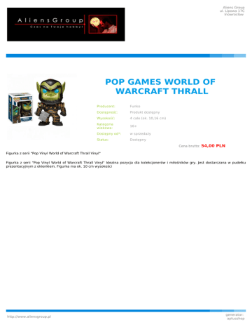 Aliens Group ul. Lipowa 17C Inowrocław POP GAMES WORLD OF WARCRAFT THRALL Producent: Funko Dostępność: Produkt dostępny Wysokość: 4 cale (ok. 10,16 cm) Kategoria wiekowa: 16+ Dostępny od*: w sprzedaży Status: Dostępny Cena brutto: 54,00 PLN Figurka z serii "Pop Vinyl World of Warcraft Thrall Vinyl" Figurka z serii "Pop Vinyl World of Warcraft Thrall Vinyl" Idealna pozycja dla kolekcjonerów i miłośników gry. Jest dostarczana w pudełku prezentacyjnym z okienkiem. Figurka ma ok. 10 cm wysokości http://www.aliensgroup.pl generator: aptusshop