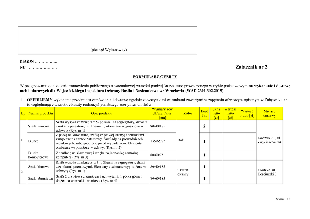 (pieczęć Wykonawcy) REGON …………….. NIP …………………. Załącznik nr 2 FORMULARZ OFERTY W postępowaniu o udzielenie zamówienia publicznego o szacunkowej wartości poniżej 30 tys. euro prowadzonego w trybie podstawowym na wykonanie i dostawę mebli biurowych dla Wojewódzkiego Inspektora Ochrony Roślin i Nasiennictwa we Wrocławiu (WAD.2601.302.2015) 1. OFERUJEMY wykonanie przedmiotu zamówienia i dostawę zgodnie ze wszystkimi warunkami zawartymi w zapytaniu ofertowym opisanym w Załączniku nr 1 (uwzględniające wszystkie koszty realizacji) poniższego asortymentu i ilości: Lp Nazwa produktu Szafa wysoka zamknięta z 5- półkami na segregatory, drzwi z zamkami patentowymi. Elementy otwierane wyposażone w uchwyty (Rys. nr 1) Z półką na klawiaturę, szafką (z prawej strony) i szufladami zamykane na zamek patentowy. Szuflady na prowadnicach Biurko metalowych, zabezpieczone przed wypadaniem. Elementy otwierane wyposażone w uchwyt (Rys. nr 2) Biurko Z szufladą na klawiaturę i wnęką na jednostkę centralną komputerowe komputera (Rys. nr 3) Szafa wysoka zamknięta z 5- półkami na segregatory, drzwi Szafa biurowa z zamkami patentowymi. Elementy otwierane wyposażone w uchwyty (Rys. nr 1) Szafa 2 drzwiowa z zamkiem i uchwytami, 1 półka górna i Szafa ubraniowa drążek na wieszaki ubraniowe (Rys. nr 4) Szafa biurowa 1. 2. Opis produktu Wymiary zew. dł./szer./wys. [cm] Kolor Buk 80/60/185 Wartość Wartość netto brutto [zł] [zł] Miejsce dostawy 1 Lwówek Śl., ul Zwycięzców 24 1 80/60/75 80/40/185 Cena netto [zł] 2 80/40/185 135/65/75 Ilość Szt. Orzech ciemny 1 Kłodzko, ul. Kościuszki 3 1 Strona 1 z 6 Lp Nazwa produktu Szafa biurowa 2/3 Biurko komputerowe 3. Regał 2/3 zamknięty z półkami na segregatory, drzwi z zamkami patentowymi. Elementy otwierane wyposażone w uchwyt. Z szufladą na klawiaturę i wnęką na jednostkę centralną komputera (Rys. nr 3) Wymiary zew. dł./szer./wys. [cm] Kolor Ilość Szt. 80/40/110 1 80/65/75 1 Półka regał ścienny Półka wisząca otwarta z bokami 120/30/35 2 Kontenerek mobilny Kontener na kółkach z 4 szufladami na prowadnicach metalowych, zabezpieczone przed wypadaniem z zamkiem (patentowym) centralnym oraz uchwytami (Rys. nr 9) 45/50/70 1 Biurko Biurko proste z półką na klawiaturę (Rys. nr 14) 140/65/75 Przystawka Biurko Wieszak Szafa biurowa 4. Opis produktu Szafa biurowa Szafa Przystawka półokrągła na 1 nodze stalowej dostawiana do 2 biurek opisanych poniżej. Z półką na klawiaturę z szafką (z prawej strony) i szufladami zamykane na zamek patentowy. Szuflady na prowadnicach metalowych, zabezpieczone przed wypadaniem. Elementy otwierane wyposażone w uchwyty (Rys. 2) Wieszak z 4-wieszakami (Rys. nr 6) Klon Vancouver 1 130/50 135/65/75 2 60/20/140 1 Szafa na segregatory zakryta z 5 półkami, drzwi z zamkiem patentowym, drzwi wyposażone w uchwyty. (Rys. nr 1) + 80/40/185 Nadstawka na 2 półki segregatorów Szafa wąska na segregatory, zakryta z 5 półkami, drzwi z zamkiem wyposażone w uchwyty. + Nadstawka o wysokości 40/40/185 45cm Regał z półkami 3 górne otwarte, 2 dolne zamknięte z zamkiem patentowym, drzwi wyposażone w uchwyty. (Rys. 80/40/185 nr 5). Nadstawka o wysokości 45 cm. Cena netto [zł] Wartość Wartość netto brutto [zł] [zł] Miejsce dostawy Oddział Wrocław ul. Zwycięska 4 2 Olcha górska 1 Ząbkowice ul. 1-go Maja 15D 1 Strona 2 z 6 Lp Nazwa produktu Biurko z podstawką na monitor Regał niski 5. Kontenerek mobilny Z półką na klawiaturę z szafką i szufladami zamykane na zamek patentowy. Szuflady zamykane na prowadnicach metalowych, zabezpieczone przed wypadaniem. Elementy otwierane wyposażone w uchwyt + podstawka pod monitor o wymiarach 21/26/20 (Rys. nr 2) Szafka na segregatory z 2 drzwiami przesuwnymi z zamkiem patentowym i uchwytami (Rys. nr 7) Kontener z 3 szufladami zamykanymi na zamek patentowy. Szuflady na prowadnicach metalowych, zabezpieczone przed wypadaniem z uchwytami. (Rys. nr 9) Stolik narożny Stolik do biurka 1/4 koła (Rys. nr 8) Biurko komputerowe Biurko z półką na klawiaturę i półką na na jednostkę centralną komputera (Rys. nr 3) Komoda z 3 szufladami po prawej stronie (na prowadnicach metalowych, zabezpieczonych przed wypadaniem), w środku szafka z 2 półkami zakryta, po lewej stronie półki narożnikowe otwarte zaokrąglone (Rys. 11) Szafka łącznik 6. Opis produktu Wymiary zew. dł./szer./wys. [cm] Kolor Ilość Szt. 135/65/75 2 130/40/120 1 65/40/45 Klon naturalny 1 60/60/75 1 120/60/75 1 130/45/75 1 Regał z drzwiami przesuwnymi Szafa z drzwiami przesuwnymi z 5 półkami na segregatory zamykany na zamek patentowy + uchwyty (Rys. nr 10) 130/40/185 1 Regał wysoki Szafa z 5 półkami na segregatory, 2 dolne półki zamykane na zamek patentowy + uchwyty, 3 górne otwarte. (Rys.nr 5) 80/40/185 2 Szafka mała Szafka z 2 półkami zamykane, 2 drzwi z uchwytami 80/40/75 Szafka Szafka z 2 półkami z 1 drzwiami i uchwytem 40/40/75 1 Biurko komputerowe Z szufladą na klawiaturę i półką na jednostkę centralną komputera (Rys. nr 3) 80/65/75 1 Limba 1 Cena netto [zł] Wartość Wartość netto brutto [zł] [zł] Miejsce dostawy Wałbrzych, ul. Słowackiego 23D Świdnica Śl. ul. Wałbrzyska 2527 Strona 3 z 6 Wymiary zew. dł./szer./wys. [cm] Opis produktu Komoda 3części. Komoda z 3 szufladami po lewej stronie (na prowadnicach metalowych, zabezpieczonych przed wypadaniem), w środku szafka z 2 półkami zakrytymi, po prawej stronie półki narożnikowe otwarte zaokrąglone (Rys. 11) 130/40/750 1 Wieszak Typu płotek z 4 haczykami z półką na górze (Rys. nr 6) 65/25/140 1 140/110/65/75 1 80/35/75 1 45/50/70 1 Biurko Regal aktowy niski Kontenerek mobilny Szafa aktowa 7. Szafa aktowa wysoka Szafa aktowa 8. Biurko z 2 części ustawione w kształcie litery "L" z dostawką opisaną poniżej po prawej stronie, wnętrze blatu zaokrąglone (Rys. nr 12) Dostawka do biurka - szafka na segregatory z 2 półkami z drzwiami p
