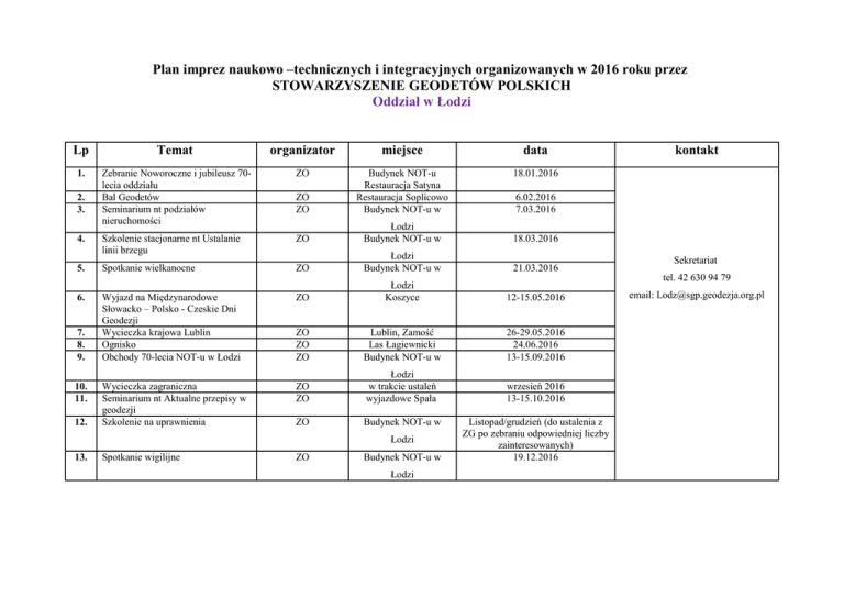 Plan imprez naukowo –technicznych i integracyjnych organizowanych w 2016 roku przez STOWARZYSZENIE GEODETÓW POLSKICH Oddział w Łodzi Lp Temat organizator miejsce data 1. Zebranie Noworoczne i jubileusz 70lecia oddziału Bal Geodetów Seminarium nt podziałów nieruchomości ZO 18.01.2016 ZO ZO Budynek NOT-u Restauracja Satyna Restauracja Soplicowo Budynek NOT-u w 4. Szkolenie stacjonarne nt Ustalanie linii brzegu ZO Łodzi Budynek NOT-u w 18.03.2016 5. Spotkanie wielkanocne ZO Łodzi Budynek NOT-u w 21.03.2016 Wyjazd na Międzynarodowe Słowacko – Polsko - Czeskie Dni Geodezji Wycieczka krajowa Lublin Ognisko Obchody 70-lecia NOT-u w Łodzi ZO Łodzi Koszyce 12-15.05.2016 ZO ZO ZO Lublin, Zamość Las Łagiewnicki Budynek NOT-u w 26-29.05.2016 24.06.2016 13-15.09.2016 Wycieczka zagraniczna Seminarium nt Aktualne przepisy w geodezji Szkolenie na uprawnienia ZO ZO Łodzi w trakcie ustaleń wyjazdowe Spała wrzesień 2016 13-15.10.2016 ZO Budynek NOT-u w 2. 3. 6. 7. 8. 9. 10. 11. 12. Łodzi 13. Spotkanie wigilijne ZO Budynek NOT-u w Łodzi kontakt 6.02.2016 7.03.2016 Listopad/grudzień (do ustalenia z ZG po zebraniu odpowiedniej liczby zainteresowanych) 19.12.2016 Sekretariat tel. 42 630 94 79 email: [email protected]