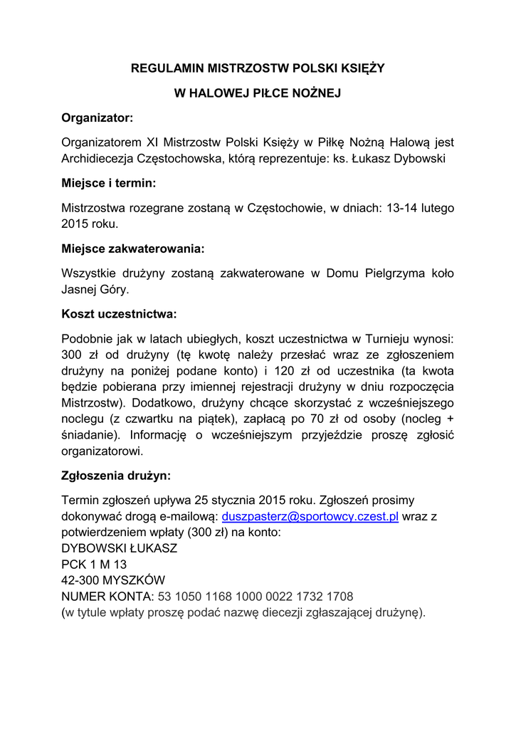 REGULAMIN MISTRZOSTW POLSKI KSIĘŻY W HALOWEJ PIŁCE NOŻNEJ Organizator: Organizatorem XI Mistrzostw Polski Księży w Piłkę Nożną Halową jest Archidiecezja Częstochowska, którą reprezentuje: ks. Łukasz Dybowski Miejsce i termin: Mistrzostwa rozegrane zostaną w Częstochowie, w dniach: 13-14 lutego 2015 roku. Miejsce zakwaterowania: Wszystkie drużyny zostaną zakwaterowane w Domu Pielgrzyma koło Jasnej Góry. Koszt uczestnictwa: Podobnie jak w latach ubiegłych, koszt uczestnictwa w Turnieju wynosi: 300 zł od drużyny (tę kwotę należy przesłać wraz ze zgłoszeniem drużyny na poniżej podane konto) i 120 zł od uczestnika (ta kwota będzie pobierana przy imiennej rejestracji drużyny w dniu rozpoczęcia Mistrzostw). Dodatkowo, drużyny chcące skorzystać z wcześniejszego noclegu (z czwartku na piątek), zapłacą po 70 zł od osoby (nocleg + śniadanie). Informację o wcześniejszym przyjeździe proszę zgłosić organizatorowi. Zgłoszenia drużyn: Termin zgłoszeń upływa 25 stycznia 2015 roku. Zgłoszeń prosimy dokonywać drogą e-mailową: [email protected] wraz z potwierdzeniem wpłaty (300 zł) na konto: DYBOWSKI ŁUKASZ PCK 1 M 13 42-300 MYSZKÓW NUMER KONTA: 53 1050 1168 1000 0022 1732 1708 (w tytule wpłaty proszę podać nazwę diecezji zgłaszającej drużynę). System rozgrywek: Ostateczna wersja systemu rozgrywek będzie uzależniona od ilości zgłoszonych do turnieju drużyn. Drużyny rozgrywają mecze „każdy z każdym” w czterech grupach, składających się z 4-5 zespołów. Rozstawione będą cztery drużyny: gospodarz turnieju oraz trzy drużyny, które zajęły najlepsze miejsca na ostatnich mistrzostwach. Po rozegraniu meczów grupowych awans do ćwierćfinału uzyskają po dwie najlepsze drużyny z każdej grupy. O kolejności drużyn w rozgrywkach grupowych zadecydują: a) Ilość zdobytych punktów (za zwycięstwo 3 pkt., za remis 1 pkt., za porażkę 0 pkt.) b) Wynik bezpośredniego meczu (tzw. „mała tabela” pomiędzy zainteresowanymi drużynami) c) Korzystniejsza różnica bramek d) Przy dalszej równości większa ilość bramek zdobytych W parach ćwierćfinałowych spotkają się (system pucharowy): 1. Zwycięzca grupy A – druga drużyna z grupy C 2. Zwycięzca grupy B – druga drużyna z grupy D 3. Zwycięzca grupy C – druga drużyna z grupy A 4. Zwycięzca grupy D - druga drużyna z grupy B Zwycięzcy utworzą pary półfinałowe systemem: I. Zwycięzca 2) – zwycięzca 3); II. Zwycięzca 1) – zwycięzca 4) Pokonani w półfinałach spotykają się w meczu o trzecie miejsce, natomiast zwycięzcy półfinałów zagrają w meczu finałowym o pierwsze miejsce. Przewidziane są również nagrody dla: - każdej drużyny startującej w zawodach - zawodnika, która zdobył najwięcej bramek w Mistrzostwach - najlepszego zawodnika turnieju (MVP) - najlepszego bramkarza - nagrody okolicznościowe. Uczestnicy: W Mistrzostwach biorą udział drużyny reprezentujące poszczególne diecezje. Nie mogą więc m.in. wziąć udziału drużyny połączone, w składach których byliby kapłani z różnych diecezji. Każdą diecezję reprezentuje tylko jedna drużyna, którą przedstawia Diecezjalny Duszpasterz Sportowców (lub jego delegat). Do całych Mistrzostw drużyna diecezjalna może zgłosić maksymalnie 12 zawodników – do każdego meczu do protokołu maksymalnie 10 zawodników. W Mistrzostwach mogą uczestniczyć kapłani inkardynowani do danej diecezji i kapłani zakonni, pełniący aktualnie, na mocy dekretu Przełożonych, funkcje duszpasterskie na terenie danej diecezji. Liczba kapłanów zakonnych zgłoszonych do zespołu nie może przekroczyć 50% drużyny. W trakcie rozgrywek wszyscy zawodnicy zobowiązani są do posiadania dokumentów tożsamości oraz legitymacji kapłańskiej celem przedstawienia drużynie przeciwnej bądź Organizatorom. Drużyny przystępujące do rozgrywek zobowiązane są przed rozpoczęciem dostarczyć podpisane listy zgłoszeniowe wraz z podpisami zawodników dotyczące ponoszenia pełnej odpowiedzialności za zdarzenia wynikłe podczas zawodów (każdy indywidualnie ubezpiecza się od następstw nieszczęśliwych wypadków) oraz oświadczenia, gdzie potwierdzają swoją dobrą dyspozycję zdrowotną. Osoby uczestniczące w rozgrywkach wyrażają zgodę na udostępnianie danych osobowych na potrzeby organizacji rozgrywek oraz umieszczanie danych na stronie internetowej w celu informacyjnym. Przystąpienie do rozgrywek jest równoznaczne z zaakceptowaniem regulaminu rozgrywek. Kierownicy drużyn zobowiązani są przed zawodami do czytelnego wpisania imion i nazwisk (drukowanymi literami) swoich zawodników do protokołu, zgodnie z numerami na koszulkach. Losowanie: Na zebraniu rady kapitanów drużyn ustalono, że losowanie drużyn do fazy grupowej rozgrywek powinno się odbywać po przyjeździe wszystkich drużyn do miejsca Mistrzostw (pół godziny przed inauguracją imprezy). Ubiór zawodników: Zawodnik nie może mieć na sobie podczas gry niczego, co mogłoby w jakikolwiek sposób zagrażać bezpieczeństwu innych zawodników (dozwolone są medaliki). Drużyny biorące udział w rozgrywkach zobowiązane są do występowania w jednolitych koszulkach (Organizator zapewnia koszulki treningowe), przy czym bramkarz musi różnić się ubiorem od pozostałych zawodników. Drużyny zobowiązane są do posiadania własnego obuwia przystosowanego do gry na hali sportowej. Kapitan drużyny powinien posiadać opaskę na ramieniu wskazującą na jego funkcję. Przepisy gry – futsal: Boisko – długość ok. 40 m, a szerokość ok. 20 m. Pole bramkowe – jak do piłki ręcznej Piłka – przystosowana do gry na hali Pole karne – punkt karny w odległości 6 m od środka linii bramkowej, a drugi punkt karny w odległości 10 m. Strefa zmian - jest usytuowana na tej samej stronie gry, co ławki zawodników rezerwowych i bezpośrednio przed nimi. W obrębie tej strefy zawodnicy wchodzą i schodzą