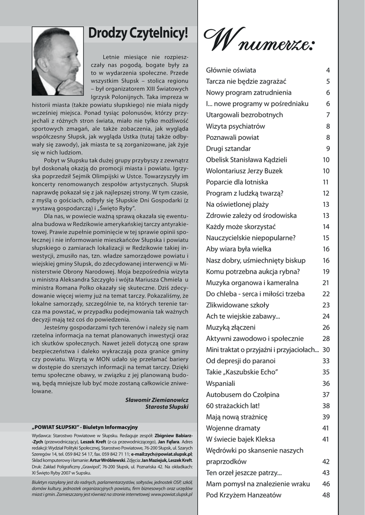 Drodzy Czytelnicy! Letnie miesiące nie rozpieszczały nas pogodą, bogate były za to w wydarzenia społeczne. Przede wszystkim Słupsk – stolica regionu – był organizatorem XIII Światowych Igrzysk Polonijnych. Taka impreza w historii miasta (także powiatu słupskiego) nie miała nigdy wcześniej miejsca. Ponad tysiąc polonusów, którzy przyjechali z różnych stron świata, miało nie tylko możliwość sportowych zmagań, ale także zobaczenia, jak wygląda współczesny Słupsk, jak wygląda Ustka (tutaj także odbywały się zawody), jak miasta te są zorganizowane, jak żyje się w nich ludziom. Pobyt w Słupsku tak dużej grupy przybyszy z zewnątrz był doskonałą okazją do promocji miasta i powiatu. Igrzyska poprzedził Sejmik Olimpijski w Ustce. Towarzyszyły im koncerty renomowanych zespołów artystycznych. Słupsk naprawdę pokazał się z jak najlepszej strony. W tym czasie, z myślą o gościach, odbyły się Słupskie Dni Gospodarki (z wystawą gospodarczą) i „Święto Ryby”. Dla nas, w powiecie ważną sprawą okazała się ewentualna budowa w Redzikowie amerykańskiej tarczy antyrakietowej. Prawie zupełnie pominięcie w tej sprawie opinii społecznej i nie informowanie mieszkańców Słupska i powiatu słupskiego o zamiarach lokalizacji w Redzikowie takiej inwestycji, zmusiło nas, tzn. władze samorządowe powiatu i wiejskiej gminy Słupsk, do zdecydowanej interwencji w Ministerstwie Obrony Narodowej. Moja bezpośrednia wizyta u ministra Aleksandra Szczygło i wójta Mariusza Chmiela u ministra Romana Polko okazały się skuteczne. Dziś zdecydowanie więcej wiemy już na temat tarczy. Pokazaliśmy, że lokalne samorządy, szczególnie te, na których terenie tarcza ma powstać, w przypadku podejmowania tak ważnych decyzji mają też coś do powiedzenia. Jesteśmy gospodarzami tych terenów i należy się nam rzetelna informacja na temat planowanych inwestycji oraz ich skutków społecznych. Nawet jeżeli dotyczą one spraw bezpieczeństwa i daleko wykraczają poza granice gminy czy powiatu. Wizytą w MON udało się przełamać bariery w dostępie do szerszych informacji na temat tarczy. Dzięki temu społeczne obawy, w związku z jej planowaną budową, będą mniejsze lub być może zostaną całkowicie zniwelowane. Sławomir Ziemianowicz Starosta Słupski W numerze: Głównie oświata 4 Tarcza nie będzie zagrażać 5 Nowy program zatrudnienia 6 I... nowe programy w pośredniaku 6 Utargowali bezrobotnych 7 Wizyta psychiatrów 8 Poznawali powiat 8 Drugi sztandar 9 Obelisk Stanisława Kądzieli 10 Wolontariusz Jerzy Buzek 10 Poparcie dla lotniska 11 Program z ludzką twarzą? 12 Na oświetlonej plaży 13 Zdrowie zależy od środowiska 13 Każdy może skorzystać 14 Nauczycielskie niepopularne? 15 Aby wiara była wielka 16 Nasz dobry, uśmiechnięty biskup 16 Komu potrzebna aukcja rybna? 19 Muzyka organowa i kameralna 21 Do chleba - serca i miłości trzeba 22 Zlikwidowane szkoły 23 Ach te wiejskie zabawy... 24 Muzyką złączeni 26 Aktywni zawodowo i społecznie 28 Mini traktat o przyjaźni i przyjaciołach... 30 Od depresji do paranoi 33 Takie „Kaszubskie Echo” 35 Wspaniali 36 Autobusem do Czołpina 37 60 strażackich lat! 38 Mają nową strażnicę 39 „POWIAT SŁUPSKI” - Biuletyn Informacyjny Wojenne dramaty 41 Wydawca: Starostwo Powiatowe w Słupsku. Redaguje zespół: Zbigniew Babiarz-Zych (przewodniczący), Leszek Kreft (z-ca przewodniczącego), Jan Fąfara. Adres redakcji: Wydział Polityki Społecznej, Starostwo Powiatowe, 76-200 Słupsk, ul. Szarych Szeregów 14, tel. 059 842 54 17, fax. 059 842 71 11; e-mail:[email protected]; Skład komputerowy i łamanie: Artur Wróblewski. Zdjęcia: Jan Maziejuk, Leszek Kreft. Druk: Zakład Poligraficzny „Grawipol”, 76-200 Słupsk, ul. Poznańska 42. Na okładkach: XI Święto Ryby 2007 w Supsku. W świecie bajek Kleksa 41 Biuletyn rozsyłany jest do radnych, parlamentarzystów, sołtysów, jednostek OSP, szkół, domów kultury, jednostek organizacyjnych powiatu, firm biznesowych oraz urzędów miast i gmin. Zamieszczany jest również na stronie internetowej: www.powiat.slupsk.pl Wędrówki po skansenie naszych praprzodków 42 Ten orzeł jeszcze patrzy... 43 Mam pomysł na znalezienie wraku 46 Pod Krzyżem Hanzeatów 48 Fot. J. Maziejuk Głównie oświata z prac zarządu W okresie od czerwcowej do sierpniowej sesji Zarząd Powiatu Słupskiego przedłożył komisjom jedenaście projektów uchwał Rady Powiatu. Do każdego z projektów dołączono uzasadnienie. Projekty te były szczegółowo analizowane na posiedzeniach komisji. 4 Większość uchwał dotyczyła spraw oświatowych, w tym likwidacji szkół ponadgimnazjalnych, do których nie było naboru lub nabór ten był zbyt mały. Zdecydowano o likwidacji: Liceum Ogólnokształcącego i Liceum Profilowanego wchodzących w skład Zespołu Szkół Leśnych i Ogólnokształcących im. prof. Stanisława Sokołowskiego w Warcinie (tym samym o zmianie nazwy szkoły na Zespół Szkół Leśnych im. prof. Stanisława Sokołowskiego w Warcinie), II Liceum Profilowanego wchodzącego w skład Zespołu Szkół Ogólnokształcących im. Mikołaja Kopernika w Ustce, I Liceum Profilowanego wchodzącego w skład Zespołu Szkół Technicznych w Ustce, Szkoły Policealnej wchodzącej w skład Zespołu Szkół Technicznych w Ustce, Zasadniczej Szkoły Zawodowej Specjalnej wchodzącej w skład Specjalnego Ośrodka Szkolno-Wychowawczego im. Marynarza Polskiego w Damnicy i Technikum Uzupełniającego dla Dorosłych Nr 6 wchodzącego w skład Zespołu Szkół Agrotechnicznych im. Władysława Reymonta w Słupsku. W kolejnym projekcie Zarząd dokonał też zmian porządkowych we wcześniejszej uchwale w sprawie ustalenia regulaminu przyznawania nagród ze specjalnego funduszu POWIAT SŁUPSKI NR 8-9 (77-78) • LIPIEC - SIERPIEŃ 2007 dla nauczycieli i placówek powiatu słupskiego. W innych zdecydował również o zmianach w budżecie powiatu na 2007 rok i pr