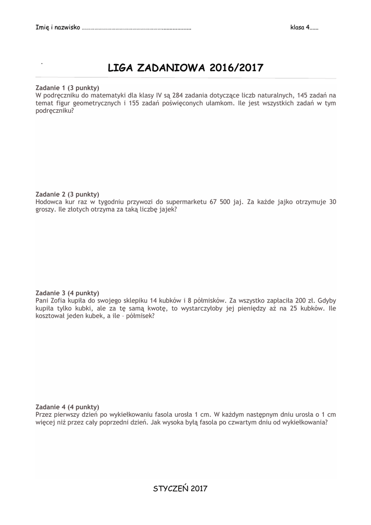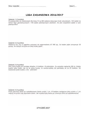 Imię i nazwisko …………………………………………………................... klasa 4...... LIGA ZADANIOWA 2016/2017 Zadanie 1 (3 punkty) W podręczniku do matematyki dla klasy IV są 284 zadania dotyczące liczb naturalnych, 145 zadań na temat figur geometrycznych i 155 zadań poświęconych ułamkom. Ile jest wszystkich zadań w tym podręczniku? Zadanie 2 (3 punkty) Hodowca kur raz w tygodniu przywozi do supermarketu 67 500 jaj. Za każde jajko otrzymuje 30 groszy. Ile złotych otrzyma za taką liczbę jajek? Zadanie 3 (4 punkty) Pani Zofia kupiła do swojego sklepiku 14 kubków i 8 półmisków. Za wszystko zapłaciła 200 zł. Gdyby kupiła tylko kubki, ale za tę samą kwotę, to wystarczyłoby jej pieniędzy aż na 25 kubków. Ile kosztował jeden kubek, a ile – półmisek? Zadanie 4 (4 punkty) Przez pierwszy dzień po wykiełkowaniu fasola urosła 1 cm. W każdym następnym dniu urosła o 1 cm więcej niż przez cały poprzedni dzień. Jak wysoka byłą fasola po czwartym dniu od wykiełkowania? STYCZEŃ 2017 Imię i nazwisko …………………………………………………................... klasa 4...... Zadanie 5 (5 punktów) Liczba jest sześciocyfrowa. Cyfra jedności dzieli się przez 8 z resztą 1. Cyfra dziesiątek jest od niej trzy razy mniejsza, a cyfra setek – o 8 mniejsza od cyfry jedności. Suma cyfry setek tysięcy i cyfry setek wynosi 7, a suma cyfry tysięcy i cyfry setek tysięcy jest równa sumie dziesiątek i jedności. Ile wynosi cyfra dziesiątek tysięcy, jeżeli jest pięć razy mniejsza od sumy pozostałych cyfr? Zapisz cyframi opisaną liczbę. Zad 6 (3pkt) Ola ma 142 cm wzrostu. Bartek jest od niej o 14 cm niższy, a Kuba jest o 5 cm wyższy od Bartka. O ile centymetrów Ola jest wyższa od Kuby? Zad 7 (4pkt) Jacek otrzymał zestaw 87 zadań konkursowych. Postanowił przygotować się do konkursu, rozwiązując codziennie taką samą liczbę zadań. Czy jest to możliwe, jeżeli na rozwiązanie wszystkich zadań z zestawu chłopiec ma 14 dni? Uzasadnij odpowiedź. Zad 8 (4pkt) Aby dotrzeć do szkoły, Kuba najpierw idzie 200 m na przystanek, potem jedzie 2 km 900 m autobusem, a od przystanku do szkoły musi jeszcze przejść 300 m. Jarek pokonuje pieszo 900 m do domu dziadka, który podwozi go do szkoły samochodem. Dom dziadka znajduje się w odległości 2 km 900 m od szkoły. Który z chłopców ma dalej do szkoły i o ile? STYCZEŃ 2017