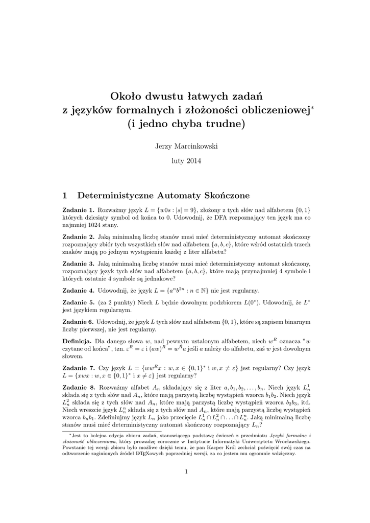 ∗ Jest to kolejna edycja zbioru zadań, stanowiącego podstawę ćwiczeń z przedmiotu Języki formalne i