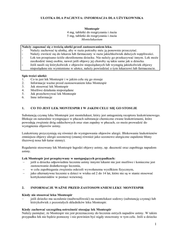 ULOTKA DLA PACJENTA: INFORMACJA DLA UŻYTKOWNIKA Montespir 4 mg, tabletki do rozgryzania i żucia 5 mg, tabletki do rozgryzania i żucia Montelukastum Należy zapoznać się z treścią ulotki przed zastosowaniem leku. Należy zachować tę ulotkę, aby w razie potrzeby móc ją ponownie przeczytać. Należy zwrócić się do lekarza lub farmaceuty w razie jakichkolwiek dalszych wątpliwości. Lek ten przepisano ściśle określonemu dziecku. Nie należy go przekazywać innym. Lek może zaszkodzić innej osobie, nawet jeśli objawy jej choroby są takie same jak u dziecka. Jeśli nasili się którykolwiek z objawów niepożądanych lub wystąpią jakiekolwiek objawy niepożądane nie wymienione w ulotce, należy powiedzieć o tym lekarzowi lub farmaceucie. Spis treści ulotki: 1. Co to jest lek Montespir i w jakim celu się go stosuje 2. Informacje ważne przed zastosowaniem leku Montespir 3. Jak stosować lek Montespir 4. Możliwe działania niepożądane 5. Jak przechowywać lek Montespir 6. Inne informacje 1. CO TO JEST LEK MONTESPIR I W JAKIM CELU SIĘ GO STOSUJE Substancją czynną leku Montespir jest montelukast, który jest antagonistą receptora leukotrienowego. Blokuje on naturalnie występujące w płucach substancje chemiczne zwane leukotrienami, które powodują zwężenie dróg oddechowych oraz stan zapalny w płucach, co może prowadzić do wystąpienia objawów astmy. Leukotrieny przyczyniają się również do występowania objawów alergii. Blokowanie leukotrienów zmniejsza objawy alergii sezonowej (znanej również jako sezonowe alergiczne zapalenie błony śluzowej nosa lub katar sienny). Regularnie stosowany lek Montespir łagodzi objawy astmy, np. duszność oraz zapobiega napadom astmy. Lek Montespir jest przepisywany w następujących przypadkach: jeśli u dziecka odpowiednie leczenie astmy innymi lekami nie jest możliwe i konieczne jest zastosowanie dodatkowego leczenia, w celu zapobiegania zwężeniu oskrzeli wywołanemu wysiłkiem fizycznym, jako alternatywne leczenie u dzieci w wieku od 2 do 14 lat, które nie są w stanie stosować kortykosteroidów w postaci wziewnej. 2. INFORMACJE WAŻNE PRZED ZASTOSOWANIEM LEKU MONTESPIR Kiedy nie stosować leku Montespir jeśli dziecko ma uczulenie (nadwrażliwość) na montelukast sodowy (substancję czynną) lub którykolwiek z pozostałych składników leku Montespir. Kiedy zachować szczególną ostrożność stosując lek Montespir Należy pamiętać, że Montespir nie jest przeznaczony do leczenia ostrych napadów astmy. W takim przypadku lek nie będzie pomocny i nie powinien być nigdy stosowany w tym celu. Jeśli u dziecka 1 wystąpi napad astmy, należy podać mu lek przeznaczony do stosowania w tego rodzaju nagłych przypadkach i postępować ściśle według zaleceń podanych przez lekarza. Bardzo ważne jest, aby zawsze był łatwo dostępny lek do stosowania w razie napadu astmy (tj. krótko działający betaagonista w postaci wziewnej, zwany również lekiem rozszerzającym oskrzela, w inhalatorze). Jeśli u dziecka konieczne jest stosowanie beta-agonisty w postaci wziewnej częściej niż zazwyczaj, należy jak najszybciej skonsultować się z lekarzem. Ważne jest, aby dziecko przyjmowało wszystkie leki przeciwko astmie przepisane przez lekarza. Lekiem Montespir nie należy zastępować stosowanych przez dziecko leków steroidowych (wziewnych lub stosowanych doustnie). Ponadto należy powiadomić lekarza, jeśli podczas przyjmowania leku Montespir wystąpi u dziecka którykolwiek z następujących objawów: objawy grypopodobne, zaburzenia czuciowe, takie jak uczucie kłucia i mrowienia rąk lub nóg, wysypka skórna, obrzęk okolicy twarzy, warg, języka i (lub) gardła, który powoduje duszność lub trudności w połykaniu. Lekarz zdecyduje o dalszym postępowaniu. Pacjentom z astmą aspirynową, przyjmującym lek Montespir, nie wolno w dalszym ciągu stosować kwasu acetylosalicylowego ani innych niesteroidowych leków przeciwzapalnych. Stosowanie innych leków Należy powiedzieć lekarzowi o wszystkich przyjmowanych ostatnio lekach, również tych, które wydawane są bez recepty. Lek Montespir może być stosowany jednocześnie z innymi lekami stosowanymi w leczeniu astmy. Jednakże niektóre leki mogą wpływać na działanie leku Montespir i odwrotnie, lek Montespir może wpływać na działanie niektórych leków. Może to prowadzić do wystąpienia interakcji. Ważne jest, aby powiedzieć lekarzowi o wszystkich przyjmowanych obecnie lub ostatnio lekach, również tych, które wydawane są bez recepty. Szczególnie ważne jest, aby poinformować lekarza o przyjmowaniu przez dziecko fenobarbitalu lub fenytoiny (leki stosowane w leczeniu padaczki) lub ryfampicyny (lek stosowany w leczeniu gruźlicy i niektórych innych zakażeń). W takim przypadku należy zachować ostrożność, szczególnie u dzieci. Stosowanie leku Montespir z jedzeniem i piciem Montespir należy przyjmować 1 godzinę przed posiłkiem lub 2 godziny po posiłku. Ciąża i karmienie piersią Przed zastosowaniem jakiegokolwiek leku należy poradzić się lekarza lub farmaceuty. Ograniczone dane dotyczące stosowania leku w okresie ciąży nie wskazują na istnienie związku przyczynowego pomiędzy przyjmowaniem montelukastu a występowaniem wad rozwojowych (np. wad kończyn), które rzadko opisywano na całym świecie po wprowadzeniu leku do obrotu. Jeśli pacjentka podejrzewa, że jest w ciąży, powinna skonsultować się z lekarzem przed zastosowaniem leku Montespir. Nie wiadomo, czy Montespir przenika do mleka kobiecego. Dlatego jeśli pacjentka karmi piersią lub zamierza karmić piersią, powinna skonsultować się z lekarzem przed zastosowaniem leku Montespir. Lekarz omówi z pacjentką dalsze postępowanie. Dzieci i młodzież Dzieci w wieku poniżej 2 lat nie mogą stosować leku Montespir. Lek Montespir w dawce 4 mg jest przeznaczony do stosowania u dzieci w wieku od 2 do 5 lat. Lek Montespir w dawce 5 mg jest przeznac