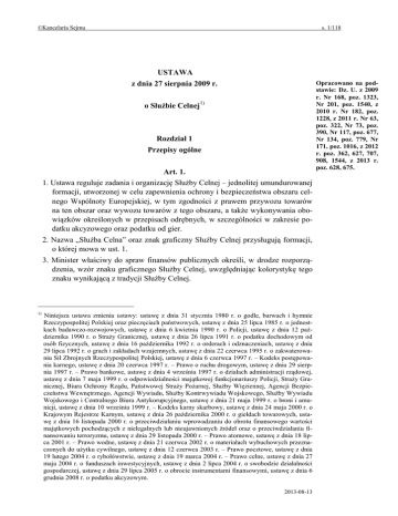 ©Kancelaria Sejmu s. 1/118 USTAWA z dnia 27 sierpnia 2009 r. o Służbie Celnej 1) Rozdział 1 Przepisy ogólne Art. 1. 1. Ustawa reguluje zadania i organizację Służby Celnej – jednolitej umundurowanej formacji, utworzonej w celu zapewnienia ochrony i bezpieczeństwa obszaru celnego Wspólnoty Europejskiej, w tym zgodności z prawem przywozu towarów na ten obszar oraz wywozu towarów z tego obszaru, a także wykonywania obowiązków określonych w przepisach odrębnych, w szczególności w zakresie podatku akcyzowego oraz podatku od gier. 2. Nazwa „Służba Celna” oraz znak graficzny Służby Celnej przysługują formacji, o której mowa w ust. 1. 3. Minister właściwy do spraw finansów publicznych określi, w drodze rozporządzenia, wzór znaku graficznego Służby Celnej, uwzględniając kolorystykę tego znaku wynikającą z tradycji Służby Celnej. 1) Niniejsza ustawa zmienia ustawy: ustawę z dnia 31 stycznia 1980 r. o godle, barwach i hymnie Rzeczypospolitej Polskiej oraz pieczęciach państwowych, ustawę z dnia 25 lipca 1985 r. o jednostkach badawczo-rozwojowych, ustawę z dnia 6 kwietnia 1990 r. o Policji, ustawę z dnia 12 października 1990 r. o Straży Granicznej, ustawę z dnia 26 lipca 1991 r. o podatku dochodowym od osób fizycznych, ustawę z dnia 16 października 1992 r. o orderach i odznaczeniach, ustawę z dnia 29 lipca 1992 r. o grach i zakładach wzajemnych, ustawę z dnia 22 czerwca 1995 r. o zakwaterowaniu Sił Zbrojnych Rzeczypospolitej Polskiej, ustawę z dnia 6 czerwca 1997 r. – Kodeks postępowania karnego, ustawę z dnia 20 czerwca 1997 r. – Prawo o ruchu drogowym, ustawę z dnia 29 sierpnia 1997 r. – Prawo bankowe, ustawę z dnia 4 września 1997 r. o działach administracji rządowej, ustawę z dnia 7 maja 1999 r. o odpowiedzialności majątkowej funkcjonariuszy Policji, Straży Granicznej, Biura Ochrony Rządu, Państwowej Straży Pożarnej, Służby Więziennej, Agencji Bezpieczeństwa Wewnętrznego, Agencji Wywiadu, Służby Kontrwywiadu Wojskowego, Służby Wywiadu Wojskowego i Centralnego Biura Antykorupcyjnego, ustawę z dnia 21 maja 1999 r. o broni i amunicji, ustawę z dnia 10 września 1999 r. – Kodeks karny skarbowy, ustawę z dnia 24 maja 2000 r. o Krajowym Rejestrze Karnym, ustawę z dnia 26 października 2000 r. o giełdach towarowych, ustawę z dnia 16 listopada 2000 r. o przeciwdziałaniu wprowadzaniu do obrotu finansowego wartości majątkowych pochodzących z nielegalnych lub nieujawnionych źródeł oraz o przeciwdziałaniu finansowaniu terroryzmu, ustawę z dnia 29 listopada 2000 r. – Prawo atomowe, ustawę z dnia 18 lipca 2001 r. – Prawo wodne, ustawę z dnia 21 czerwca 2002 r. o materiałach wybuchowych przeznaczonych do użytku cywilnego, ustawę z dnia 12 czerwca 2003 r. – Prawo pocztowe, ustawę z dnia 19 lutego 2004 r. o rybołówstwie, ustawę z dnia 19 marca 2004 r. – Prawo celne, ustawę z dnia 27 maja 2004 r. o funduszach inwestycyjnych, ustawę z dnia 2 lipca 2004 r. o swobodzie działalności gospodarczej, ustawę z dnia 29 lipca 2005 r. o obrocie instrumentami finansowymi, ustawę z dnia 6 grudnia 2008 r. o podatku akcyzowym. 2013-08-13 Opracowano na podstawie: Dz. U. z 2009 r. Nr 168, poz. 1323, Nr 201, poz. 1540, z 2010 r. Nr 182, poz. 1228, z 2011 r. Nr 63, poz. 322, Nr 73, poz. 390, Nr 117, poz. 677, Nr 134, poz. 779, Nr 171, poz. 1016, z 2012 r. poz. 362, 627, 707, 908, 1544, z 2013 r. poz. 628, 675. ©Kancelaria Sejmu s. 2/118 Art. 2. 1. Do zadań Służby Celnej należy realizacja polityki celnej w części dotyczącej przywozu i wywozu towarów oraz wykonywanie innych zadań wynikających z przepisów odrębnych, a w szczególności: 1) wykonywanie czynności związanych z nadawaniem towarom przeznaczenia celnego; 2) wymiar i pobór: a) należności celnych i innych opłat związanych z przywozem i wywozem towarów, b) podatku od towarów i usług z tytułu importu towarów, c) podatku akcyzowego, d) podatku od gier oraz dopłat, o których mowa w ustawie z dnia 19 listopada 2009 r. o grach hazardowych (Dz. U. Nr 201, poz. 1540), e) opłaty paliwowej, f) podatku od wydobycia niektórych kopalin; 3) wykonywanie zadań wynikających z przepisów wspólnotowych regulujących statystykę dotyczącą obrotu towarowego pomiędzy państwami członkowskimi Wspólnoty Europejskiej (INTRASTAT) oraz obrotu towarowego państw członkowskich Wspólnoty Europejskiej z pozostałymi państwami (EXTRASTAT); 4) rozpoznawanie, wykrywanie, zapobieganie i zwalczanie przestępstw i wykroczeń związanych z naruszeniem przepisów dotyczących wprowadzania na terytorium Rzeczypospolitej Polskiej oraz wyprowadzania z jej terytorium towarów objętych ograniczeniami lub zakazami obrotu ze względu na bezpieczeństwo i porządek publiczny lub bezpieczeństwo międzynarodowe, w szczególności takich jak odpady, substancje chemiczne i ich mieszaniny, materiały jądrowe i promieniotwórcze, środki odurzające i substancje psychotropowe, broń, amunicja, materiały wybuchowe oraz towary i technologie o znaczeniu strategicznym; 5) rozpoznawanie, wykrywanie, zapobieganie i zwalczanie przestępstw skarbowych i wykroczeń skarbowych oraz ściganie ich sprawców, w zakresie określonym w ustawie z dnia 10 września 1999 r. – Kodeks karny skarbowy (Dz. U. z 2007 r. Nr 111, poz. 765, z późn. zm. 2)), zwanej dalej „Kodeksem karnym skarbowym”; 6) rozpoznawanie, wykrywanie, zapobieganie i zwalczanie przestępstw i wykroczeń przeciwko: a) zdrowiu, określonych w art. 55, 57, 61 i 66 ustawy z dnia 29 lipca 2005 r. o przeciwdziałaniu narkomanii (Dz. U. Nr 179, poz. 1485, z późn. zm.3)), 2) 3) Zmiany tekstu jednolitego wymienionej ustawy zostały ogłoszone w Dz. U. z 2007 r. Nr 112, poz. 766, z 2008 r. Nr 66, poz. 410, Nr 215, poz. 1355 i Nr 237, poz. 1651 oraz z 2009 r. Nr 3, poz. 11, Nr 8, poz. 39 i Nr 157, poz. 1241. Zmiany wymienionej ustawy zostały ogłoszone w Dz. U. z 2006 r. Nr 66, poz. 469 i Nr 120, poz. 826