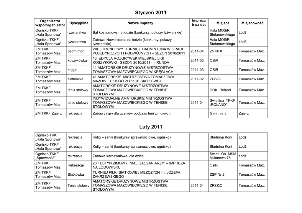 Styczeń 2011 Organizator współorganizator Ognisko TKKF „Hala Sportowa" Ognisko TKKF „Hala Sportowa" ZM TKKF Tomaszów Maz. ZM TKKF Tomaszów Maz. ZM TKKF Tomaszów Maz. ZM TKKF Tomaszów Maz. Dyscyplina łyżwiarstwo łyżwiarstwo badminton koszykówka kręgle siatkówka ZM TKKF Tomaszów Maz. tenis stołowy ZM TKKF Tomaszów Maz. tenis stołowy ZM TKKF Zgierz rekreacja Nazwa imprezy Impreza trwa do: Hala MOSiR Stefanowskiego Hala MOSiR Stefanowskiego Bal kostiumowy na lodzie (konkursy, pokazy łyżwiarskie) Zabawa Noworoczna na lodzie (konkursy, pokazy łyżwiarskie) WIELORUNDOWY TURNIEJ BADMINTONA W GRACH POJEDYNCZYCH I PODWÓJNYCH – SEZON 2010/2011 13. EDYCJA ROZGRYWEK MIEJSKIEJ LIGI KOSZYKÓWKI - SEZON 2010/2011 - II RUNDA 11.AMATORSKIE DRUŻYNOWE MISTRZOSTWA TOMASZOWA MAZOWIECKIEGO W KRĘGLACH 41.AMATORSKIE MISTRZOSTWA TOMASZOWA MAZOWIECKIEGO W PIŁCE SIATKOWEJ AMATORSKIE DRUŻYNOWE MISTRZOSTWA TOMASZOWA MAZOWIECKIEGO W TENISIE STOŁOWYM INDYWIDUALNE AMATORSKIE MISTRZOSTWA TOMASZOWA MAZOWIECKIEGO W TENISIE STOŁOWYM Miejsce Miejscowość Łódź Łódź 2011-04 ZS Nr 8 Tomaszów Maz. 2011-03 OSiR Tomaszów Maz. 2011-03 OSiR Tomaszów Maz. 2011-02 ZPSZiO Tomaszów Maz. DOK, Roland Tomaszów Maz. Świetlica TKKF „ROLAND” Tomaszów Maz. Gimn. nr 3 Zgierz 2011-04 Zabawy i gry dla uczniów podczas ferii zimowych Luty 2011 Ognisko TKKF „Hala Sportowa” Ognisko TKKF „Hala Sportowa” Ognisko TKKF „Sprawność” ZM TKKF Tomaszów Maz. ZM TKKF Tomaszów Maz. ZM TKKF Tomaszów Maz. rekreacja Kulig – sanki (konkursy sprawnościowe, ognisko) Stadnina Koni Łódź rekreacja Kulig – sanki (konkursy sprawnościowe, ognisko) Stadnina Koni Łódź rekreacja Zabawa karnawałowa dla dzieci Świetl. Os. MSM Łódź Milionowa 78 20.FESTYN ZIMOWY “BAL GAŁGANIARZY” – IMPREZA NA LODOWISKU TURNIEJ PIŁKI SIATKOWEJ MĘŻCZYZN im. JÓZEFA Siatkówka ZAKRZEWSKIEGO AMATORSKIE DRUŻYNOWE MISTRZOSTWA Tenis stołowy TOMASZOWA MAZOWIECKIEGO W TENISIE STOŁOWYM Rekreacja 2011-04 OsiR Tomaszów Maz. ZSP Nr 2 Tomaszów Maz. ZPSZiO Tomaszów Maz. Marzec 2011 Ognisko TKKF „Hala Sportowa" Ognisko TKKF „Sprawność" ZM TKKF Tomaszów Maz. ZM TKKF Zgierz łyżwiarstwo biegi kręgle tenis stołowy Święto Wiosny na lodzie (wybory łyżwiarzy sezonu 2010/2011 – 3 kat. wiekowe) Bieg po zdrowie – akcja prowadzona dla poprawy zdrowia dzieci i młodzieży oraz dorosłych 16. AMATORSKIE INDYWIDUALNE MISTRZOSTWA TOMASZOWA MAZOWIECKIEGO W KRĘGLACH 2011-09 2011-04 Indywidualne mistrzostwa Zgierza w tenisie stołowym. Hala MOSiR Łódź Stefanowskiego Świetl. Os. MSM Łódź Milionowa 78 OSiR Tomaszów Maz. Gimn nr 3 Zgierz Kwiecień 2011 Ognisko TKKF „Dzikusy” Ognisko TKKF „Hala Sportowa” ZM TKKF Tomaszów Maz. ZM TKKF Zgierz rekreacja Spartakiada Szkół Podstawowych dla klas III SP 205 Dąbrówki 1 Łódź biegi Biegi na przełaj w terenie leśnym Las Łagiewnicki Łódź Kręgle 13.MIEJSKI TURNIEJ ASÓW w KRĘGLACH OsiR Tomaszów Maz. pływanie XVIII Memoriał „Zawora”. Pływalnia MOSiR Zgierz Maj 2011 Ognisko TKKF "Dzikusy" Ognisko TKKF "Dzikusy" Ognisko TKKF „Jedność” Ognisko TKKF „Jedność” Ognisko TKKF „Jedność” Ognisko TKKF „Sprawność" Ognisko TKKF „Sprawność" ZM TKKF Tomaszów Maz. biegi Olechowskie biegi przełajowe piłka nożna Ogólnopolski turniej w piłkę nożną dzieci badminton Ogólnopolski Turniej Badmintona piłka nożna plażowa Młodzieżowe Mistrzostwa w Plażowej Piłce nożnej tenis stołowy Amatorskie Młodzieżowe Mistrzostwa w Tenisie Stołowym marsze Cykl rajdów pieszych po okolicy rekreacja Wiosna z TKKF-em tenis stołowy MIEJSKI TURNIEJ ASÓW w TENISIE STOŁOWYM 2011-09 SP 205 Dąbrówki 1 SP 205 Dąbrówki 1 SP 205 Dąbrówki 1 Hala CSiR ul. Małachowskiego SP 205 Dąbrówki 1 Świetl. Os. MSM Milionowa 78 Świetl. Os. MSM Milionowa 78 Świetlica TKKF „Roland” Łódź Łódź Łódź Łódź Łódź Łódź Łódź Tomaszów Maz. Czerwiec 2011 Ognisko TKKF „Dzikusy” Ognisko TKKF „Jedność” Ognisko TKKF „Jedność” Ognisko TKKF „Jedność” Ognisko TKKF „Sprawność” Ognisko TKKF „Sprawność” ZM TKKF Tomaszów Maz. ZM TKKF Tomaszów Maz. ZM TKKF Tomaszów Maz. ZM TKKF Zgierz rekreacja Spartakiada Szkół Podstawowych dla klas VI futsal Międzynarodowe Halowe Mistrzostwa Polski w Futsalu TKKF Golden Cup 2011 koszykówka Młodzieżowe Mistrzostwa w Koszykówce piłka ręczna Młodzieżowe Mistrzostwa w Piłce Ręcznej rekreacja FESTYN Z OKAZJI DNIA DZIECKA rekreacja Integracyjne gry i zabawy ruchowe z dziećmi niepełnosprawnymi Piłka nożna 30. WAKACYJNY FESTIWAL PIŁKI NOŻNEJ Rekreacja SP 205 Dąbrówki 1 Hala CSiR ul. Małachowskiego SP 205 Dąbrówki 1 SP 205 Dąbrówki 1 Świetl. Os. MSM Milionowa 78 Świetl. Os. MSM Milionowa 78 2011-07 Łódź Łódź Łódź Łódź Łódź Łódź III LO SOSzW Tomaszów Maz. FESTYN Z OKAZJI DNIA DZIECKA OsiR Tomaszów Maz. Siatkówka plażowa 18. MIEJSKI TURNIEJ SIATKÓWKI PLAŻOWEJ OsiR Tomaszów Maz. biegi XXVIII Bieg o Srebrne Czółenko Włókniarskie. SP nr 1 Zgierz SP 205 Dąbrówki 1 Łódź Lipiec 2011 Ognisko TKKF „Jedność” ZM TKKF Tomaszów Maz. ZM TKKF Zgierz piłka nożna Ogólnopolskie Mistrzostwa Polski w Szóstkach Piłkarskich koszykówka 5.EDYCJA LETNIEJ LIGI KOSZYKÓWKI 2011-08 OSiR Tomaszów Maz. piłka nożna Turnieje piłkarskie- szkoły podstawowe 2011-08 Zgierskie „Orliki” Zgierz Sierpień 2011 Ognisko TKKF "Dzikusy" Ognisko TKKF „Jedność” Ognisko TKKF „Jedność” siatkówka plażowa Mistrzostwa Ognisk TKKF w siatkówce plażowej duathlon Ogólnopolskie Zawody w Duathlonie tenis ziemny Ogólnopolskie Zawody w Tenisie Ziemnym OW Sulejów Sulejów Polanka Park Krajobr. Łódź Wzniesień Łódz. 150 Łódź Wrzesień 2011 Ognisko TKKF "Dzikusy" Ognisko TKKF „Hala Sportowa" Ognisko TKKF „Jedność” Ognisko TKKF „Jedność” Ognisko TKKF „Sprawność" Ognisko TKKF „Sprawność" ZM TKKF Tomaszów Maz.