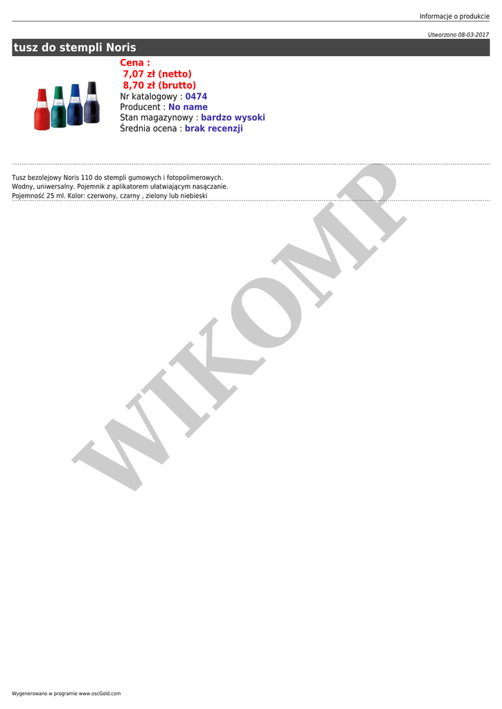 Informacje o produkcie Utworzono 08-03-2017 tusz do stempli Noris Cena : 7,07 zł (netto) 8,70 zł (brutto) Nr katalogowy : 0474 Producent : No name Stan magazynowy : bardzo wysoki Średnia ocena : brak recenzji W IK O M P Tusz bezolejowy Noris 110 do stempli gumowych i fotopolimerowych. Wodny, uniwersalny. Pojemnik z aplikatorem ułatwiającym nasączanie. Pojemność 25 ml. Kolor: czerwony, czarny , zielony lub niebieski Wygenerowano w programie www.oscGold.com