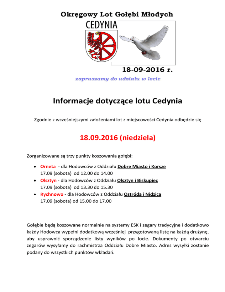 Informacje dotyczące lotu Cedynia Zgodnie z wcześniejszymi założeniami lot z miejscowości Cedynia odbędzie się 18.09.2016 (niedziela) Zorganizowane są trzy punkty koszowania gołębi: Orneta - dla Hodowców z Oddziału Dobre Miasto i Korsze 17.09 (sobota) od 12.00 do 14.00 Olsztyn - dla Hodowców z Oddziału Olsztyn i Biskupiec 17.09 (sobota) od 13.30 do 15.30 Rychnowo - dla Hodowców z Oddziału Ostróda i Nidzica 17.09 (sobota) od 15.00 do 17.00 Gołębie będą koszowane normalnie na systemy ESK i zegary tradycyjne i dodatkowo każdy Hodowca wypełni dodatkową wcześniej przygotowaną listę na każdą drużynę, aby usprawnić sporządzenie listy wyników po locie. Dokumenty po otwarciu zegarów wysyłamy do rachmistrza Oddziału Dobre Miasto. Adres wysyłki zostanie podany do wszystkich punktów wkładań. NAGRODY Z LOTU CEDYNIA Indywidualne dla gołębi 1 miejsce – 300 zł, puchar i dyplom 2 miejsce – 200 zł, puchar i dyplom 3 miejsce – 100 zł, puchar i dyplom 4-10 miejsca - puchar i dyplom 11-20 miejsce – dyplom Drużyny 3/10 1 miejsce – 300 zł , puchar i dyplom 2 miejsce – 200 zł, puchar i dyplom 3 miejsce – 100 zł, puchar i dyplom 4-10 miejsca - puchar i dyplom 11-20 miejsce – dyplom Dodatkowo od miejsca 10 każdy uczestnik lotu otrzyma pamiątkowy medal. Uroczyste ogłoszenie wyników i wręczenie nagród odbędzie się 08.10 2016 (sobota) o godz. 15.00 w miejscowości Klony w Agroturystyce u Dziedzica [mapkę dojazdu zamieścimy na stronie]. Na ceremonię zapraszamy wszystkich uczestników lotu. Organizator zapewnia ciepły talerz grochówki, kiełbasę z grilla, kawę, herbatę oraz PIWO na popitkę. DOBRY LOT Zarząd Oddziału Dobre Miasto