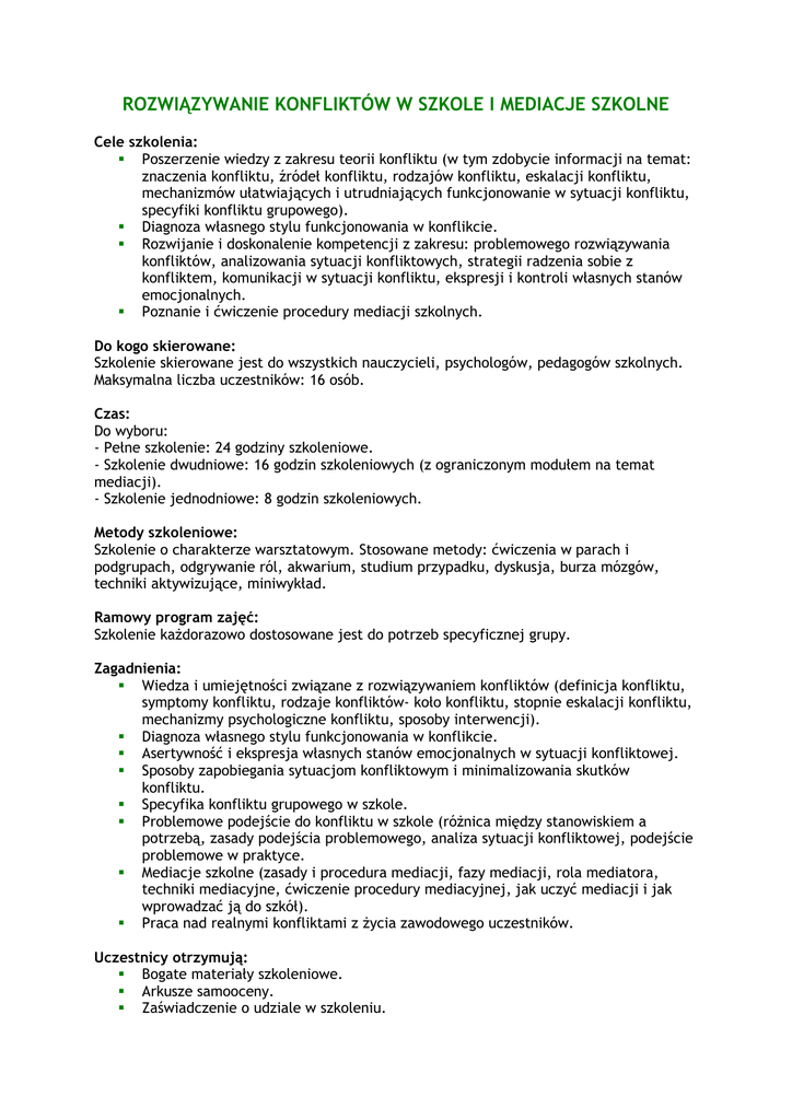 ROZWIĄZYWANIE KONFLIKTÓW W SZKOLE I MEDIACJE SZKOLNE Cele szkolenia: Poszerzenie wiedzy z zakresu teorii konfliktu (w tym zdobycie informacji na temat: znaczenia konfliktu, źródeł konfliktu, rodzajów konfliktu, eskalacji konfliktu, mechanizmów ułatwiających i utrudniających funkcjonowanie w sytuacji konfliktu, specyfiki konfliktu grupowego). Diagnoza własnego stylu funkcjonowania w konflikcie. Rozwijanie i doskonalenie kompetencji z zakresu: problemowego rozwiązywania konfliktów, analizowania sytuacji konfliktowych, strategii radzenia sobie z konfliktem, komunikacji w sytuacji konfliktu, ekspresji i kontroli własnych stanów emocjonalnych. Poznanie i ćwiczenie procedury mediacji szkolnych. Do kogo skierowane: Szkolenie skierowane jest do wszystkich nauczycieli, psychologów, pedagogów szkolnych. Maksymalna liczba uczestników: 16 osób. Czas: Do wyboru: - Pełne szkolenie: 24 godziny szkoleniowe. - Szkolenie dwudniowe: 16 godzin szkoleniowych (z ograniczonym modułem na temat mediacji). - Szkolenie jednodniowe: 8 godzin szkoleniowych. Metody szkoleniowe: Szkolenie o charakterze warsztatowym. Stosowane metody: ćwiczenia w parach i podgrupach, odgrywanie ról, akwarium, studium przypadku, dyskusja, burza mózgów, techniki aktywizujące, miniwykład. Ramowy program zajęć: Szkolenie kaŜdorazowo dostosowane jest do potrzeb specyficznej grupy. Zagadnienia: Wiedza i umiejętności związane z rozwiązywaniem konfliktów (definicja konfliktu, symptomy konfliktu, rodzaje konfliktów- koło konfliktu, stopnie eskalacji konfliktu, mechanizmy psychologiczne konfliktu, sposoby interwencji). Diagnoza własnego stylu funkcjonowania w konflikcie. Asertywność i ekspresja własnych stanów emocjonalnych w sytuacji konfliktowej. Sposoby zapobiegania sytuacjom konfliktowym i minimalizowania skutków konfliktu. Specyfika konfliktu grupowego w szkole. Problemowe podejście do konfliktu w szkole (róŜnica między stanowiskiem a potrzebą, zasady podejścia problemowego, analiza sytuacji konfliktowej, podejście problemowe w praktyce. Mediacje szkolne (zasady i procedura mediacji, fazy mediacji, rola mediatora, techniki mediacyjne, ćwiczenie procedury mediacyjnej, jak uczyć mediacji i jak wprowadzać ją do szkół). Praca nad realnymi konfliktami z Ŝycia zawodowego uczestników. Uczestnicy otrzymują: Bogate materiały szkoleniowe. Arkusze samooceny. Zaświadczenie o udziale w szkoleniu.