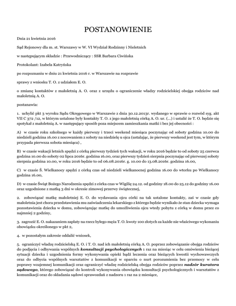 POSTANOWIENIE Dnia 21 kwietnia 2016 Sąd Rejonowy dla m. st. Warszawy w W. VI Wydział Rodzinny i Nieletnich w następującym składzie : Przewodniczący : SSR Barbara Ciwińska Protokolant: Izabela Katryńska po rozpoznaniu w dniu 21 kwietnia 2016 r. w Warszawie na rozprawie sprawy z wniosku T. O. z udziałem E. O. o zmianę kontaktów z małoletnią A. O. oraz z urzędu o ograniczenie władzy rodzicielskiej obojga rodziców nad małoletnią A. O. postanawia: 1. uchylić pkt 3 wyroku Sądu Okręgowego w Warszawie z dnia 30.12.2013r. wydanego w sprawie o rozwód syg. akt VII C 372 /12, w którym ustalone były kontakty T. O. z jego małoletnią córką A. O. ur. (...) i ustalić że T. O. będzie się spotykał z małoletnią A. w następujący sposób poza miejscem zamieszkania matki i bez jej obecności : A) w czasie roku szkolnego w każdy pierwszy i trzeci weekend miesiąca poczynając od soboty godzina 10.00 do niedzieli godzina 16.00 z nocowaniem z soboty na niedzielę u ojca (ustalając, że pierwszy weekend jest tym, w którym przypada pierwsza sobota miesiąca) , B) w czasie wakacji letnich spędzi z córką pierwszy tydzień tych wakacji, w roku 2016 będzie to od soboty 25 czerwca godzina 10.00 do soboty 02 lipca 2016r. godzina 16.00, oraz pierwszy tydzień sierpnia poczynając od pierwszej soboty sierpnia godzina 10.00, w roku 2016 będzie to od 06.08.2016r. g. 10.00 do 13.08.2016r. godzina 16.00, C) w czasie Ś. Wielkanocy spędzi z córką czas od niedzieli wielkanocnej godzina 16.00 do wtorku po Wielkanocy godzina 16.00, D) w czasie Świąt Bożego Narodzenia spędzi z córka czas w Wigilię 24.12. od godziny 18.00 do 25.12 do godziny 16.00 oraz uzgodnione z matką 3 dni w okresie zimowej przerwy świątecznej, 2. zobowiązać matkę małoletniej E. O. do wydawania ojcu córki na tak ustalone kontakty, zaś w czasie gdy małoletnia jest chora przedstawienia mu zaświadczenia lekarskiego z którego będzie wynikało że stan dziecka wymaga pozostawienia dziecka w domu, zobowiązując matkę do umożliwienia ojcu wtedy pobytu z córką w domu przez co najmniej 2 godziny, 3. zagrozić E. O. nakazaniem zapłaty na rzecz byłego męża T. O. kwoty 100 złotych za każde nie właściwego wykonaniu obowiązku określonego w pkt 2, 4. w pozostałym zakresie oddalić wniosek, 5. ograniczyć władzę rodzicielską E. O. i T. O. nad ich małoletnią córką A. O. poprzez zobowiązanie obojga rodziców do podjęcia i odbywania wspólnych konsultacji psychologicznych 1 raz na miesiąc w celu omówienia bieżącej sytuacji dziecka i uzgodnienia formy wykonywania opieki bądź leczenia oraz bieżących kwestii wychowawczych oraz do odbycia wspólnych warsztatów z komunikacji w oparciu o nurt porozumienia bez przemocy w celu poprawy wzajemnej komunikacji oraz ograniczyć władzę rodzicielską obojga rodziców poprzez nadzór kuratora sądowego, którego zobowiązać do kontroli wykonywania obowiązku konsultacji psychologicznych i warsztatów z komunikacji oraz do składania sądowi sprawozdań z nadzoru 1 raz na 2 miesiące, 6. kosztami postępowania obciążyć obie strony w ten sposób, że wnioskodawcę T. O. pozostawić przy poniesionych dotychczas kosztach oraz nakazać pobrać od niego na rzecz Skarbu Państwa kwotę 843,24 (osiemset czterdzieści trzy złote dwadzieścia cztery grosze ) tytułem pokrycia kosztów wydanej w sprawie opinii Opiniodawczego Zespołu (...), natomiast od uczestniczki E. O. pobrać na rzecz Skarbu Państwa kwotę 319,70 (trzysta dziewiętnaście złotych siedemdziesiąt groszy ) tytułem pokrycia kosztów wydanej w sprawie opinii sądowo – psychiatrycznej, 7. przyznać wynagrodzenie biegłej lekarzowi psychiatrze I. K. za przeprowadzenia badania i wydanie opinii w kwocie 319,70 (trzysta dziewiętnaście złotych siedemdziesiąt groszy ), którą to kwotę wypłacić tymczasowo ze Skarbu Państwa kasa Sądu Rejonowego dla m.st. Warszawy w W.. UZASADNIENIE W dniu 26 listopada 2014 roku wnioskodawca T. O. wniósł o zmianę kontaktów z małoletnią córką A. O. ustalonych wyrokiem Sądu Okręgowego w Warszawie, w dniu 30 grudnia 2013 roku, w sprawie o rozwód sygn. akt VII C 372/12. Wniósł o ustalenie, że będzie spotykał się z córką w każdy I i III weekend miesiąca od godziny 10.00 w sobotę do godziny 19 w niedzielę, poza miejscem zamieszkania dziecka, bez obecności matki i kuratora. Uzasadnił, że tak on jak i córka chcą aby małoletnia u niego mogła nocować. Podniósł, że dziecko jest związane z nim emocjonalnie i prosi, aby mogło u niego zostać na noc. W piśmie modyfikującym stanowisko w sprawie wniósł także o dodatkowe ustalenie kontaktów w czasie wakacji, świąt, długich weekendów . Wniósł także, aby matka dziecka została zobowiązana kontaktów tych mu nie utrudniać oraz o zagrożenie jej nakazaniem zapłaty kwoty 900 złotych na wypadek naruszenia obowiązku realizacji kontaktów (k.109-110). Uczestniczka E. O. wniosła o oddalenie wniosku byłego męża o zmianę jego kontaktów z córką. Podnosiła, że leczył się on psychiatrycznie na depresję lękową, oraz że nadużywał alkoholu. Podniosła także, że małoletnia jest z nią bardzo związana, nawet w nocy śpi z mamą. W nocy zdarzały się jej ataki gorączki lub duszności. Na ostatnim terminie rozprawy uczestniczka stwierdziła, że wyraża zgodę na kontakty zaproponowane przed mediatorem bez obecności kuratora, ale też bez nocowania córki u ojca (k.203). Uczestniczka podkreślała, że A. jest obecnie najważniejszą osobą w jej życiu. Dawniej to był to mąż, a teraz jest dziecko. Stara się ją wychowywać najlepiej jak potrafi, chciałaby aby córka miała oboje rodziców którzy ją kochają. Uważa, że były mąż powinien się z nią komunikować w sprawach dziecka i współdecydować o kontaktach i innych kwestiach. T. O. oraz E. O. kierowani byli na mediacje postanowieniem z 18.03.2015r. nie przyniosło ono jednak efektów, ucz