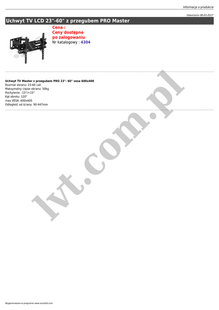 Informacje o produkcie Utworzono 08-03-2017 Uchwyt TV LCD 23"-60" z przegubem PRO Master Cena : Ceny dostępne po zalogowaniu lv t. co m .p Uchwyt TV Master z przegubem PRO 23"- 60" vesa 600x400 Rozmiar ekranu: 23-60 cali Maksymalny ciężar ekranu: 50kg Pochylenie: -15°/+15° Kąt obrotu: 120° max VESA: 600x400 Odległość od ściany: 90-447mm l Nr katalogowy : 4304 Wygenerowano w programie www.oscGold.com