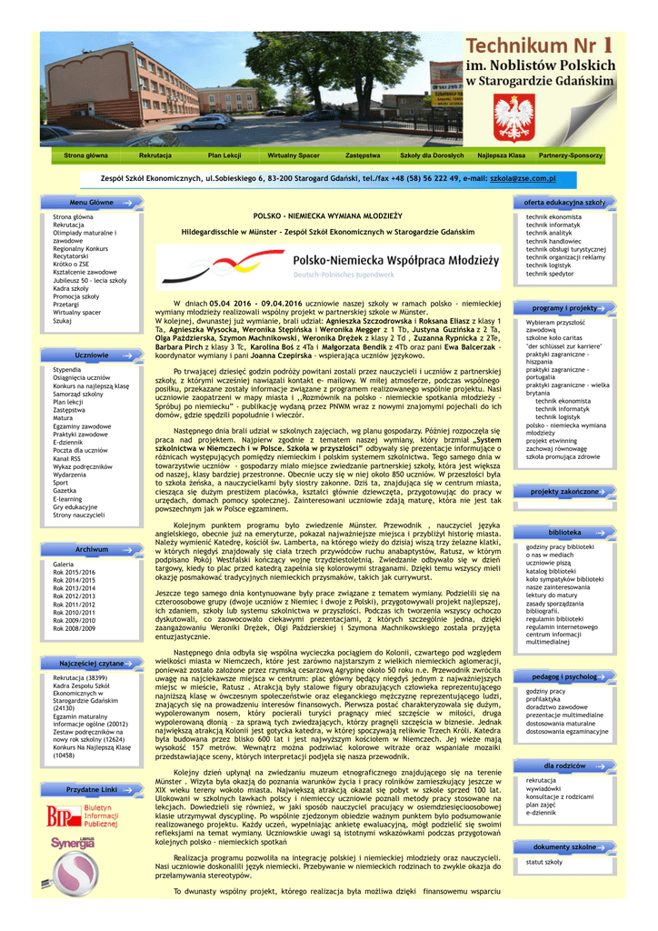 Strona główna Rekrutacja Plan Lekcji Wirtualny Spacer Zastępstwa Szkoły dla Dorosłych Najlepsza Klasa Partnerzy-Sponsorzy Zespół Szkół Ekonomicznych, ul.Sobieskiego 6, 83-200 Starogard Gdański, tel./fax +48 (58) 56 222 49, e-mail: [email protected] Menu Główne Strona główna Rekrutacja Olimpiady maturalne i zawodowe Regionalny Konkurs Recytatorski Krótko o ZSE Kształcenie zawodowe Jubileusz 50 - lecia szkoły Kadra szkoły Promocja szkoły Przetargi Wirtualny spacer Szukaj Uczniowie Stypendia Osiągnięcia uczniów Konkurs na najlepszą klasę Samorząd szkolny Plan lekcji Zastępstwa Matura Egzaminy zawodowe Praktyki zawodowe E-dziennik Poczta dla uczniów Kanał RSS Wykaz podręczników Wydarzenia Sport Gazetka E-learning Gry edukacyjne Strony nauczycieli Archiwum Galeria Rok 2015/2016 Rok 2014/2015 Rok 2013/2014 Rok 2012/2013 Rok 2011/2012 Rok 2010/2011 Rok 2009/2010 Rok 2008/2009 Najczęściej czytane Rekrutacja (38399) Kadra Zespołu Szkół Ekonomicznych w Starogardzie Gdańskim (24130) Egzamin maturalny informacje ogólne (20012) Zestaw podręczników na nowy rok szkolny (12624) Konkurs Na Najlepszą Klasę (10458) Przydatne Linki oferta edukacyjna szkoły POLSKO - NIEMIECKA WYMIANA MŁODZIEŻY Hildegardisschle w Münster - Zespół Szkół Ekonomicznych w Starogardzie Gdańskim W dniach 05.04 2016 - 09.04.2016 uczniowie naszej szkoły w ramach polsko - niemieckiej wymiany młodzieży realizowali wspólny projekt w partnerskiej szkole w Münster. W kolejnej, dwunastej już wymianie, brali udział: Agnieszka Szczodrowska i Roksana Eliasz z klasy 1 Ta, Agnieszka Wysocka, Weronika Stępińska i Weronika Megger z 1 Tb, Justyna Guzińska z 2 Ta, Olga Paździerska, Szymon Machnikowski, Weronika Drężek z klasy 2 Td , Zuzanna Rypnicka z 2Te, Barbara Pirch z klasy 3 Tc, Karolina Boś z 4Ta i Małgorzata Bendik z 4Tb oraz pani Ewa Balcerzak koordynator wymiany i pani Joanna Czepirska - wspierająca uczniów językowo. Po trwającej dziesięć godzin podróży powitani zostali przez nauczycieli i uczniów z partnerskiej szkoły, z którymi wcześniej nawiązali kontakt e- mailowy. W miłej atmosferze, podczas wspólnego posiłku, przekazane zostały informacje związane z programem realizowanego wspólnie projektu. Nasi uczniowie zaopatrzeni w mapy miasta i ,,Rozmównik na polsko - niemieckie spotkania młodzieży Spróbuj po niemiecku” - publikację wydaną przez PNWM wraz z nowymi znajomymi pojechali do ich domów, gdzie spędzili popołudnie i wieczór. Następnego dnia brali udział w szkolnych zajęciach, wg planu gospodarzy. Później rozpoczęła się praca nad projektem. Najpierw zgodnie z tematem naszej wymiany, który brzmiał „System szkolnictwa w Niemczech i w Polsce. Szkoła w przyszłości” odbywały się prezentacje informujące o różnicach występujących pomiędzy niemieckim i polskim systemem szkolnictwa. Tego samego dnia w towarzystwie uczniów - gospodarzy miało miejsce zwiedzanie partnerskiej szkoły, która jest większa od naszej, klasy bardziej przestronne. Obecnie uczy się w niej około 850 uczniów. W przeszłości była to szkoła żeńska, a nauczycielkami były siostry zakonne. Dziś ta, znajdująca się w centrum miasta, ciesząca się dużym prestiżem placówka, kształci głównie dziewczęta, przygotowując do pracy w urzędach, domach pomocy społecznej. Zainteresowani uczniowie zdają maturę, która nie jest tak powszechnym jak w Polsce egzaminem. Kolejnym punktem programu było zwiedzenie Münster. Przewodnik , nauczyciel języka angielskiego, obecnie już na emeryturze, pokazał najważniejsze miejsca i przybliżył historię miasta. Należy wymienić Katedrę, kościół św. Lamberta, na którego wieży do dzisiaj wiszą trzy żelazne klatki, w których niegdyś znajdowały się ciała trzech przywódców ruchu anabaptystów, Ratusz, w którym podpisano Pokój Westfalski kończący wojnę trzydziestoletnią. Zwiedzanie odbywało się w dzień targowy, kiedy to plac przed katedrą zapełnia się kolorowymi straganami. Dzięki temu wszyscy mieli okazję posmakować tradycyjnych niemieckich przysmaków, takich jak currywurst. Jeszcze tego samego dnia kontynuowane były prace związane z tematem wymiany. Podzielili się na czteroosobowe grupy (dwoje uczniów z Niemiec i dwoje z Polski), przygotowywali projekt najlepszej, ich zdaniem, szkoły lub systemu szkolnictwa w przyszłości. Podczas ich tworzenia wszyscy ochoczo dyskutowali, co zaowocowało ciekawymi prezentacjami, z których szczególnie jedna, dzięki zaangażowaniu Weroniki Drężek, Olgi Paździerskiej i Szymona Machnikowskiego została przyjęta entuzjastycznie. Następnego dnia odbyła się wspólna wycieczka pociągiem do Kolonii, czwartego pod względem wielkości miasta w Niemczech, które jest zarówno najstarszym z wielkich niemieckich aglomeracji, ponieważ zostało założone przez rzymską cesarzową Agrypinę około 50 roku n.e. Przewodnik zwróciła uwagę na najciekawsze miejsca w centrum: plac główny będący niegdyś jednym z najważniejszych miejsc w mieście, Ratusz . Atrakcją były stalowe figury obrazujących człowieka reprezentującego najniższą klasę w ówczesnym społeczeństwie oraz eleganckiego mężczyznę reprezentującego ludzi, znających się na prowadzeniu interesów finansowych. Pierwsza postać charakteryzowała się dużym, wypolerowanym nosem, który pocierali turyści pragnący mieć szczęście w miłości, druga wypolerowaną dłonią – za sprawą tych zwiedzających, którzy pragnęli szczęścia w biznesie. Jednak największą atrakcją Kolonii jest gotycka katedra, w której spoczywają relikwie Trzech Króli. Katedra była budowana przez blisko 600 lat i jest najwyższym kościołem w Niemczech. Jej wieże mają wysokość 157 metrów. Wewnątrz można podziwiać kolorowe witraże oraz wspaniałe mozaiki przedstawiające sceny, których interpretacji podjęła się nasza przewodnik. Kolejny dzień upłynął na zwiedza