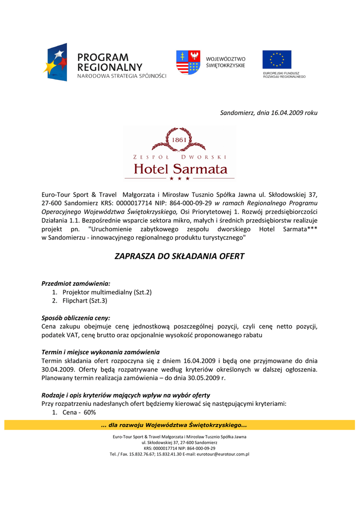 Sandomierz, dnia 16.04.2009 roku Euro-Tour Sport & Travel Małgorzata i Mirosław Tusznio Spółka Jawna ul. Skłodowskiej 37, 27-600 Sandomierz KRS: 0000017714 NIP: 864-000-09-29 w ramach Regionalnego Programu Operacyjnego Województwa Świętokrzyskiego, Osi Priorytetowej 1. Rozwój przedsiębiorczości Działania 1.1. Bezpośrednie wsparcie sektora mikro, małych i średnich przedsiębiorstw realizuje projekt pn. "Uruchomienie zabytkowego zespołu dworskiego Hotel Sarmata*** w Sandomierzu - innowacyjnego regionalnego produktu turystycznego" ZAPRASZA DO SKŁADANIA OFERT Przedmiot zamówienia: 1. Projektor multimedialny (Szt.2) 2. Flipchart (Szt.3) Sposób obliczenia ceny: Cena zakupu obejmuje cenę jednostkową poszczególnej pozycji, czyli cenę netto pozycji, podatek VAT, cenę brutto oraz opcjonalnie wysokość proponowanego rabatu Termin i miejsce wykonania zamówienia Termin składania ofert rozpoczyna się z dniem 16.04.2009 i będą one przyjmowane do dnia 30.04.2009. Oferty będą rozpatrywane według kryteriów określonych w dalszej ogłoszenia. Planowany termin realizacja zamówienia – do dnia 30.05.2009 r. Rodzaje i opis kryteriów mających wpływ na wybór oferty Przy rozpatrzeniu nadesłanych ofert będziemy kierować się następującymi kryteriami: 1. Cena - 60% … dla rozwoju Województwa Świętokrzyskiego... Euro-Tour Sport & Travel Małgorzata i Mirosław Tusznio Spółka Jawna ul. Skłodowskiej 37, 27-600 Sandomierz KRS: 0000017714 NIP: 864-000-09-29 Tel. / Fax. 15.832.76.67; 15.832.41.30 E-mail: [email protected] 2. Parametry techniczne – 40% Specyfikacja techniczna: Rzutnik multimedialny konferencyjny – stacjonarny– rozdzielczość min. XGA 1024 x 768 pikseli; Siła świata- nie mniejsza niż 1500 Ansilumenów; formatu ok. A4; Pilot do obsługi myszy komputerowej ze wskaźnikiem laserowym. Flipchart – tablica suchościeralna, magnetyczna, uchwyt z zębami do przytrzymywania papieru, półka na pisaki oraz regulacja wysokości. Blokowanie kółka - opcja. Miejsce, sposób i termin składania ofert: Oferty prosimy składać osobiście lub pocztą na adres biura firmy: Biuro Podróży Euro-Tour ul. Opatowska 9, 27-600 Sandomierz lub drogą elektroniczną na adres [email protected] lub [email protected] w terminie określonym w niniejszym zaproszeniu. Decyzja o wyborze dostawcy zostanie umieszczona na stronie internetowej firmy www.eurotour.com.pl w ciągu 14 dni od dnia zakończenia terminu składania ofert. Istnieje możliwość składania ofert na wybrane pozycje Projekt inwestycyjny pt. "Uruchomienie zabytkowego zespołu dworskiego Hotel Sarmata*** w Sandomierzu - innowacyjnego regionalnego produktu turystycznego" przez Unię Europejską z Europejskiego Funduszu Rozwoju Regionalnego w ramach Regionalnego Programu Operacyjnego Województwa Świętokrzyskiego na lata 2007-2013 i budżetu państwa. … dla rozwoju Województwa Świętokrzyskiego... Euro-Tour Sport & Travel Małgorzata i Mirosław Tusznio Spółka Jawna ul. Skłodowskiej 37, 27-600 Sandomierz KRS: 0000017714 NIP: 864-000-09-29 Tel. / Fax. 15.832.76.67; 15.832.41.30 E-mail: [email protected]