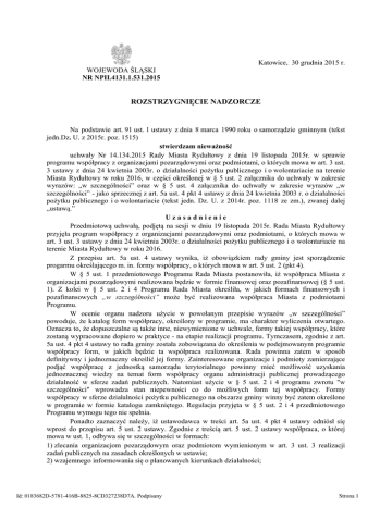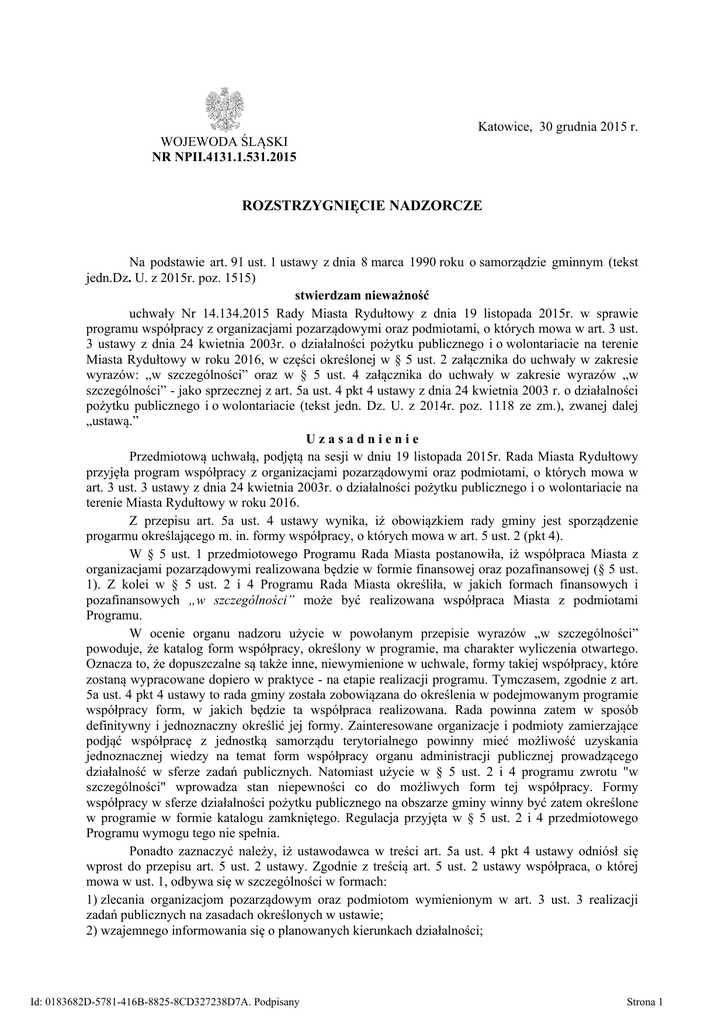 Katowice, 30 grudnia 2015 r. WOJEWODA ŚLĄSKI NR NPII.4131.1.531.2015 ROZSTRZYGNIĘCIE NADZORCZE Na podstawie art. 91 ust. 1 ustawy z dnia 8 marca 1990 roku o samorządzie gminnym (tekst jedn.Dz. U. z 2015r. poz. 1515) stwierdzam nieważność uchwały Nr 14.134.2015 Rady Miasta Rydułtowy z dnia 19 listopada 2015r. w sprawie programu współpracy z organizacjami pozarządowymi oraz podmiotami, o których mowa w art. 3 ust. 3 ustawy z dnia 24 kwietnia 2003r. o działalności pożytku publicznego i o wolontariacie na terenie Miasta Rydułtowy w roku 2016, w części określonej w § 5 ust. 2 załącznika do uchwały w zakresie wyrazów: „w szczególności” oraz w § 5 ust. 4 załącznika do uchwały w zakresie wyrazów „w szczególności” - jako sprzecznej z art. 5a ust. 4 pkt 4 ustawy z dnia 24 kwietnia 2003 r. o działalności pożytku publicznego i o wolontariacie (tekst jedn. Dz. U. z 2014r. poz. 1118 ze zm.), zwanej dalej „ustawą.” Uzasadnienie Przedmiotową uchwałą, podjętą na sesji w dniu 19 listopada 2015r. Rada Miasta Rydułtowy przyjęła program współpracy z organizacjami pozarządowymi oraz podmiotami, o których mowa w art. 3 ust. 3 ustawy z dnia 24 kwietnia 2003r. o działalności pożytku publicznego i o wolontariacie na terenie Miasta Rydułtowy w roku 2016. Z przepisu art. 5a ust. 4 ustawy wynika, iż obowiązkiem rady gminy jest sporządzenie progarmu określającego m. in. formy współpracy, o których mowa w art. 5 ust. 2 (pkt 4). W § 5 ust. 1 przedmiotowego Programu Rada Miasta postanowiła, iż współpraca Miasta z organizacjami pozarządowymi realizowana będzie w formie finansowej oraz pozafinansowej (§ 5 ust. 1). Z kolei w § 5 ust. 2 i 4 Programu Rada Miasta określiła, w jakich formach finansowych i pozafinansowych „w szczególności” może być realizowana współpraca Miasta z podmiotami Programu. W ocenie organu nadzoru użycie w powołanym przepisie wyrazów „w szczególności” powoduje, że katalog form współpracy, określony w programie, ma charakter wyliczenia otwartego. Oznacza to, że dopuszczalne są także inne, niewymienione w uchwale, formy takiej współpracy, które zostaną wypracowane dopiero w praktyce - na etapie realizacji programu. Tymczasem, zgodnie z art. 5a ust. 4 pkt 4 ustawy to rada gminy została zobowiązana do określenia w podejmowanym programie współpracy form, w jakich będzie ta współpraca realizowana. Rada powinna zatem w sposób definitywny i jednoznaczny określić jej formy. Zainteresowane organizacje i podmioty zamierzające podjąć współpracę z jednostką samorządu terytorialnego powinny mieć możliwość uzyskania jednoznacznej wiedzy na temat form współpracy organu administracji publicznej prowadzącego działalność w sferze zadań publicznych. Natomiast użycie w § 5 ust. 2 i 4 programu zwrotu "w szczególności" wprowadza stan niepewności co do możliwych form tej współpracy. Formy współpracy w sferze działalności pożytku publicznego na obszarze gminy winny być zatem określone w programie w formie katalogu zamkniętego. Regulacja przyjęta w § 5 ust. 2 i 4 przedmiotowego Programu wymogu tego nie spełnia. Ponadto zaznaczyć należy, iż ustawodawca w treści art. 5a ust. 4 pkt 4 ustawy odniósł się wprost do przepisu art. 5 ust. 2 ustawy. Zgodnie z treścią art. 5 ust. 2 ustawy współpraca, o której mowa w ust. 1, odbywa się w szczególności w formach: 1) zlecania organizacjom pozarządowym oraz podmiotom wymienionym w art. 3 ust. 3 realizacji zadań publicznych na zasadach określonych w ustawie; 2) wzajemnego informowania się o planowanych kierunkach działalności; Id: 0183682D-5781-416B-8825-8CD327238D7A. Podpisany Strona 1 3) konsultowania z organizacjami pozarządowymi oraz podmiotami wymienionymi w art. 3 ust. 3 projektów aktów normatywnych w dziedzinach dotyczących działalności statutowej tych organizacji; 4) konsultowania projektów aktów normatywnych dotyczących sfery zadań publicznych, o której mowa w art. 4, z radami działalności pożytku publicznego, w przypadku ich utworzenia przez właściwe jednostki samorządu terytorialnego; 5) tworzenia wspólnych zespołów o charakterze doradczym i inicjatywnym, złożonych z przedstawicieli organizacji pozarządowych, podmiotów wymienionych w art. 3 ust. 3 oraz przedstawicieli właściwych organów administracji publicznej; 6) umowy o wykonanie inicjatywy lokalnej na zasadach określonych w ustawie; 7) umowy partnerskiej określonej w art. 28a ust. 1 ustawy z dnia 6 grudnia 2006 r. o zasadach prowadzenia polityki rozwoju (Dz.U. z 2009 r. Nr 84, poz. 712, z późn. zm.) oraz porozumienia albo umowy o partnerstwie określonych w art. 33 ust. 1 ustawy z dnia 11 lipca 2014 r. o zasadach realizacji programów w zakresie polityki spójności finansowanych w perspektywie finansowej 2014-2020 (Dz.U. poz. 1146). Przepis ten wskazuje przykładowe formy współpracy gminy z organizacjami pozarządowymi oraz podmiotami wymienionymi w art. 3 ust. 3 ustawy. Gmina może zatem podjąć współpracę z organizacjami pozarządowymi w formach określonych w art. 5 ust. 2 ustawy oraz w innych formach niewymienionych w tym przepisie, a preferowanych przez nią. Nie oznacza to jednak, że gmina sama może tworzyć otwarty katalog form współpracy z organizacjami pozarządowymi. Rada ma prawo wyboru form, ale powinna je uregulować w uchwale wyczerpująco. Należy mieć na uwadze fakt, iż uchwała ma charakter wykonawczy w stosunku do ustawy. Powyższe oznacza, że Rada - kierując się udzielonym jej upoważnieniem do podjęcia uchwały powinna uregulować w sposób kompleksowy i precyzyjny materię podlegającą regulacji, w tym konkretnym przypadku powinna określić w sposób kompleksowy katalog form współpracy z organizacjami pozarządowymi przy realizacji zadań publicznych. Program jest aktem o charakterze planistycznym, programowym, wyznaczającym pewne kierunki i cele działania. Jednakże ramy 