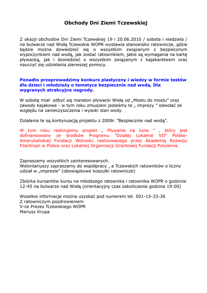 Obchody Dni Ziemi Tczewskiej Z okazji obchodów Dni Ziemi Tczewskiej 19 i 20.06.2010 / sobota i niedziela / na bulwarze nad Wisłą Tczewskie WOPR wystawia stanowisko ratownicze, gdzie będzie moŜna dowiedzieć się o wszystkim związanym z bezpiecznym wypoczynkiem nad wodą, jak zostać ratownikiem, jakie są wymagania na kartę pływacką, jak i dowiedzieć o wszystkim związanym z kajakarstwem oraz nauczyć się udzielania pierwszej pomocy. Ponadto przeprowadzimy konkurs plastyczny i wiedzy w formie testów dla dzieci i młodzieŜy o tematyce bezpiecznie nad wodą. Dla wygranych atrakcyjne nagrody. W sobotę miał odbyć się maraton pływacki Wisłą od „Mostu do mostu” oraz zawody kajakowe - w tym roku zmuszeni jesteśmy te „ imprezy ” odwołać ze względu na zanieczyszczenia i wysoki stan wody. Działania te są kontynuacją projektu z 2009r. "Bezpiecznie nad wodą". W tym roku realizujemy projekt „ Pływanie na luzie ” , który jest dofinansowany ze środków Programu "Działaj Lokalnie VII" PolskoAmerykańskiej Fundacji Wolności realizowanego przez Akademię Rozwoju Filantropii w Polsce oraz Lokalnej Organizacji Grantowej Fundacji Pokolenia. Zapraszamy wszystkich zainteresowanych. Wolontariuszy zapraszamy do współpracy , a Tczewskich ratowników o liczny udział w „imprezie” (obowiązkowe koszulki ratownicze) Zbiórka kursantów kursu na młodszego ratownika i ratownika WOPR o godzinie 12:45 na bulwarze nad Wisłą (orientacyjny czas zakończenia godzina 19:00) Wszelkie informacje moŜna uzyskać pod numerem tel. 501-15-33-36 Z ratowniczym pozdrowieniem V-ce Prezes Tczewskiego WOPR Mariusz Krupa