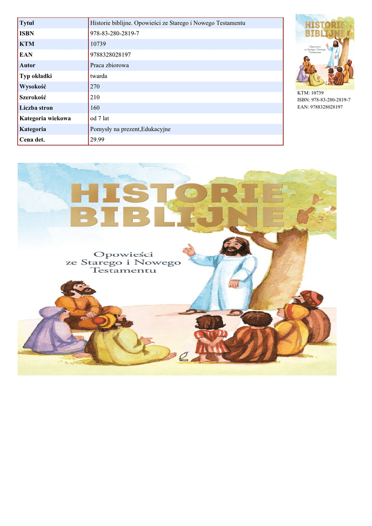 Tytuł Historie biblijne. Opowieści ze Starego i Nowego Testamentu ISBN 978-83-280-2819-7 KTM 10739 EAN 9788328028197 Autor Praca zbiorowa Typ okładki twarda Wysokość 270 Szerokość 210 Liczba stron 160 Kategoria wiekowa od 7 lat Kategoria Pomysły na prezent,Edukacyjne Cena det. 29.99 KTM: 10739 ISBN: 978-83-280-2819-7 EAN: 9788328028197