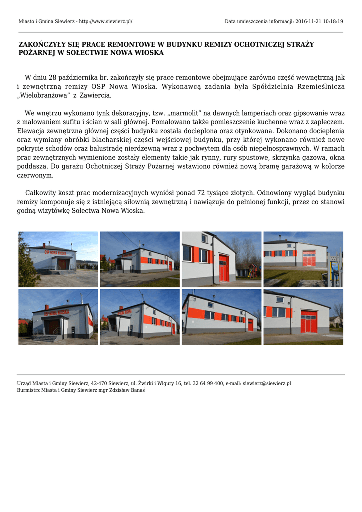 Miasto i Gmina Siewierz - http://www.siewierz.pl/ Data umieszczenia informacji: 2016-11-21 10:18:19 ZAKOŃCZYŁY SIĘ PRACE REMONTOWE W BUDYNKU REMIZY OCHOTNICZEJ STRAŻY POŻARNEJ W SOŁECTWIE NOWA WIOSKA W dniu 28 października br. zakończyły się prace remontowe obejmujące zarówno część wewnętrzną jak i zewnętrzną remizy OSP Nowa Wioska. Wykonawcą zadania była Spółdzielnia Rzemieślnicza „Wielobranżowa” z Zawiercia. We wnętrzu wykonano tynk dekoracyjny, tzw. „marmolit” na dawnych lamperiach oraz gipsowanie wraz z malowaniem sufitu i ścian w sali głównej. Pomalowano także pomieszczenie kuchenne wraz z zapleczem. Elewacja zewnętrzna głównej części budynku została docieplona oraz otynkowana. Dokonano docieplenia oraz wymiany obróbki blacharskiej części wejściowej budynku, przy której wykonano również nowe pokrycie schodów oraz balustradę nierdzewną wraz z pochwytem dla osób niepełnosprawnych. W ramach prac zewnętrznych wymienione zostały elementy takie jak rynny, rury spustowe, skrzynka gazowa, okna poddasza. Do garażu Ochotniczej Straży Pożarnej wstawiono również nową bramę garażową w kolorze czerwonym. Całkowity koszt prac modernizacyjnych wyniósł ponad 72 tysiące złotych. Odnowiony wygląd budynku remizy komponuje się z istniejącą siłownią zewnętrzną i nawiązuje do pełnionej funkcji, przez co stanowi godną wizytówkę Sołectwa Nowa Wioska. Urząd Miasta i Gminy Siewierz, 42-470 Siewierz, ul. Żwirki i Wigury 16, tel. 32 64 99 400, e-mail: [email protected] Burmistrz Miasta i Gminy Siewierz mgr Zdzisław Banaś