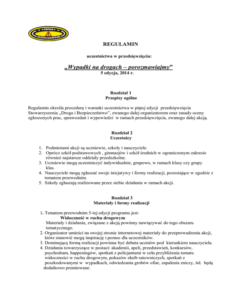REGULAMIN uczestnictwa w przedsięwzięciu: „Wypadki na drogach – porozmawiajmy” 5 edycja, 2014 r. Rozdział 1 Przepisy ogólne Regulamin określa procedurę i warunki uczestnictwa w piątej edycji przedsięwzięcia Stowarzyszenia „Droga i Bezpieczeństwo”, zwanego dalej organizatorem oraz zasady oceny zgłoszonych prac, sprawozdań i wypowiedzi w ramach przedsięwzięcia, zwanego dalej akcją. Rozdział 2 Uczestnicy 1. Podmiotami akcji są uczniowie, szkoły i nauczyciele. 2. Oprócz szkół podstawowych , gimnazjów i szkół średnich w ograniczonym zakresie również najstarsze oddziały przedszkolne. 3. Uczniowie mogą uczestniczyć indywidualnie, grupowo, w ramach klasy czy grupy klas. 4. Nauczyciele mogą zgłaszać swoje inicjatywy i formy realizacji, pozostające w zgodzie z tematem przewodnim. 5. Szkoły zgłaszają realizowane przez siebie działania w ramach akcji. Rozdział 3 Materiały i formy realizacji 1. Tematem przewodnim 5-tej edycji programu jest: Widoczność w ruchu drogowym Materiały i działania, związane z akcją powinny nawiązywać do tego obszaru tematycznego. 2. Organizator umieści na swojej stronie internetowej materiały do przeprowadzenia akcji, które stanowić mogą inspirację i pomoc dla uczestników. 3. Dominującą formą realizacji powinna być debata uczniów pod kierunkiem nauczyciela. 4. Działania towarzyszące w postaci: akademii, apeli, przedstawień, konkursów, psychodram, happeningów, spotkań z policjantami w celu przybliżenia tematu widoczności w ruchu drogowym, pokazów służb ratowniczych, spotkań z poszkodowanymi w wypadkach, odwiedzania grobów ofiar, zapalenia zniczy, itd. będą dodatkowo premiowane. Rozdział 4 Sposoby komunikowania się z organizatorem 1. Organizator udostępni odpowiednio wcześniej przed terminem akcji materiały wspomagające jej przeprowadzenie za pośrednictwem własnej strony internetowej o adresie: www.drogaibezpieczenstwo.org.pl , oraz na tym samym nośniku umieści wszelkie informacje i komunikaty jej dotyczące. 2. Uczestnicy kontaktują się w sprawach ważnych z organizatorem telefonicznie i faksowo oraz drogą e-mailową na numery i adres podane w komunikatach akcji. 3. W sytuacjach wyjątkowych dopuszcza się korespondencję pocztową. Rozdział 5 Kryteria opracowania nadsyłanych do organizatora sprawozdań i wypowiedzi 1. Przekazywane przez uczestników materiały muszą spełniać ściśle określone kryteria: a. sprawozdania, relacje i wypowiedzi nie mogą przekraczać jednej strony wydruku, przy użyciu standardowej wielkości czcionki. b) do przesłanych relacji dołączone mogą być maksymalnie 2 zdjęcia o pomniejszonym formacie. c) nie należy przesyłać prezentacji multimedialnych i filmów. Jeśli takie powstaną , informacja o nich powinna się znaleźć w nadesłanych materiałach. Organizator w razie potrzeby skontaktuje się z uczestnikiem w tej sprawie. 2. Zgłoszone materiały, które nie spełniają wymogów, podanych w rozdz. 5, punkcie 1 nie będą rozpatrywane. 3. Szczegółowe zasady, dotyczące konkursu dla uczniów-uczestników na wiersz / hasło, oraz krótki utwór literacki o treściach, związanych z tematem przewodnim, zostaną przedstawione w momencie jego ogłoszenia na stronach internetowych organizatora. Rozdział 6 Ocena nadsyłanych materiałów 1. Oceny nadesłanych przez uczestników materiałów dokona 4-osobowe jury, powołane przez organizatora. 2. Przy ocenie brana będzie pod uwagę zgodność z tematem przewodnim, wartość merytoryczna opracowania lub wypowiedzi oraz interesująca forma realizacji. 3. Jury wyłoni najlepsze prace w kategorii: uczeń, nauczyciel, szkoła. 4. Lista nagrodzonych i wyróżnionych uczestników zostanie podana do wiadomości na stronie internetowej organizatora. Rozdział 7 Terminy 1. Datę przeprowadzenia akcji w szkołach ustalono: - na dzień 18, 19 grudnia 2014 r. Z uwagi na okres przedświąteczny uwzględnimy również realizację akcji w ciągu kilku wcześniejszych dni. 2. Pozostałe terminy, związane z przeprowadzeniem akcji, zgłaszaniem prac i ich oceną zostaną umieszczone w informacjach i komunikatach na stronie internetowej organizatora.