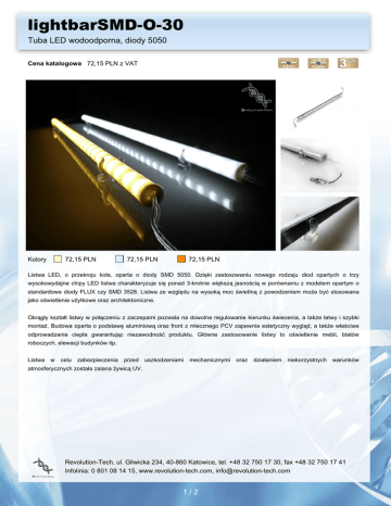lightbarSMD-O-30 Tuba LED wodoodporna, diody 5050 Cena katalogowa 72,15 PLN z VAT Kolory 72,15 PLN 72,15 PLN 72,15 PLN Listwa LED, o przekroju koła, oparta o diody SMD 5050. Dzięki zastosowaniu nowego rodzaju diod opartych o trzy wysokowydajne chipy LED listwa charakteryzuje się ponad 3-krotnie większą jasnością w porównaniu z modelem opartym o standardowe diody FLUX czy SMD 3528. Listwa ze względu na wysoką moc świetlną z powodzeniem może być stosowana jako oświetlenie użytkowe oraz architektoniczne. Okrągły kształt listwy w połączeniu z zaczepami pozwala na dowolne regulowanie kierunku świecenia, a także łatwy i szybki montaż. Budowa oparta o podstawę aluminiową oraz front z mlecznego PCV zapewnia estetyczny wygląd, a także właściwe odprowadzanie ciepła gwarantując niezawodność produktu. Główne zastosowanie listwy to oświetlenie mebli, blatów roboczych, elewacji budynków itp. Listwa w celu zabezpieczenia przed uszkodzeniami mechanicznymi oraz działaniem niekorzystnych warunków atmosferycznych została zalana żywicą UV. Revolution-Tech, ul. Gliwicka 234, 40-860 Katowice, tel. +48 32 750 17 30, fax +48 32 750 17 41 Infolinia: 0 801 08 14 15, www.revolution-tech.com, [email protected] 1/2 Specyfikacje Ilość diod LED w sekcji/module 30 szt Długość konektorów/przewodu łączącego 9 + 9 cm Typ diody LED SMD 5050 Średni czas życia diody 50 000 godz. Wodoszczelność tak Współczynnik ochrony IP IP65 Obudowa plastik + aluminium Jednostka sprzedaży sztuki Wymiary 50 cm Waga 0,08 kg Waga brutto (z opakowaniem) 0,1 kg Gwarancja 36 m-cy Napięcie Prąd Natężenie WW CW R A Y G B 12 V 12 V 12 V 12 V 12 V 12 V 12 V DC DC DC DC DC DC DC 0,55 A 0,6 A 0,8 A 0,8 A 0,8 A 0,8 A 0,8 A Pobór mocy 6,6 W 7,2 W 9,6 W 9,6 W 9,6 W 9,6 W 9,6 W Strumień świetlny 300 lm 350 lm 170 lm 45 lm 60 lm 255 lm 63 lm 140 ° 140 ° 140 ° 140 ° 140 ° 140 ° 140 ° 3 200 K 6 500 K Kąt świecenia Temperatura barwowa Revolution-Tech, ul. Gliwicka 234, 40-860 Katowice, tel. +48 32 750 17 30, fax +48 32 750 17 41 Infolinia: 0 801 08 14 15, www.revolution-tech.com, [email protected] 2/2