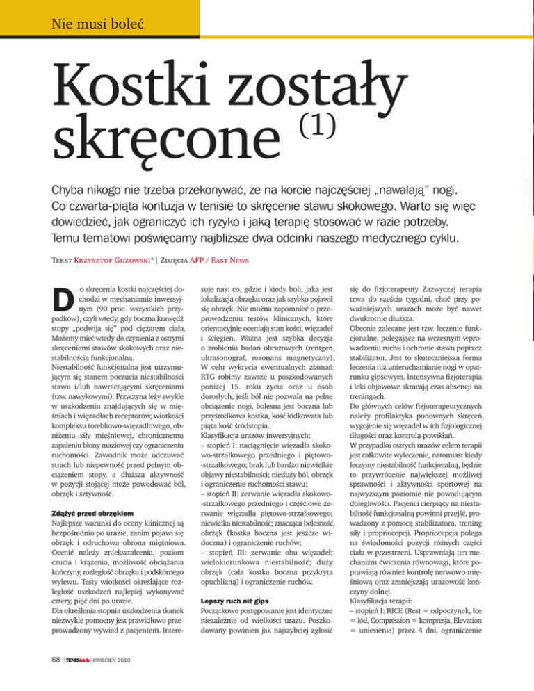 Nie musi boleç Kostki zostały (1) skr´cone Chyba nikogo nie trzeba przekonywaç, ˝e na korcie najcz´Êciej „nawalajà” nogi. Co czwarta-piàta kontuzja w tenisie to skr´cenie stawu skokowego. Warto si´ wi´c dowiedzieç, jak ograniczyç ich ryzyko i jakà terapi´ stosowaç w razie potrzeby. Temu tematowi poÊwi´camy najbli˝sze dwa odcinki naszego medycznego cyklu. Tekst Krzysztof Guzowski*| Zdj´cia AFP / East News o skr´cenia kostki najcz´Êciej dochodzi w mechanizmie inwersyjnym (90 proc. wszystkich przypadków), czyli wtedy, gdy boczna kraw´dê stopy „podwija si´” pod ci´˝arem ciała. Mo˝emy mieç wtedy do czynienia z ostrymi skr´ceniami stawów skokowych oraz niestabilnoÊcià funkcjonalnà. NiestabilnoÊç funkcjonalna jest utrzymujàcym si´ stanem poczucia niestabilnoÊci stawu i/lub nawracajàcymi skr´ceniami (tzw. nawykowymi). Przyczyna le˝y zwykle w uszkodzeniu znajdujàcych si´ w mi´Êniach i wi´zadłach receptorów, wiotkoÊci kompleksu torebkowo-wi´zadłowego, obni˝eniu siły mi´Êniowej, chronicznemu zapaleniu błony maziowej czy ograniczeniu ruchomoÊci. Zawodnik mo˝e odczuwaç strach lub niepewnoÊç przed pełnym obcià˝eniem stopy, a dłu˝sza aktywnoÊç w pozycji stojàcej mo˝e powodowaç ból, obrz´k i sztywnoÊç. D Zdà˝yç przed obrz´kiem Najlepsze warunki do oceny klinicznej sà bezpoÊrednio po urazie, zanim pojawi si´ obrz´k i odruchowa obrona mi´Êniowa. Oceniç nale˝y zniekształcenia, poziom czucia i krà˝enia, mo˝liwoÊç obcià˝ania koƒczyny, rozległoÊç obrz´ku i podskórnego wylewu. Testy wiotkoÊci okreÊlajàce rozległoÊç uszkodzeƒ najlepiej wykonywaç cztery, pi´ç dni po urazie. Dla okreÊlenia stopnia uszkodzenia tkanek niezwykle pomocny jest prawidłowo przeprowadzony wywiad z pacjentem. Intere- 68 |TENISklub|KWIECIE¡ 2010 suje nas: co, gdzie i kiedy boli, jaka jest lokalizacja obrz´ku oraz jak szybko pojawił si´ obrz´k. Nie mo˝na zapomnieç o przeprowadzeniu testów klinicznych, które orientacyjnie oceniajà stan koÊci, wi´zadeł i Êci´gien. Wa˝na jest szybka decyzja o zrobieniu badaƒ obrazowych (rentgen, ultrasonograf, rezonans magnetyczny). W celu wykrycia ewentualnych złamaƒ RTG robimy zawsze u poszkodowanych poni˝ej 15. roku ˝ycia oraz u osób dorosłych, jeÊli ból nie pozwala na pełne obcià˝enie nogi, bolesna jest boczna lub przyÊrodkowa kostka, koÊç łódkowata lub piàta koÊç Êródstopia. Klasyfikacja urazów inwersyjnych: – stopieƒ I: naciàgni´cie wi´zadła skokowo-strzałkowego przedniego i pi´towo-strzałkowego; brak lub bardzo niewielkie objawy niestabilnoÊci; niedu˝y ból, obrz´k i ograniczenie ruchomoÊci stawu; – stopieƒ II: zerwanie wi´zadła skokowo-strzałkowego przedniego i cz´Êciowe zerwanie wi´zadła pi´towo-strzałkowego; niewielka niestabilnoÊç; znaczàca bolesnoÊç, obrz´k (kostka boczna jest jeszcze widoczna) i ograniczenie ruchów; – stopieƒ III: zerwanie obu wi´zadeł; wielokierunkowa niestabilnoÊç; du˝y obrz´k (cała kostka boczna przykryta opuchliznà) i ograniczenie ruchów. Lepszy ruch ni˝ gips Poczàtkowe post´powanie jest identyczne niezale˝nie od wielkoÊci urazu. Poszkodowany powinien jak najszybciej zgłosiç si´ do fizjoterapeuty Zazwyczaj terapia trwa do szeÊciu tygodni, choç przy powa˝niejszych urazach mo˝e byç nawet dwukrotnie dłu˝sza. Obecnie zalecane jest tzw. leczenie funkcjonalne, polegajàce na wczesnym wprowadzeniu ruchu i ochronie stawu poprzez stabilizator. Jest to skuteczniejsza forma leczenia ni˝ unieruchamianie nogi w opatrunku gipsowym. Intensywna fizjoterapia i leki objawowe skracajà czas absencji na treningach. Do głównych celów fizjoterapeutycznych nale˝y profilaktyka ponownych skr´ceƒ, wygojenie si´ wi´zadeł w ich fizjologicznej długoÊci oraz kontrola powikłaƒ. W przypadku ostrych urazów celem terapii jest całkowite wyleczenie, natomiast kiedy leczymy niestabilnoÊç funkcjonalnà, b´dzie to przywrócenie najwi´kszej mo˝liwej sprawnoÊci i aktywnoÊci sportowej na najwy˝szym poziomie nie powodujàcym dolegliwoÊci. Pacjenci cierpiàcy na niestabilnoÊç funkcjonalnà powinni przejÊç, prowadzony z pomocà stabilizatora, trening siły i propriocepcji. Propriocepcja polega na ÊwiadomoÊci pozycji ró˝nych cz´Êci ciała w przestrzeni. Usprawniajà ten mechanizm çwiczenia równowagi, które poprawiajà równie˝ kontrol´ nerwowo-mi´Êniowà oraz zmniejszajà urazowoÊç koƒczyny dolnej. Klasyfikacja terapii: – stopieƒ I: RICE (Rest = odpoczynek, Ice = lód, Compression = kompresja, Elevation = uniesienie) przez 4 dni, ograniczenie aktywnoÊci sportowej przez 3-10 dni, stabilizator przez 3 tygodnie; – stopieƒ II: RICE przez 1 tydzieƒ, w razie potrzeby odcià˝enie koƒczyny (kule przez kilka dni), konieczne badanie USG, powrót do treningu najwczeÊniej po 3-4 tygodniach, stabilizator przez 6-8 tygodni (przy aktywnoÊci sportowej przez 1 rok); – stopieƒ III: RICE przez 10 dni, ograniczenie obcià˝ania (7-21 dni chodzenie o kulach z markowaniem obcià˝enia), monitorowanie procesu gojenia tkanek za pomocà USG, powrót do aktywnoÊci sportowej minimum po 8-10 tygodniach (po operacji nie wczeÊniej ni˝ po 12 tygodniach), stabilizator przez 10-12 tygodni (przy aktywnoÊci sportowej przez 1 rok). Okład z zielonego groszku Niezwykle istotne sà działania wykonywane przez fizjoterapeut´. Mo˝e on wpłynàç na procesy gojenia i przebudowy tkanek, co przyspiesza powrót do zdrowia, odzyskanie pełnego zakresu ruchu i zmniejsza prawdopodobieƒstwo wystàpienia groênych powikłaƒ. Przez pierwsze 24 godziny po urazie przykładamy poprzez bawełnianà warstw´ ochronnà lód, cold-pack lub po prostu mro˝onk´ z groszku (co godzin´ na 15 minut). Natychmiast po urazie stosujemy ucisk poprzez zawini´cie stopy i łydki banda˝em elastycznym na 5 dni (tak˝e na noc). Stop´ staramy si´ utrzymywaç powy˝ej poziomu serca tak cz´sto, jak to m