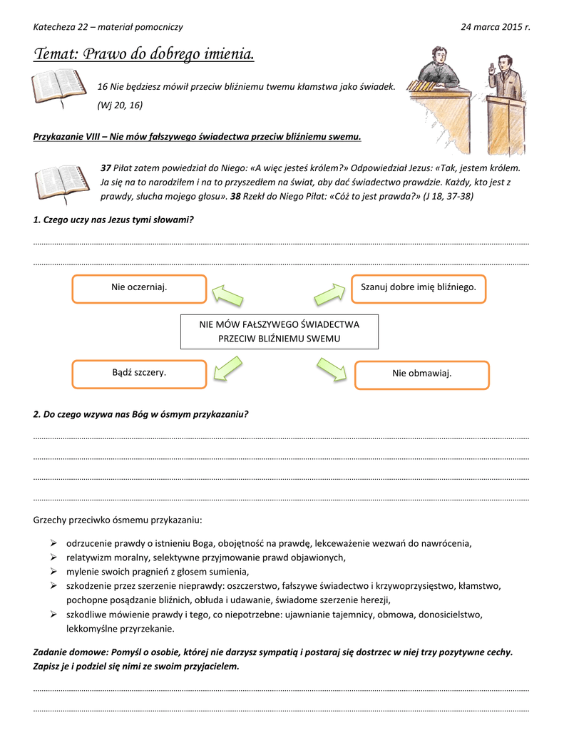 Katecheza 22 – materiał pomocniczy 24 marca 2015 r. Temat: Prawo do dobrego imienia. 16 Nie będziesz mówił przeciw bliźniemu twemu kłamstwa jako świadek. (Wj 20, 16) Przykazanie VIII – Nie mów fałszywego świadectwa przeciw bliźniemu swemu. 37 Piłat zatem powiedział do Niego: «A więc jesteś królem?» Odpowiedział Jezus: «Tak, jestem królem. Ja się na to narodziłem i na to przyszedłem na świat, aby dać świadectwo prawdzie. Każdy, kto jest z prawdy, słucha mojego głosu». 38 Rzekł do Niego Piłat: «Cóż to jest prawda?» (J 18, 37-38) 1. Czego uczy nas Jezus tymi słowami? ............................................................................................................................................................................................................................................. ............................................................................................................................................................................................................................................. Nie oczerniaj. Szanuj dobre imię bliźniego. NIE MÓW FAŁSZYWEGO ŚWIADECTWA PRZECIW BLIŹNIEMU SWEMU Bądź szczery. Nie obmawiaj. 2. Do czego wzywa nas Bóg w ósmym przykazaniu? ............................................................................................................................................................................................................................................. ............................................................................................................................................................................................................................................. ............................................................................................................................................................................................................................................. ............................................................................................................................................................................................................................................. Grzechy przeciwko ósmemu przykazaniu: odrzucenie prawdy o istnieniu Boga, obojętność na prawdę, lekceważenie wezwań do nawrócenia, relatywizm moralny, selektywne przyjmowanie prawd objawionych, mylenie swoich pragnień z głosem sumienia, szkodzenie przez szerzenie nieprawdy: oszczerstwo, fałszywe świadectwo i krzywoprzysięstwo, kłamstwo, pochopne posądzanie bliźnich, obłuda i udawanie, świadome szerzenie herezji, szkodliwe mówienie prawdy i tego, co niepotrzebne: ujawnianie tajemnicy, obmowa, donosicielstwo, lekkomyślne przyrzekanie. Zadanie domowe: Pomyśl o osobie, której nie darzysz sympatią i postaraj się dostrzec w niej trzy pozytywne cechy. Zapisz je i podziel się nimi ze swoim przyjacielem. ............................................................................................................................................................................................................................................. ............................................................................................................................................................................................................................................. Katecheza 22 – materiał pomocniczy 24 marca 2015 r. Komentarz dla katechety: Ósme przykazanie stoi na straży prawdy. Nakazuje ono szczerze jej szukać, trwać przy niej i na jej fundamencie budować życie, zwłaszcza religijne i moralne. Poznana prawda nakłada też obowiązek szerzenia jej słowem i świadczenia o niej swoim życiem. Ósme przykazanie zobowiązuje w szczególny sposób osoby odpowiedzialne za środki masowego przekazu do służenia prawdzie. Nie można używać środków masowego przekazu do manipulowania społeczeństwem. Grzechem przeciwko ósmemu przykazaniu Bożemu jest brak miłości do prawdy, przemilczanie jej, gdy miłość nakazuje o niej świadczyć, oraz mówienie tego, co miłość nakazuje przemilczeć. Ósme przykazanie dekalogu nakazuje też naprawiać krzywdy wyrządzone złym posługiwaniem się darem mowy. Miłość nakazuje naprawić krzywdy wyrządzone językiem. Szczególnie domaga się odwołania oszczerstw i fałszywych oskarżeń. Wszelkie wykroczenie przeciw sprawiedliwości i prawdzie nakłada obowiązek naprawienia krzywd, nawet jeśli jego sprawca otrzymał przebaczenie. Naprawienie krzywd – moralne, a niekiedy materialne jest obowiązkiem sumienia.