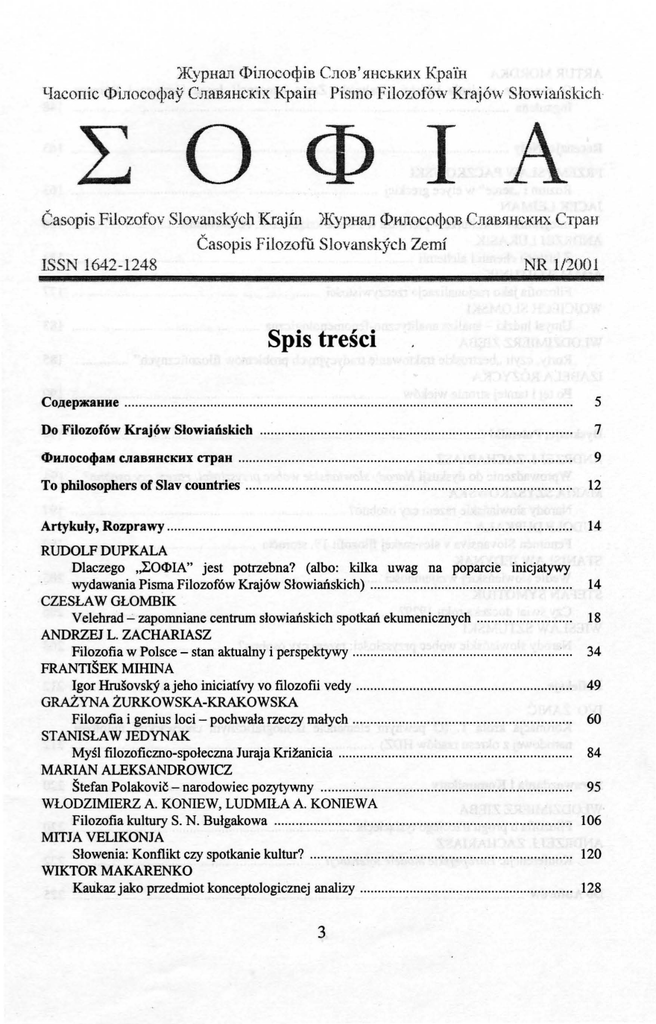 )KypHail <!)iJloco<pi B CIOS' 5/ IIChl,Jl X KpaUI Llaconic ~l>iJI()c()<J)ay CJl:aBRHCKix Kpain Pismo Filozofów Krajów Słowiallskich L:O<DIA Ćasopis Filozofov SIOVaJ.lSkYch Krajfn )KypHcUl WHJlOCO<]>OB CJmB51HcKHX GrpaH Ćasopis FilozotU Slovanskych ZemJ ISSN 1642-1248 NR 112001 Spis treści COAep*aUHe .......... ....................... ........... .... ............. ............ ...... ................................... ............ 5 Do Filozofów Kraj~w Słowiańskich ........................................................................................ 7 Cl»HJJOcocJIaM CJJaBHUCKHX crpau .... ............ .. ............. .......... . ........ ... .......... ..................... ... .. ..... 9 To philosophers of Slav countńes .............. .. ........... ........ ................... ............... ......... .............. 12 Artykuły, Rozprawy .................................... .............................................................. ................ 14 RUDOLFDUPKALA Dlaczego ,J;O<l>IA" jest potrzebna? (albo: kilka uwag na poparcie inicjatywy wydawania Pisma Filozofów Krajów Słowiańskich) ......................................................... 14 CZESŁAW GŁOMBIK Velehrad ..:. zapomniane centrum słowiańskich spotkań ekumenicznych ........................... ANDRZEJ L. ZACHARIASZ Filozofia w Polsce - stan aktualny i perspektywy .......................................................... :... FRANTISEK MIHINA Igor Hru~ovskY ajeho iniciatfvy vo filozofii vedy ............................................................. 18 34 49 GRAżYNA ŻURKOWSKA-KRAKOWSKA Filozofia i genius loci JEDYNAK pochwała rzeczy małych .............................................................. 60 STANISŁAW Myśl filozoficzno-społeczna Juraja Krifanicia .................................................................. 84 MARIAN ALEKSANDROWICZ Stefan Polaković - narodowiec pozytywny ................ ..................... .................................. 95 WŁODZIMIERZ A. KONIEW, LUDMIŁA A. KONIEWA Filozofia kultury S. N. Bułgakowa ...... .............................................................................. 106 MITJA VELIKONJA Słowenia: Konflikt czy spotkanie kultur? .......................................................................... 120 WIKTOR MAKARENKO Kaukaz jako przedmiot konceptologicznej analizy ............................................................ 128 3 ARTUR MORDKA O sposobie istnienia jakości idealnych. Zarys koncepcji Jeana Heringa i Romana Ingardena ........................................................................ ........... ........................................ 148 Recenzje, Noty ........................................................................................................................... 163 PRZEMYSŁAW PACZKOWSKI Rozum i "serce" w etyce greckiej .......... .. .................................. ........................................ JACEK LEJMAN Integralizm w kulturze - pierwsza w Polsce książka o P. A. Sorokinie .. .............. ............. ANDRZEJ ŁUKASIK Z historii chemii i alchemii .. .............. ...................... ................. ........ .............. ..... .............. ADAM WOJTUNIK Filozofiajako racjonalizacja rzeczywistości ........................................................ .. ............ WOJCIECH SŁOMSKI Umysł ludzki - analiza analityczno-fenomenologiczna ................................ .. ................... 163 168 173 177 183 WŁODZIMIERZ ZIĘBA Rorty, czyli "beztroskie traktowanie tradycyjnych problemów filozoficznych" ................ 185 IZABELA RÓŻYCKA Po tej i tamtej stronie wieków .................... ....................... ................................................. 190 Dyskusje, Polenliki .......................................................................................................... .......... 194 ANDRZEJ J. ZACHARIASZ Wprowadzenie do dyskusji Narody słowiańskie wobec przyszłości: razem czy osobno? MARIA SZYSZKOWSKA Narody słowiańskie razem czy osobno? ............ .. ........................................... .......... .. ....... . RUDOLFDUPKALA Fenomen Slovanstva v slovenskej filozofii 19. storoćia .................................................... STANISŁAW JEDYNAK Wedle słowiańskiej wzajemności ...... ................................................................................. STEFAN SYMOTIUK Czy świat doczeka roku 1929? .......... ................................................................................. WIESŁAW SZTUMSKI Narody słowiańskie wobec przyszłości: razem czy osobno? ........................ ...... ............... 194 197 199 205 206 208 Refleksje ....................................................... :................................................................... ......... 212 IVO ZANIĆ Koronacja króla T. (O pewnym elemencie ikonograficznym chorwackiej mitologii narodowej z okresu rzadów HDZ) .... ................................................................................. 212 Sprawozdania i Komunikaty ................... ................................................................................. 220 WŁODZIMIERZ ZIĘBA Filozofia u progu trzeciego tysiąclecia .................. .............................. ............................... 220 ANDRZEJ 1. ZACHARIASZ Konferencja: Europejskie modele tolerancji ....................................................................... 222 Do Autorów.... ............................... ............................................................................................ 225 4