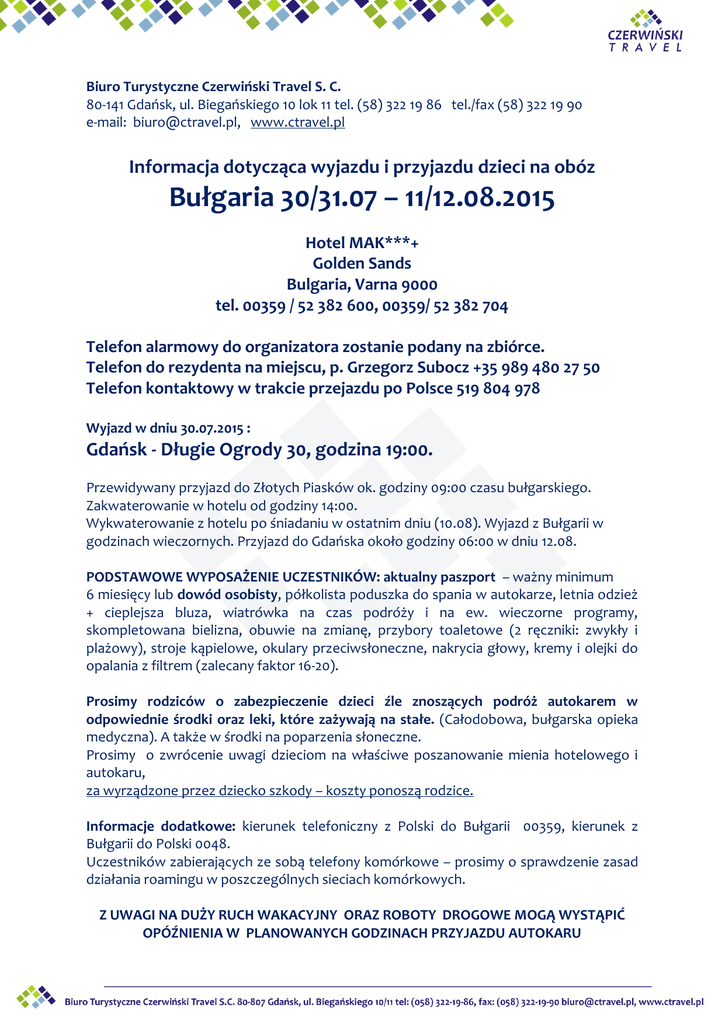 Biuro Turystyczne Czerwiński Travel S. C. 80-141 Gdańsk, ul. Biegańskiego 10 lok 11 tel. (58) 322 19 86 tel./fax (58) 322 19 90 e-mail: [email protected], www.ctravel.pl Informacja dotycząca wyjazdu i przyjazdu dzieci na obóz Bułgaria 30/31.07 – 11/12.08.2015 Hotel MAK***+ Golden Sands Bulgaria, Varna 9000 tel. 00359 / 52 382 600, 00359/ 52 382 704 Telefon alarmowy do organizatora zostanie podany na zbiórce. Telefon do rezydenta na miejscu, p. Grzegorz Subocz +35 989 480 27 50 Telefon kontaktowy w trakcie przejazdu po Polsce 519 804 978 Wyjazd w dniu 30.07.2015 : Gdańsk - Długie Ogrody 30, godzina 19:00. Przewidywany przyjazd do Złotych Piasków ok. godziny 09:00 czasu bułgarskiego. Zakwaterowanie w hotelu od godziny 14:00. Wykwaterowanie z hotelu po śniadaniu w ostatnim dniu (10.08). Wyjazd z Bułgarii w godzinach wieczornych. Przyjazd do Gdańska około godziny 06:00 w dniu 12.08. PODSTAWOWE WYPOSAŻENIE UCZESTNIKÓW: aktualny paszport – ważny minimum 6 miesięcy lub dowód osobisty, półkolista poduszka do spania w autokarze, letnia odzież + cieplejsza bluza, wiatrówka na czas podróży i na ew. wieczorne programy, skompletowana bielizna, obuwie na zmianę, przybory toaletowe (2 ręczniki: zwykły i plażowy), stroje kąpielowe, okulary przeciwsłoneczne, nakrycia głowy, kremy i olejki do opalania z filtrem (zalecany faktor 16-20). Prosimy rodziców o zabezpieczenie dzieci źle znoszących podróż autokarem w odpowiednie środki oraz leki, które zażywają na stałe. (Całodobowa, bułgarska opieka medyczna). A także w środki na poparzenia słoneczne. Prosimy o zwrócenie uwagi dzieciom na właściwe poszanowanie mienia hotelowego i autokaru, za wyrządzone przez dziecko szkody – koszty ponoszą rodzice. Informacje dodatkowe: kierunek telefoniczny z Polski do Bułgarii 00359, kierunek z Bułgarii do Polski 0048. Uczestników zabierających ze sobą telefony komórkowe – prosimy o sprawdzenie zasad działania roamingu w poszczególnych sieciach komórkowych. Z UWAGI NA DUŻY RUCH WAKACYJNY ORAZ ROBOTY DROGOWE MOGĄ WYSTĄPIĆ OPÓŹNIENIA W PLANOWANYCH GODZINACH PRZYJAZDU AUTOKARU