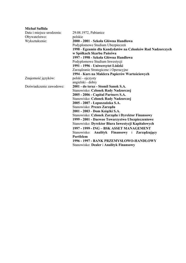 Michał Suflida Data i miejsce urodzenia: Obywatelstwo: Wykształcenie: Znajomość języków: Doświadczenie zawodowe: 29.08.1972, Pabianice polskie 2000 - 2001 - Szkoła Główna Handlowa Podyplomowe Studium Ubezpieczeń 1998 - Egzamin dla Kandydatów na Członków Rad Nadzorczych w Spółkach Skarbu Państwa 1997 - 1998 - Szkoła Główna Handlowa Podyplomowe Studium Inwestycji 1991 - 1996 - Uniwersytet Łódzki Zarządzanie Strategiczne i Operacyjne 1994 - Kurs na Maklera Papierów Wartościowych polski - ojczysty angielski - dobry 2001 - do teraz - Stomil Sanok S.A. Stanowisko: Członek Rady Nadzorczej 2005 - 2006 - Capital Partners S.A. Stanowisko: Członek Rady Nadzorczej 2005 - 2007 - Łopuszańska S.A. Stanowisko: Prezes Zarządu 2001 - 2003 - Dom Książki S.A. Stanowisko: Członek Zarządu i Dyrektor Finansowy 1999 - 2001 - Daewoo Towarzystwo Ubezpieczeniowe Stanowisko: Dyrektor Biura Inwestycji Kapitałowych 1997 - 1999 - ING – BSK ASSET MANAGEMENT Stanowisko: Analityk Finansowy i Zarządzający Portfelem 1996 - 1997 - BANK PRZEMYSŁOWO-HANDLOWY Stanowisko: Dealer i Analityk Finansowy