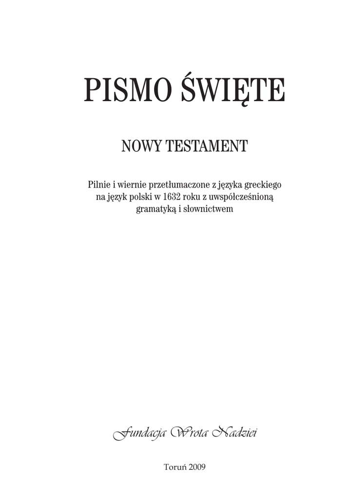 PISMO ŚWIĘTE NOWY TESTAMENT Pilnie i wiernie przetłumaczone z języka greckiego na język polski w 1632 roku z uwspółcześnioną gramatyką i słownictwem Fundacja Wrota Nadziei Toruń 2009 © 2009 Fundacja Wrota Nadziei Wydawca wyraża zgodę na kopiowanie i rozpowszechnianie całości lub części publikacji, jednak bez czerpania z tego korzyści finansowych i bez wprowadzania jakichkolwiek zmian. Powielanie do celów komercyjnych wymaga pisemnej zgody Fundacji. ISBN: 978-83-928953-0-5 (oprawa skóropodobna) ISBN: 978-83-928953-1-2 (oprawa skórzana) Wydawca: Fundacja Wrota Nadziei ul. Armii Ludowej 71b lok. 26 87-100 Toruń www.wrotanadziei.org Spis treści Strona Wykaz skrótów...........................................................VI Objaśnienie............................................................. VII Ewangelia Mateusza...................................................9 Ewangelia Marka......................................................49 Ewangelia Łukasza...................................................75 Ewangelia Jana.......................................................118 Dzieje Apostolskie..................................................151 List do Rzymian.......................................................192 I List do Koryntian..................................................210 II List do Koryntian................................................227 List do Galacjan......................................................239 List do Efezjan........................................................245 List do Filipian........................................................251 List do Kolosan........................................................255 I List do Tesaloniczan.............................................259 II List do Tesaloniczan...........................................263 I List do Tymoteusza...............................................265 II List do Tymoteusza.............................................270 List do Tytusa..........................................................274 List do Filemona.....................................................276 List do Hebrajczyków..............................................277 List Jakuba..............................................................290 I List Piotra.............................................................295 II List Piotra............................................................300 I List Jana................................................................303 II List Jana..............................................................308 III List Jana.............................................................309 List Judy..................................................................310 Objawienie Jana......................................................312 Mapy.........................................................................332 V Wykaz skrótów Stary Testament Nowy Testament Księga Rodzaju........................... Rdz Księga Wyjścia............................ Wj Księga Kapłańska....................... Kpł Księga Liczb............................... Lb Księga Powtórzonego Prawa..... Pwt Księga Jozuego........................... Joz Księga Sędziów........................... Sdz Księga Rut.................................. Rt I Księga Samuela....................... 1Sm II Księga Samuela...................... 2Sm I Księga Królewska.................... 1Krl II Księga Królewska................... 2Krl I Księga Kronik.......................... 1Krn II Księga Kronik......................... 2Krn Księga Ezdrasza......................... Ezd Księga Nehemiasza.................... Ne Księga Estery.............................. Est Księga Hioba............................... Hi Księga Psalmów......................... Ps Przypowieści Salomona............. Prz Księga Kaznodziei...................... Kaz Pieśni nad Pieśniami................. Pnp Księga Izajasza........................... Iz Księga Jeremiasza..................... Jr Lamentacje................................. Lm Księga Ezechiela........................ Ez Księga Daniela........................... Dn Księga Ozeasza........................... Oz Księga Joela............................... Jl Księga Amosa............................. Am Księga Abdiasza......................... Ab Księga Jonasza........................... Jon Księga Micheasza....................... Mi Księga Nahuma.......................... Na Księga Habakuka........................ Ha Księga Sofoniasza...................... So Księga Aggeusza......................... Ag Księga Zachariasza.................... Za Księga Malachiasza.................... Ml Ewangelia Mateusza.........Mt Ewangelia Marka..............Mk Ewangelia Łukasza...........Łk Ewangelia Jana.................J Dzieje Apostolskie............Dz List do Rzymian.................Rz I List do Koryntian............1Kor II List do Koryntian..........2Kor List do Galacjan................Ga List do Efezjan..................Ef List do Filipian..................Flp List do Kolosan..................Kol I List do Tesaloniczan.......1Tes II List do Tesaloniczan.....2Tes I List do Tymoteusza.........1Tm II List do Tymoteusza.......2Tm List do Tytusa....................Tt List do Filemona...............Flm List do Hebrajczyków........Hbr List Jakuba........................Jk I List Piotra.......................1P II List Piotra......................2P I List Jana..........................1J II List Jana........................2J III List Jana.......................3J List Judy............................Jud Objawienie Jana................Obj VI Objaśnienia I. Odnośniki 1) J 15,2.4 Ew. Jana, rozdział 15, wersety 2 i 4 2) ww. 15.32 w. dotyczy wersetów 15 i 32 w tym rozdziale 3) J 3,16; 5,24 Ew. Jana, rozdział 3, werset 16 oraz Ew. Jana, rozdział 5, werset 24 II. Słowa pisane w środkowej kolumnie 1) występują w Biblii Gdańsk