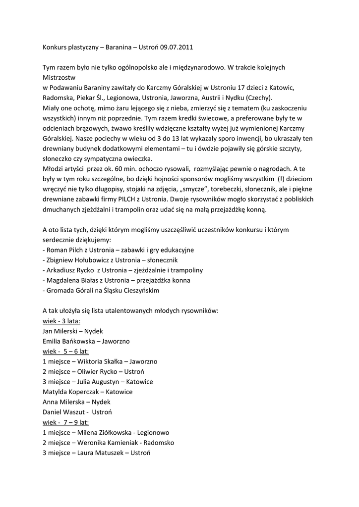 Konkurs plastyczny – Baranina – Ustroń 09.07.2011 Tym razem było nie tylko ogólnopolsko ale i międzynarodowo. W trakcie kolejnych Mistrzostw w Podawaniu Baraniny zawitały do Karczmy Góralskiej w Ustroniu 17 dzieci z Katowic, Radomska, Piekar Śl., Legionowa, Ustronia, Jaworzna, Austrii i Nydku (Czechy). Miały one ochotę, mimo żaru lejącego się z nieba, zmierzyć się z tematem (ku zaskoczeniu wszystkich) innym niż poprzednie. Tym razem kredki świecowe, a preferowane były te w odcieniach brązowych, żwawo kreśliły wdzięczne kształty wyżej już wymienionej Karczmy Góralskiej. Nasze pociechy w wieku od 3 do 13 lat wykazały sporo inwencji, bo ukraszały ten drewniany budynek dodatkowymi elementami – tu i ówdzie pojawiły się górskie szczyty, słoneczko czy sympatyczna owieczka. Młodzi artyści przez ok. 60 min. ochoczo rysowali, rozmyślając pewnie o nagrodach. A te były w tym roku szczególne, bo dzięki hojności sponsorów mogliśmy wszystkim (!) dzieciom wręczyć nie tylko długopisy, stojaki na zdjęcia, „smycze”, torebeczki, słonecznik, ale i piękne drewniane zabawki firmy PILCH z Ustronia. Dwoje rysowników mogło skorzystać z pobliskich dmuchanych zjeżdżalni i trampolin oraz udać się na małą przejażdżkę konną. A oto lista tych, dzięki którym mogliśmy uszczęśliwić uczestników konkursu i którym serdecznie dziękujemy: - Roman Pilch z Ustronia – zabawki i gry edukacyjne - Zbigniew Hołubowicz z Ustronia – słonecznik - Arkadiusz Rycko z Ustronia – zjeżdżalnie i trampoliny - Magdalena Białas z Ustronia – przejażdżka konna - Gromada Górali na Śląsku Cieszyńskim A tak ułożyła się lista utalentowanych młodych rysowników: wiek - 3 lata: Jan Milerski – Nydek Emilia Bańkowska – Jaworzno wiek - 5 – 6 lat: 1 miejsce – Wiktoria Skałka – Jaworzno 2 miejsce – Oliwier Rycko – Ustroń 3 miejsce – Julia Augustyn – Katowice Matylda Koperczak – Katowice Anna Milerska – Nydek Daniel Waszut - Ustroń wiek - 7 – 9 lat: 1 miejsce – Milena Ziółkowska - Legionowo 2 miejsce – Weronika Kamieniak - Radomsko 3 miejsce – Laura Matuszek – Ustroń Mateusz Milerski – Nydek Martyna Szewczyk – Radomsko Jan Lepuscian – Austria wiek - 10 – 13 lat: 1 miejsce – Emil Ziółkowski - Legionowo 2 miejsce – ex. Paulina Kołeczko i Magda Kołeczko – Piekary Śląskie Wszystkim dzieciom i ich rodzicom dziękujemy za przybycie i do zobaczenia za rok. Nad konkursem czuwali Joanna i Marcin Pyka. Czujnie z boku nadzorował Zbigniew Niemiec. Joanna Pyka – Organizator główny konkursu