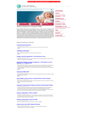 Zrzut strony: http://rozrodczosc.pl/ptmr/ <--kliknij na adresie Wyszukaj... AKTUALNOŚCI Najnowsze wydarzenia i informacje STATUT Przedstawienie założeń i polityki PTMR DOKUMENTY PTMR Nasze dokumenty REKOMENDACJE Rekomendacje dotyczące diagnstki i leczenia WŁADZE Stanowiska osób funkcyjnych w PTMR STANDARDY PTMR Standardy w zakresie norm i wposażenia klinik Witamy serdecznie na stronach PTMR! Polskie Towarzystwo Medycyny Rozrodu to stowarzyszenie mające za zadanie szerzenie i doskonalenie zasad deontologii lekarskiej, podnoszenie kwalifikacji zawodowych i poziomu naukowego Członków Towarzystwa oraz autorytetu w społeczeństwie dla profesjonalistów zajmujących się embriologią kliniczną i medycyną wspomaganego rozrodu. PTMR współdziała z organami administracji państwowej, instytucjami naukowymi oraz towarzystwami naukowymi, a w szczególności z Polskim Towarzystwem Ginekologicznym, Towarzystwem Biologii Rozrodu, European Society for Human Reproduction and Embryology, IFFS, ASRM oraz stowarzyszeniami wyższej użyteczności pracującymi na rzecz ochrony zdrowia. Zadaniem PTMR jest również stała ochrona interesów i praw profesjonalistów zajmujących się embriologią kliniczną i medycyną wspomaganego rozrodu, zapewnienie wysokiej jakości usług świadczonych przez instytucje zajmujące się embriologią kliniczną i medycyną rozrodu, poprzez prawnie dopuszczalne formy nadzoru oraz reprezentowanie embriologii klinicznej oraz dziedzin pokrewnych i ich osiągnięć naukowych w kraju i za granicą. Najnowsze wydarzenia i informacje Ludwig-Fraenkel Symposium Dodano dnia 24/03/2013 o godzinie 20:49 (CET) Ludwig-Fraenkel Symposium: Endocrine Control of Corpus Luteum Function, Wrocław 5-6.09.2013 [Więcej] Certyfikacja embriologów Dodano dnia 19/02/2013 o godzinie 21:20 (CET) Program certyfikacji embriologów Polskiego Towarzystwa Medycyny Rozrodu. [Więcej] Postępy w leczeniu niepłodności - 25 lat dziecka po In vitro Dodano dnia 11/02/2013 o godzinie 23:57 (CET) Zapraszamy do zapoznania się z nagraniami video z Międzynarodowego Kongresu Medycznego: "Postępy w leczeniu niepłodności - 25 lat dziecka po In vitro" [Więcej] Konferencja "Postępy w leczeniu niepłodności – 25 lat dziecka z In vitro" Białystok, 16-17 listopada 2012 Dodano dnia 3/11/2012 o godzinie 10:15 (CET) Konferencja kierowana jest do lekarzy ginekologów, urologów, seksuologów i endokrynologów i poświęcona będzie najnowszym trendom w diagnostyce i leczeniu niepłodności. Wybitni eksperci reprezentujący różne dyscypliny medyczne przedstawią w bardzo praktycznym ujęciu najważniejsze problemy dotyczące skuteczności i bezpieczeństwa leczenia niepłodności. [Więcej] Stanowisko PTMR i SPiN Dodano dnia 11/07/2012 o godzinie 01:34 (CEST) Stanowisko PTMR i SPiN wobec sytuacji politycznej w sprawie regulacji prawnej leczenia nieplodności metodą pozaustrojowego zaplodnienia [Więcej] Opinia PTMR o zmianie ustawy o zawodach lekarza i lekarza dentysty Dodano dnia 18/05/2012 o godzinie 21:59 (CEST) Opinia Polskiego Towarzystwa Medycyny Rozrodu do poselskiego projektu ustawy o zmianie ustawy z dnia 5 grudnia 1996 roku o zawodach lekarza i lekarza dentysty. [Więcej] Sympozjum Endokrynologia i Medycyna Rozrodu dla Ginekologa Praktyka Dodano dnia 24/01/2012 o godzinie 23:46 (CET) W imieniu Sekcji Płodności i Niepłodności Polskiego Towarzystwa Ginekologicznego i Polskiego Towarzystwa Medycyny Rozrodu, zachęcamy gorąco wszystkich zainteresowanych problematyką diagnostyki i leczenia niepłodności, biologią procesów rozrodczych oraz zagadnieniami endokrynologii ginekologicznej i andrologicznej do udziału w Sympozjum Endokrynologii i Medycyny Rozrodu dla Ginekologa Praktyka. [Więcej] Kongres "Niepłodność - klinika i praktyka" Dodano dnia 18/06/2011 o godzinie 14:40 (CEST) Zapraszamy na II Sympozjum „Niepłodność – klinika i praktyka”, które odbędzie się w dniach 25-26 listopada 2011 oraz warsztaty z zakresu inseminacji domacicznej (24 listopad 2011). Sympozjum organizowane jest pod patronatem Polskiego Towarzystwa Medycyny Rozrodu. [Więcej] Zebranie sprawozdawczo-wyborcze PTMR Dodano dnia 23/05/2011 o godzinie 20:53 (CEST) Zebranie sprawozdawczo-wyborcze PTMR - Gdańsk, 24 czerwca 2011. [Więcej] Zmiana terminu kursu IMM - Medycyna Rozrodu Dodano dnia 15/02/2011 o godzinie 19:59 (CET) Z przyczyn niezależnych nastąpiło przesunięcie terminu kursu International Meetings of Medicine - Medycyna Rozrodu na 24-25 czerwca 2011r. [Więcej] STANOWISKO ws. ART Stanowisko Komisji Bioetycznej w sprawie leczenia niepłodności metodami rozrodu wspomaganego medycznie LINKI Odnośniki do innych stron KONTAKT Dane kontatowe naszej organizacji KLINIKI PTMR Wykaz klinik będących członkami PTMR Zrzut strony: http://rozrodczosc.pl/ptmr/ <--kliknij na adresie Rozpoczęcie współpracy z czasopismem Dodano dnia 15/02/2011 o godzinie 19:47 (CET) Polskie Towarzystwo Medycyny Rozrodu i Sekcja Płodnosci i Niepłodności PTG rozpoczynają ścisłą współpracę z czasopismem "Położnictwo, ginekologia i medycyna rozrodu". [Więcej] Kurs IMM - Medycyna Rozrodu - "Zaburzenia jajeczkowania" Dodano dnia 17/01/2011 o godzinie 17:32 (CET) Serdecznie zapraszamy do udziału w I kursie z cyklu: International Meetings of Medicine - Medycyna Rozrodu „Zaburzenia jajeczkowania”, które odbędzie się w Gdańsku w dniach 24-25.06.2011r. Kurs będzie kontynuacją szkoleń organizowanych przez Sekcję Płodności i Niepłodności Polskiego Towarzystwa Ginekologicznego, Polskie Towarzystwo Medycyny Rozrodu oraz ITMC. [Więcej] Odpowiedź na list z Gazety Lekarskiej 01/2011 Dodano dnia 10/01/2011 o godzinie 18:59 (CET) W pierwszym numerze Gazety Lekarskiej w 2011 ukazały sie dwa listy dr hab Andrzeja Lewandowicza i dr Sławomira Graafa dotyczące leczenia niepłodności metodą pozaustrojowego zapłodnienia. W imieniu Sekcji Płodności i Niepłodności Polskiego Towarzystwa Ginekologicznego or