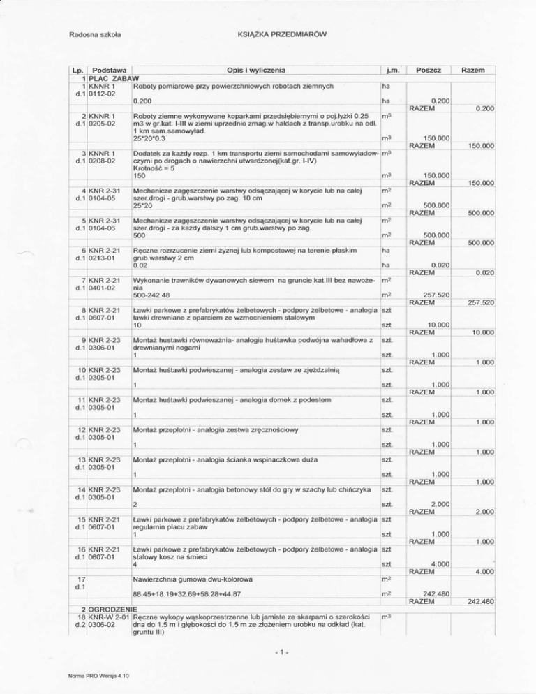 KslĄżXA PRZED|!'IARÓW d' I 020802 kat9r |.|V) ąym| po dtogacho n.w|e?chn|uhłard/ońej' Kotńość- 5 150 m3 4 KNR 2.31 d.l 0104-05 Mechanicze zagęszeenie warstwyodsą@ją@j w kolycie |Ubna calej po zaq. 10 cm sze..drogi-grub.warstlvy 5 KNR 2 3I d l 0104.06 0104.06 lltechani?e/agęsfcreń'ewaE|ł"yodsącfająejs korycie|ubna ałej qlubwa6h'v pofag da|3zvI cn cn glubwa6h'v sŹe.droo|.fa'afdy da|3zy sŹe.drog|.fa Dofaq 'afdv 500 m, Ręene rozru@nieziemiżyznei|ub kornpostow€na j terenieptaskm ha 6 KNR 2'2] d.10213-01 7KNR2'21 d 1 040r-02 8 KNR 2 2, d 10607.0l 25'20 grub.warsw2 cm sierem na grunciekat |||beznawoże-m2 WykonanietrawnikÓw dylvanowych 5oa 242 48 ńf . podporyfe|betowe.ańa|og'asft Lawh|pJl\owef pre.abrykaow że|b€ t owych łał|idlowniane z oparcom fe wfmocnieniem sla|owym szt 9 KNF 2-23 d.1 0306-01 1o KNR 2.23 d I 0305-0r | 1 KNR 2 '23 d 1 0305-ol 12 KNR 2.23 dI I 0'05-01 0305-0t Sft. Montaz husldwk' podwEsfane] . ara|og|ddoT€ | . f podeslem r fl 1s slółdogryW*achy |ubchińczyka szt' Montażpżep]otni.ana|ogiabetonowy 17 1 RAfEM 150.000 FłAZEM 5oo.00o ^^-500.00 500.000 RAZEM 251 fl4ZEM 1o'oo FAZEM 1 FAZEM 1 1 14 KNR 2'23 d.t o3o5-01 .6KNR2.2I d I 0607.0I 15Ó'ooo p.zep.olńi.ana|ogia lL4ontaz fesMa f.ężnoścbwy puep'otn| Motaż pŹeplotni. Monta.ż Montaż oŹeolotni. ' ana|ogia ana|og|a ana|ooia ści.ńhswspinac/kowa ścianka wso|nacŹkowduża wspinacŹkowa ou/a d.l 0607'01 1 RAZEM szt. 1 13 KNt KNR 2 23 d13 15KNR22I 0 200 RAZEM podwigszanej. an6|ogia festaw ze 4eżdza|nią l/lontażhuśtawki 1 RAZEM sft ls sA l aw||pańowe7 plefóbryhalow ze be|owychpodporyże|oeowe. Jra|og|d5/l sla|owv|osf na śm€ c i szt 4 Nawieuchniagumowadwu-kojorowa 8A.45+1a.19+32 69+58.28+44.87 m2 I 2 OGROOZENIE ,1 1 0 .0 0 0 1 000 J 000 1 .0 0 0 1 000 RAZEM 1 .0 0 0 2.000 Lawk|pańowe f p|etabryk.tow/e belowych. podpoł fe|De|owe. a.ó|og|a sft legu|ańinp|Źcufabaw 1 257.520 RAZEM szt 2 0.020 1.000 RAZEI\,I 1 000 4 0O0l RAILIV 4 ópo 242 484 r*rEr\,. KS|ĄŹKA PRfEoM|ARÓW i0.15m3w kat' l-tl| upzsdn|o znagazynowansj w hałdachi ilan.po.tem urobkusamo. l s.mowyładow.żyńina od|egłość do 1 km NaKady użupoIf,iaiąc€za klżdo da|€zg rozpo.2ęb 0.5 kln trampońU pona( l km s€mocnodami samowyladowEymi po t.runle |Ubdrcgach gruntowycn i9 z łatl doggk- 3aach9!ow6z ||s!a' o ro*law|€ co 10 cm 3m I fuftki1mz siadł w ramach gta|owychns gololvycł1słupkachf pa36ń do|nymu btachyo tvyso' koścl25 cm : .n.|ogis drcT/nIlnsbrańa z furt -2-
