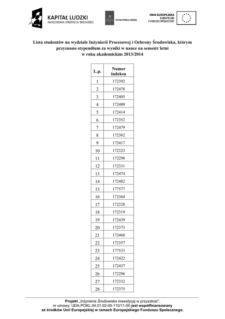 Lista studentów na wydziale Inżynierii Procesowej i Ochrony Środowiska, którym przyznano stypendium za wyniki w nauce na semestr letni w roku akademickim 2013/2014 L.p. Numer indeksu 1 172392 2 172478 3 172405 4 172480 5 172414 6 172352 7 172479 8 172362 9 172417 10 172323 11 172298 12 172331 13 172474 14 172482 15 177577 16 172364 17 172328 18 172319 19 172439 20 172373 21 172468 22 172357 23 177533 24 172422 25 172437 26 172296 27 172332 28 172375 Projekt „Inżynieria Środowiska inwestycją w przyszłość”, nr umowy: UDA-POKL.04.01.02-00-110/11-00 jest współfinansowany ze środków Unii Europejskiej w ramach Europejskiego Funduszu Społecznego. 29 172370 30 172407 31 172305 32 172469 33 172309 34 172355 35 172384 36 172477 37 172343 38 172337 39 172378 40 172335 41 172444 42 172453 43 172412 44 172341 45 172404 46 172415 47 172306 48 172462 Projekt „Inżynieria Środowiska inwestycją w przyszłość”, nr umowy: UDA-POKL.04.01.02-00-110/11-00 jest współfinansowany ze środków Unii Europejskiej w ramach Europejskiego Funduszu Społecznego. Lista studentów na wydziale Budownictwa, Architektury i Inżynierii Środowiska, którym przyznano stypendium za wyniki w nauce na semestr letni w roku akademickim 2013/2014 L.p. Numer indeksu 1 172965 2 172823 3 172882 4 172875 5 172847 6 172953 7 172825 8 172932 9 172949 10 172870 11 172827 12 172832 13 172856 14 172952 15 172824 16 172900 17 172890 18 172911 19 172958 20 172796 21 172799 22 172869 23 172942 24 172897 25 172936 26 172820 27 172981 28 176937 Projekt „Inżynieria Środowiska inwestycją w przyszłość”, nr umowy: UDA-POKL.04.01.02-00-110/11-00 jest współfinansowany ze środków Unii Europejskiej w ramach Europejskiego Funduszu Społecznego. 29 172860 30 172850 31 172901 32 172931 33 172884 34 172877 35 172894 36 172804 37 172863 38 163239 39 172948 40 172826 41 163212 42 172938 43 172819 44 172838 45 172801 46 163215 47 172915 48 172963 49 172976 50 172977 51 172802 52 172864 53 172880 54 185687 55 172899 56 172969 Projekt „Inżynieria Środowiska inwestycją w przyszłość”, nr umowy: UDA-POKL.04.01.02-00-110/11-00 jest współfinansowany ze środków Unii Europejskiej w ramach Europejskiego Funduszu Społecznego.