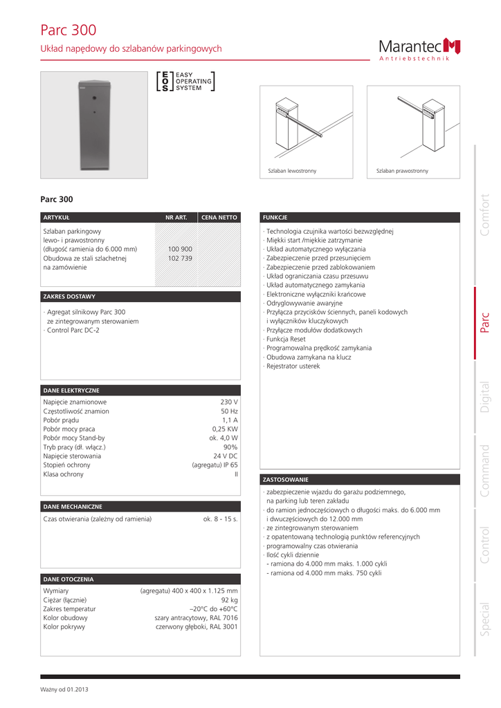 Parc 300 Układ napędowy do szlabanów parkingowych Parc 300 FUNKCJE · Technologia czujnika wartości bezwzględnej · Miękki start /miękkie zatrzymanie · Układ automatycznego wyłączania · Zabezpieczenie przed przesunięciem · Zabezpieczenie przed zablokowaniem · Układ ograniczania czasu przesuwu · Układ automatycznego zamykania · Elektroniczne wyłączniki krańcowe · Odryglowywanie awaryjne · Przyłącza przycisków ściennych, paneli kodowych i wyłączników kluczykowych · Przyłącze modułów dodatkowych · Funkcja Reset · Programowalna prędkość zamykania · Obudowa zamykana na klucz · Rejestrator usterek 100 900 102 739 ZAKRES DOSTAWY · Agregat silnikowy Parc 300 ze zintegrowanym sterowaniem · Control Parc DC-2 Digital Szlaban parkingowy lewo- i prawostronny (długość ramienia do 6.000 mm) Obudowa ze stali szlachetnej na zamówienie CENA NETTO DANE ELEKTRYCZNE 230 V 50 Hz 1,1 A 0,25 KW ok. 4,0 W 90% 24 V DC (agregatu) IP 65 II Napięcie znamionowe Częstotliwość znamion Pobór prądu Pobór mocy praca Pobór mocy Stand-by Tryb pracy (dł. włącz.) Napięcie sterowania Stopień ochrony Klasa ochrony DANE MECHANICZNE Czas otwierania (zależny od ramienia) ok. 8 - 15 s. ZASTOSOWANIE · zabezpieczenie wjazdu do garażu podziemnego, na parking lub teren zakładu · do ramion jednoczęściowych o długości maks. do 6.000 mm i dwuczęściowych do 12.000 mm · ze zintegrowanym sterowaniem · z opatentowaną technologią punktów referencyjnych · programowalny czas otwierania · Ilość cykli dziennie - ramiona do 4.000 mm maks. 1.000 cykli - ramiona od 4.000 mm maks. 750 cykli Command NR ART. Control ARTYKUŁ Comfort Szlaban prawostronny Parc Szlaban lewostronny Wymiary Ciężar (łącznie) Zakres temperatur Kolor obudowy Kolor pokrywy Ważny od 01.2013 (agregatu) 400 x 400 x 1.125 mm 92 kg –20°C do +60°C szary antracytowy, RAL 7016 czerwony głęboki, RAL 3001 Special DANE OTOCZENIA Akcesoria Ramię szlabanu Ramię szlabanu z profilem gumowym ARTYKUŁ NR ART. CENA NETTO ARTYKUŁ NR ART. CENA NETTO Parc 200 Ramię szlabanu, 3.000 mm Ramię szlabanu, 4.000 mm 95 500 95 501 Parc 200 Ramię szlabanu, 3.000 mm Ramię szlabanu, 4.000 mm 89 362 89 363 Parc 300 Ramię szlabanu, 4.000 mm Ramię szlabanu, 5.000 mm Ramię szlabanu, 6.000 mm 102 791 95 502 95 503 Parc 300 Ramię szlabanu, 4.000 mm Ramię szlabanu, 5.000 mm Ramię szlabanu, 6.000 mm 102 790 89 364 89 365 Parc 400 Ramię szlabanu, 8.000 mm w opracowaniu Parc 400 Ramię szlabanu, 8.000 mm w opracowaniu ZAKRES DOSTAWY ZAKRES DOSTAWY · Ramię szlabanu, 1-częściowe · Opakowanie: 1 sztuka · Ramię szlabanu, 1-częściowe, z profilem gumowym · Opakowanie: 1 sztuka FUNKCJE / ZASTOSOWANIE FUNKCJE / ZASTOSOWANIE · zabezpieczenie wjazdu do garażu podziemnego, na parking lub teren zakładu · do montażu prawo- lub lewostronnego na kolumnie szlabanu Parc 200 · zabezpieczenie wjazdu do garażu podziemnego, na parking lub teren zakładu · do montażu prawo- lub lewostronnego na kolumnie szlabanu Parc 200 DANE TECHNICZNE / SPECYFIKACJE DANE TECHNICZNE / SPECYFIKACJE Długość ramienia 3.300 mm 4.300 mm Szerokość 3.000 mm 4.000 mm Ciężar 5,8 kg 7,6 kg Długość ramienia 3.300 mm 4.300 mm Szerokość 3.000 mm 4.000 mm Ciężar 7 kg 9,1 kg Special Control Command Digital Parc Comfort Parc 200, 300 Ważny od 01.2013