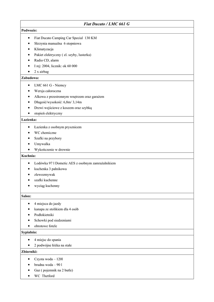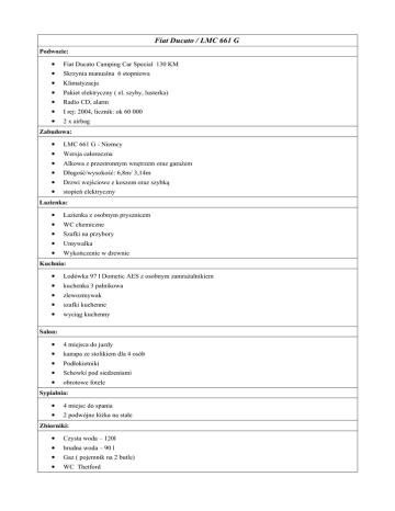 Fiat Ducato / LMC 661 G Podwozie: ● Fiat Ducato Camping Car Special 130 KM ● Skrzynia manualna 6 stopniowa ● Klimatyzacja ● Pakiet elektryczny ( el. szyby, lusterka) ● Radio CD, alarm ● I rej: 2004, licznik: ok 60 000 ● 2 x airbag Zabudowa: ● LMC 661 G - Niemcy ● Wersja całoroczna ● Alkowa z przestronnym wnętrzem oraz garażem ● Długość/wysokość: 6,8m/ 3,14m ● Drzwi wejściowe z koszem oraz szybką ● stopień elektryczny Łazienka: ● Łazienka z osobnym prysznicem ● WC chemiczne ● Szafki na przybory ● Umywalka ● Wykończenie w drewnie Kuchnia: ● Lodówka 97 l Dometic AES z osobnym zamrażalnikiem ● kuchenka 3 palnikowa ● zlewozmywak ● szafki kuchenne ● wyciąg kuchenny Salon: ● 4 miejsca do jazdy ● kanapa ze stolikiem dla 4 osób ● Podłokietniki ● Schowki pod siedzeniami ● obrotowe fotele Sypialnia: ● 4 miejsc do spania ● 2 podwójne łóżka na stałe Zbiorniki: ● Czysta woda – 120l ● brudna woda – 90 l ● Gaz ( pojemnik na 2 butle) ● WC Thetford Fiat Ducato / LMC 661 G Dodatki: ● Markiza ● Okno panoramiczne Heki ● Bagażnik na 4 rowery ● TV DVD 15 '' 12 V ● Zestaw TV ● Pakiet Startowy ( przyłącz 230V, wąż do wody, płyn do WC, woda 30 % zbiornika ● Ubezpieczenie Auto Casco, OC, NW, zielona karta, assistance Generali LUX
