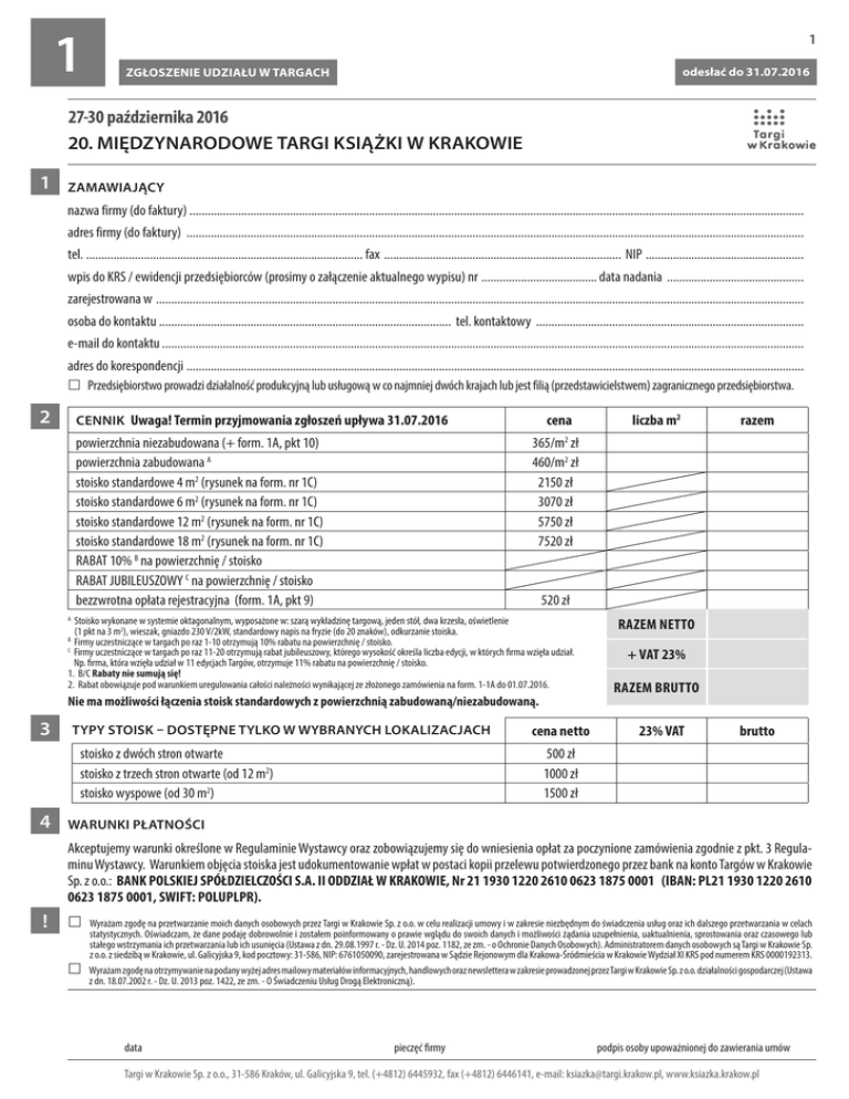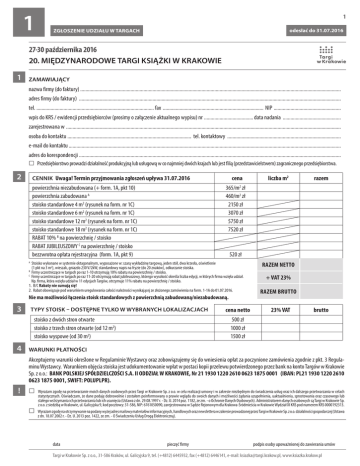 1 1 odesłać do 31.07.2016 ZGŁOSZENIE UDZIAŁU W TARGACH 27-30 października 2016 20. MIĘDZYNARODOWE TARGI KSIĄŻKI W KRAKOWIE 1 ZAMAWIAJĄCY nazwa firmy (do faktury) ........................................................................................................................................................................................................... adres firmy (do faktury) ............................................................................................................................................................................................................ tel. ............................................................................................ fax ............................................................................... NIP ..................................................... wpis do KRS / ewidencji przedsiębiorców (prosimy o załączenie aktualnego wypisu) nr ....................................... data nadania ............................................. zarejestrowana w ...................................................................................................................................................................................................................... osoba do kontaktu ................................................................................................. tel. kontaktowy ......................................................................................... e-mail do kontaktu ................................................................................................................................................................................................................... adres do korespondencji ............................................................................................................................................................................................................ ££ Przedsiębiorstwo prowadzi działalność produkcyjną lub usługową w co najmniej dwóch krajach lub jest filią (przedstawicielstwem) zagranicznego przedsiębiorstwa. 2 CENNIK Uwaga! Termin przyjmowania zgłoszeń upływa 31.07.2016 powierzchnia niezabudowana (+ form. 1A, pkt 10) powierzchnia zabudowana A stoisko standardowe 4 m2 (rysunek na form. nr 1C) stoisko standardowe 6 m2 (rysunek na form. nr 1C) stoisko standardowe 12 m2 (rysunek na form. nr 1C) stoisko standardowe 18 m2 (rysunek na form. nr 1C) RABAT 10% B na powierzchnię / stoisko RABAT JUBILEUSZOWY C na powierzchnię / stoisko bezzwrotna opłata rejestracyjna (form. 1A, pkt 9) cena liczba m2 razem 365/m zł 460/m2 zł 2150 zł 3070 zł 5750 zł 7520 zł 2 520 zł Stoisko wykonane w systemie oktagonalnym, wyposażone w: szarą wykładzinę targową, jeden stół, dwa krzesła, oświetlenie (1 pkt na 3 m2), wieszak, gniazdo 230 V/2kW, standardowy napis na fryzie (do 20 znaków), odkurzanie stoiska. Firmy uczestniczące w targach po raz 1-10 otrzymują 10% rabatu na powierzchnię / stoisko. C Firmy uczestniczące w targach po raz 11-20 otrzymują rabat jubileuszowy, którego wysokość określa liczba edycji, w których firma wzięła udział. Np. firma, która wzięła udział w 11 edycjach Targów, otrzymuje 11% rabatu na powierzchnię / stoisko. 1. B/C Rabaty nie sumują się! 2. Rabat obowiązuje pod warunkiem uregulowania całości należności wynikającej ze złożonego zamówienia na form. 1-1A do 01.07.2016. A RAZEM NETTO B Nie ma możliwości łączenia stoisk standardowych z powierzchnią zabudowaną/niezabudowaną. 3 TYPY STOISK – DOSTĘPNE TYLKO W WYBRANYCH LOKALIZACJACH stoisko z dwóch stron otwarte stoisko z trzech stron otwarte (od 12 m2) stoisko wyspowe (od 30 m2) 4 cena netto + VAT 23% RAZEM BRUTTO 23% VAT brutto 500 zł 1000 zł 1500 zł WARUNKI PŁATNOŚCI Akceptujemy warunki określone w Regulaminie Wystawcy oraz zobowiązujemy się do wniesienia opłat za poczynione zamówienia zgodnie z pkt. 3 Regulaminu Wystawcy. Warunkiem objęcia stoiska jest udokumentowanie wpłat w postaci kopii przelewu potwierdzonego przez bank na konto Targów w Krakowie Sp. z o.o.: BANK POLSKIEJ SPÓŁDZIELCZOŚCI S.A. II ODDZIAŁ W KRAKOWIE, Nr 21 1930 1220 2610 0623 1875 0001 (IBAN: PL21 1930 1220 2610 0623 1875 0001, SWIFT: POLUPLPR). ! ££ Wyrażam zgodę na przetwarzanie moich danych osobowych przez Targi w Krakowie Sp. z o.o. w celu realizacji umowy i w zakresie niezbędnym do świadczenia usług oraz ich dalszego przetwarzania w celach ££ statystycznych. Oświadczam, że dane podaję dobrowolnie i zostałem poinformowany o prawie wglądu do swoich danych i możliwości żądania uzupełnienia, uaktualnienia, sprostowania oraz czasowego lub stałego wstrzymania ich przetwarzania lub ich usunięcia (Ustawa z dn. 29.08.1997 r. - Dz. U. 2014 poz. 1182, ze zm. - o Ochronie Danych Osobowych). Administratorem danych osobowych są Targi w Krakowie Sp. z o.o. z siedzibą w Krakowie, ul. Galicyjska 9, kod pocztowy: 31-586, NIP: 6761050090, zarejestrowana w Sądzie Rejonowym dla Krakowa-Śródmieścia w Krakowie Wydział XI KRS pod numerem KRS 0000192313. Wyrażam zgodę na otrzymywanie na podany wyżej adres mailowy materiałów informacyjnych, handlowych oraz newslettera w zakresie prowadzonej przez Targi w Krakowie Sp. z o.o. działalności gospodarczej (Ustawa z dn. 18.07.2002 r. - Dz. U. 2013 poz. 1422, ze zm. - O Świadczeniu Usług Drogą Elektroniczną). data pieczęć firmy podpis osoby upoważnionej do zawierania umów Targi w Krakowie Sp. z o.o., 31-586 Kraków, ul. Galicyjska 9, tel. (+4812) 6445932, fax (+4812) 6446141, e-mail: [email protected], www.ksiazka.krakow.pl 1A 2 odesłać do 31.07.2016 ZGŁOSZENIE UDZIAŁU W TARGACH 27-30 października 2016 20. MIĘDZYNARODOWE TARGI KSIĄŻKI W KRAKOWIE nazwa firmy ....................................................................................................................................................................................... 5 NAPIS NA