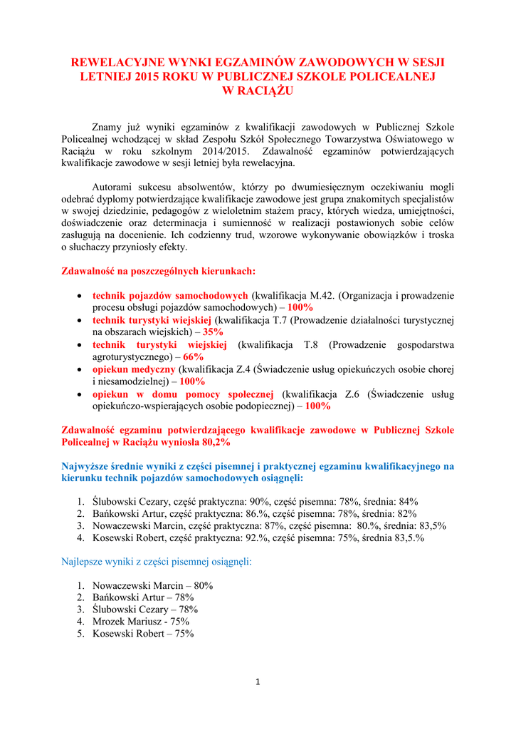REWELACYJNE WYNKI EGZAMINÓW ZAWODOWYCH W SESJI LETNIEJ 2015 ROKU W PUBLICZNEJ SZKOLE POLICEALNEJ W RACIĄŻU Znamy już wyniki egzaminów z kwalifikacji zawodowych w Publicznej Szkole Policealnej wchodzącej w skład Zespołu Szkół Społecznego Towarzystwa Oświatowego w Raciążu w roku szkolnym 2014/2015. Zdawalność egzaminów potwierdzających kwalifikacje zawodowe w sesji letniej była rewelacyjna. Autorami sukcesu absolwentów, którzy po dwumiesięcznym oczekiwaniu mogli odebrać dyplomy potwierdzające kwalifikacje zawodowe jest grupa znakomitych specjalistów w swojej dziedzinie, pedagogów z wieloletnim stażem pracy, których wiedza, umiejętności, doświadczenie oraz determinacja i sumienność w realizacji postawionych sobie celów zasługują na docenienie. Ich codzienny trud, wzorowe wykonywanie obowiązków i troska o słuchaczy przyniosły efekty. Zdawalność na poszczególnych kierunkach: technik pojazdów samochodowych (kwalifikacja M.42. (Organizacja i prowadzenie procesu obsługi pojazdów samochodowych) – 100% technik turystyki wiejskiej (kwalifikacja T.7 (Prowadzenie działalności turystycznej na obszarach wiejskich) – 35% technik turystyki wiejskiej (kwalifikacja T.8 (Prowadzenie gospodarstwa agroturystycznego) – 66% opiekun medyczny (kwalifikacja Z.4 (Świadczenie usług opiekuńczych osobie chorej i niesamodzielnej) – 100% opiekun w domu pomocy społecznej (kwalifikacja Z.6 (Świadczenie usług opiekuńczo-wspierających osobie podopiecznej) – 100% Zdawalność egzaminu potwierdzającego kwalifikacje zawodowe w Publicznej Szkole Policealnej w Raciążu wyniosła 80,2% Najwyższe średnie wyniki z części pisemnej i praktycznej egzaminu kwalifikacyjnego na kierunku technik pojazdów samochodowych osiągnęli: 1. 2. 3. 4. Ślubowski Cezary, część praktyczna: 90%, część pisemna: 78%, średnia: 84% Bańkowski Artur, część praktyczna: 86.%, część pisemna: 78%, średnia: 82% Nowaczewski Marcin, część praktyczna: 87%, część pisemna: 80.%, średnia: 83,5% Kosewski Robert, część praktyczna: 92.%, część pisemna: 75%, średnia 83,5.% Najlepsze wyniki z części pisemnej osiągnęli: 1. 2. 3. 4. 5. Nowaczewski Marcin – 80% Bańkowski Artur – 78% Ślubowski Cezary – 78% Mrozek Mariusz - 75% Kosewski Robert – 75% 1 Najlepsze wyniki z części praktycznej osiągnęli: 1. 2. 3. 4. 5. 6. Mikołajczak Mariusz – 96% Ruszkowski Łukasz – 92% Krzyżanowski Marcin – 92 % Kosewski Robert – 92% Pawelski Daniel – 90% Ślubowski Cezary – 90% W toku dwuletniej edukacji poznali: najnowsze technologie i metody diagnostyczne stosowane w motoryzacji, podstawy elektrotechniki i elektrotechniki, zasady organizowania i planowania pracy małych zespołów, rozwiązania techniczne wpływające na poprawę warunków pracy, zasady diagnozowania pojazdów samochodowych, układów elektrycznych i elektronicznych, zasady naprawy pojazdów samochodowych, układów elektrycznych i elektronicznych, zespołów i podzespołów, zasady obsługi pojazdów samochodowych, zasady posługiwania się dokumentacją techniczną, zasady stosowania programów komputerowych wspomagających wykonywanie zadań zawodowych, podstawy przedsiębiorczości, bezpieczeństwa i higieny pracy, zasady podejmowania i prowadzenia działalności gospodarczej, Najlepsze ogólne wyniki z części pisemnej i praktycznej egzaminu kwalifikacyjnego na kierunku technik turystyki wiejskiej (kwalifikacja T.7) osiągnęli: 1. Ługowska Marta, część praktyczna: 86%, część pisemna 95.%, średnia (90,5%) 2. Sobiecki Andrzej, część praktyczna 90 %, część pisemna 83.%, średnia (86,5%) 3. Krzemiński Mariusz, część praktyczna: 86%, część pisemna: 83.%, średnia (84,5%) Najlepsze wyniki z części pisemnej osiągnęli: 1. Wiechowski Adam – 90% 2. Charzyński Łukasz – 90% 3. Ługowska Marta – 95% Najlepsze wyniki z części praktycznej osiągnęli: 1. Komorowska Justyna – 90% 2. Sobiecki Andrzej – 90% 3. Asztemborski Marek – 87% 2 4. 5. 6. 7. Krzemiński Mariusz – 86% Charzyński Łukasz – 86 % Ługowska Marta – 86% Jaworska Anna – 86% Najwyższe wyniki z części pisemnej i praktycznej egzaminu zawodowego na kierunku technik turystyki wiejskiej (kwalifikacja T.8) osiągnęli: 1. Charzyński Adam, część praktyczna: 94%, część pisemna: 95%.%, średnia (94,5%) 2. Kleniewski Mariusz, część praktyczna, 94%, część pisemna 93%, średnia 93,5% 3. Kotelba Piotr Oskar, część praktyczna: 94.%, część pisemna: 93%, średnia (93,5%) 4. Machnacki Bartosz, część praktyczna: 88%, część pisemna: 98%, średnia ( 93.%) Najlepsze wyniki z części pisemnej osiągnęli: 1. Machnaki Bartosz – 98% 2. Staniszewska Renata – 98% 3. Pszczółkowski Piotr – 98% 4. Charzyński Adam – 95% 5. Wojda Jarosław – 95% 6. Małkiewicz Kamil – 93 % 7. Sałkowska Daria – 93% 8. Wilczyński Konrad – 93% 9. Kleniewski Mariusz – 93% 10. Ekert Arkadiusz – 93% 11. Walczewska Emilia – 93% 12. Kotelba Piotr Oskar – 93% 13. Pawlak Radosław – 93% 14. Jonczewski Przemysław – 93% 15. Szcześniak Leszek – 93 % Najlepsze wyniki z części praktycznej osiągnęli: 1. Kleniewski Mariusz – 94% 2. Koszlaga Adam Jan – 94% 3. Charzyński Adam – 94% 4. Kotelba Piotr Oskar – 94% 5. Kwiatkowska Paulina – 90% 6. Gwiazda Paulina – 90% 7. Wojda Jarosław – 90% 8. Małkiewicz Kamil – 88% 9. Sałkowska Daria – 88% 10. Machnacki Bartosz – 88% Absolwenci turystyki wiejskiej w trakcie dwuletniego cyklu kształcenia zdobyli szereg umiejętności. W zakresie kwalifikacji T.7 (Prowadzenie działalności turystycznej na obszarach wiejskich) nauczyli się między innymi: 3 klasyfikować imprezy i usługi turystyczne, rozpoznawać oczekiwania klientów dotyczące imprez i usług turystycznych, opracowywać programy imprez turystycznych, dobierać usługodawców do rodzaju imprez i usług turystycznych, kalkulować koszty imprez i usług turystycznych