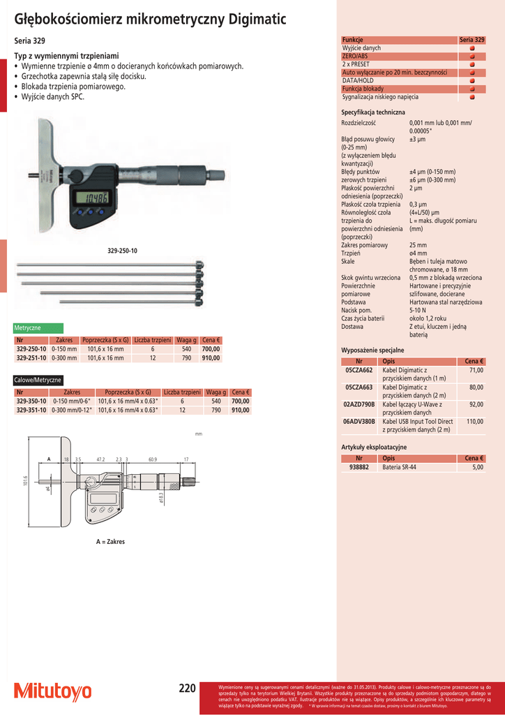 Głębokościomierz mikrometryczny Digimatic Seria 329 Typ z wymiennymi trzpieniami • Wymienne trzpienie ø 4mm o docieranych końcówkach pomiarowych. • Grzechotka zapewnia stałą siłę docisku. • Blokada trzpienia pomiarowego. • Wyjście danych SPC. Funkcje Wyjście danych ZERO/ABS 2 x PRESET Auto wyłączanie po 20 min. bezczynności DATA/HOLD Funkcja blokady Sygnalizacja niskiego napięcia Seria 329 Specyfikacja techniczna Rozdzielczość Błąd posuwu głowicy (0-25 mm) (z wyłączeniem błędu kwantyzacji) Błędy punktów zerowych trzpieni Płaskość powierzchni odniesienia (poprzeczki) Płaskość czoła trzpienia Równoległość czoła trzpienia do powierzchni odniesienia (poprzeczki) Zakres pomiarowy Trzpień Skale 329-250-10 Skok gwintu wrzeciona Powierzchnie pomiarowe Podstawa Nacisk pom. Czas życia baterii Dostawa Metryczne Nr Zakres Poprzeczka (S x G) Liczba trzpieni Waga g Cena € 329-250-10 0-150 mm 101,6 x 16 mm 6 540 700,00 329-251-10 0-300 mm 101,6 x 16 mm 12 790 910,00 ±4 µm (0-150 mm) ±6 µm (0-300 mm) 2 µm 0,3 µm (4+L/50) µm L = maks. długość pomiaru (mm) 25 mm ø4 mm Bęben i tuleja matowo chromowane, ø 18 mm 0,5 mm z blokadą wrzeciona Hartowane i precyzyjnie szlifowane, docierane Hartowana stal narzędziowa 5-10 N około 1,2 roku Z etui, kluczem i jedną baterią Wyposażenie specjalne Nr 05CZA662 Calowe/Metryczne Nr Zakres Poprzeczka (S x G) Liczba trzpieni Waga g Cena € 329-350-10 0-150 mm/0-6" 101,6 x 16 mm/4 x 0.63" 6 540 700,00 329-351-10 0-300 mm/0-12" 101,6 x 16 mm/4 x 0.63" 12 790 910,00 0,001 mm lub 0,001 mm/ 0.00005" ±3 µm 05CZA663 02AZD790B 06ADV380B mm Opis Kabel Digimatic z przyciskiem danych (1 m) Kabel Digimatic z przyciskiem danych (2 m) Kabel łączący U-Wave z przyciskiem danych Kabel USB Input Tool Direct z przyciskiem danych (2 m) Cena € 71,00 80,00 92,00 110,00 Artykuły eksploatacyjne 18 3.5 47.2 2.3 3 60.9 17 Nr 938882 Opis Bateria SR-44 Cena € 5,00 ø18.3 ø4 101.6 A A = Zakres 220 Wymienione ceny są sugerowanymi cenami detalicznymi (ważne do 31.05.2013). Produkty calowe i calowo-metryczne przeznaczone są do sprzedaży tylko na terytorium Wielkiej Brytanii. Wszystkie produkty przeznaczone są do sprzedaży podmiotom gospodarczym, dlatego w cenach nie uwzględniono podatku VAT. Ilustracje produktów nie są wiążące. Opisy produktów, a szczególnie ich kluczowe parametry są wiążące tylko na podstawie wyraźnej zgody. * W sprawie informacji na temat czasów dostaw, prosimy o kontakt z biurem Mitutoyo. Głębokościomierz mikrometryczny Specyfikacja techniczna Podziałka Błąd posuwu głowicy (0-25 mm) Błąd punktu zerowego trzpieni Płaskość powierzchni odniesienia (poprzeczki) Płaskość czoła trzpienia Równoległość czoła trzpienia do powierzchni odniesienia (poprzeczki) Skale Zakres pomiarowy Skok gwintu wrzeciona Powierzchnie pomiarowe Podstawa Nacisk pom. Dostawa Seria 129 0,01 mm lub 0.001" ±3 µm ±4 µm (0-150 mm) ±6 µm (0-300 mm) 1,3 µm dla 63,5 mm 2 µm dla 101,6 mm Typ z wymiennymi trzpieniami - Model analogowy • Wymienne trzpienie ø 4mm, o docieranych końcówkach pomiarowych, zapewniają szeroki zakres pomiarowy inkrementowany co 25mm. • Grzechotka zapewnia stałą siłę docisku. • Przyrząd posiada blokadę trzpienia pomiarowego. 0,3 µm (4+ L/50) µm L=maks. długość pomiaru (mm) Bęben i tuleja matowo chromowane ø 18 mm 25 mm 0,5 mm, blokada wrzeciona Hartowane, szlifowane precyzyjnie, docierane precyzyjnie Hartowana stal narzędziowa 5-10 N Dostarczane z etui i kluczem 129-112 Metryczne Poprzeczka 63,5 x 16 mm Nr Zakres Liczba trzpieni Waga g 129-154* 0-25 mm 240 129-109 0-50 mm 2 260 129-110 0-75 mm 3 280 129-111 0-100 mm 4 310 129-112 0-150 mm 6 370 129-152 0-300 mm 12 600 Cena € 147,00 151,00 153,00 201,00 278,00 421,00 Metryczne Poprzeczka 101,6 x 16 mm Nr Zakres Liczba trzpieni Waga g 129-155* 0-25 mm 290 129-113 0-50 mm 2 310 129-114 0-75 mm 3 330 129-115 0-100 mm 4 355 129-116 0-150 mm 6 410 129-153 0-300 mm 12 640 Cena € 174,00 178,00 189,00 220,00 289,00 443,00 Calowe Poprzeczka 4 x 0.63" Nr Zakres Liczba trzpieni Waga g 129-129* 0-2" 2 310 129-130* 0-3" 3 330 129-131* 0-4" 4 355 129-132 0-6" 6 410 129-150 0-12" 12 640 Cena € 178,00 189,00 220,00 289,00 443,00 Calowe Poprzeczka 2.5 x 0.63" Nr Zakres Liczba trzpieni Waga g 129-126 0-3" 3 280 129-127* 0-4" 4 310 129-128 0-6" 6 370 129-149* 0-12" 12 600 Cena € 153,00 201,00 278,00 421,00 mm A 3 65.4 17 ø4 101.6 ø18.3 18 A - Zakres Wymienione ceny są sugerowanymi cenami detalicznymi (ważne do 31.05.2013). Produkty calowe i calowo-metryczne przeznaczone są do sprzedaży tylko na terytorium Wielkiej Brytanii. Wszystkie produkty przeznaczone są do sprzedaży podmiotom gospodarczym, dlatego w cenach nie uwzględniono podatku VAT. Ilustracje produktów nie są wiążące. Opisy produktów, a szczególnie ich kluczowe parametry są wiążące tylko na podstawie wyraźnej zgody. * W sprawie informacji na temat czasów dostaw, prosimy o kontakt z biurem Mitutoyo. 221 Głębokościomierz mikrometryczny Specyfikacja techniczna Seria 128 • • • • Trzpień pomiarowy ø 4mm. Grzechotka zapewnia stałą siłę nacisku. Blokada trzpienia pomiarowego. Dostępny jest model trzpienia pokrytego węglikiem spiekanym. Podziałka Błąd posuwu głowicy (0-25 mm) Płaskość powierzchni odniesienia (poprzeczki) Płaskość czoła trzpienia Równoległość czoła trzpienia do powierzchni odniesienia (poprzeczki) Skale Zakres pomiarowy Skok gwintu wrzeciona Powierzchnie pomiarowe Podstawa Nacisk pom. Dostawa 0,01 mm/0.001" ±3 µm 1,3 µm (dla 63,5 mm) 2 µm (dla 101,6 mm) 0,3 µm (4+L/50) µm L=max. mierzona długość (mm) Bęben i tuleja matowo chromowane, ø 18 mm 25 mm 0,5 mm, blokada wrzeciona Hartowane i precyzyjnie szlifowane, docierane Hartowana stal narzędziowa 5-10 N Dostarczane z etui i kluczem 128-101 Metryczne Nr Zakres Poprzeczka (S x G) Waga g Cena € 128-101 0-25 mm 63,5 x 16 mm 200 129,