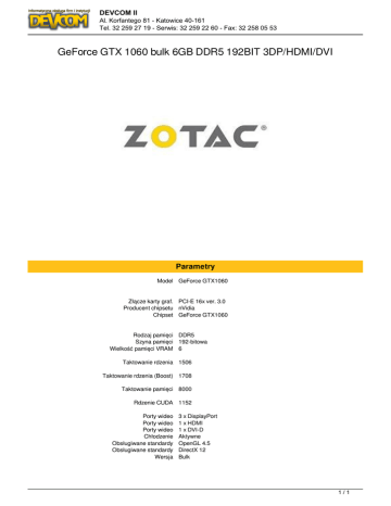 DEVCOM II Al. Korfantego 81 - Katowice 40-161 Tel. 32 259 27 19 - Serwis: 32 259 22 60 - Fax: 32 258 05 53 GeForce GTX 1060 bulk 6GB DDR5 192BIT 3DP/HDMI/DVI Parametry Model GeForce GTX1060 Złącze karty graf. PCI-E 16x ver. 3.0 Producent chipsetu nVidia Chipset GeForce GTX1060 Rodzaj pamięci DDR5 Szyna pamięci 192-bitowa Wielkość pamięci VRAM 6 Taktowanie rdzenia 1506 Taktowanie rdzenia (Boost) 1708 Taktowanie pamięci 8000 Rdzenie CUDA 1152 Porty wideo Porty wideo Porty wideo Chłodzenie Obsługiwane standardy Obsługiwane standardy Wersja 3 x DisplayPort 1 x HDMI 1 x DVI-D Aktywne OpenGL 4.5 DirectX 12 Bulk 1/1 Powered by TCPDF (www.tcpdf.org)