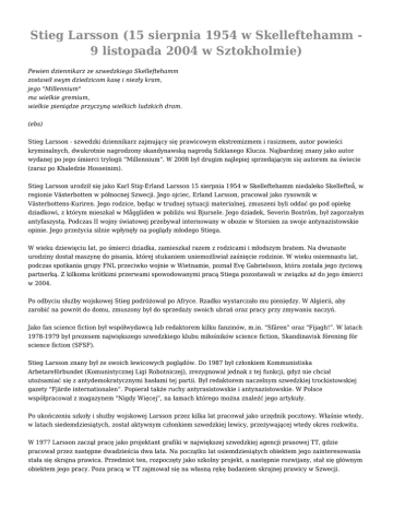 Stieg Larsson (15 sierpnia 1954 w Skelleftehamm 9 listopada 2004 w Sztokholmie) Pewien dziennikarz ze szwedzkiego Skelleftehamm zostawił swym dziedzicom kasę i niezły kram, jego "Millennium" ma wielkie gremium, wielkie pieniądze przyczyną wielkich ludzkich dram. (ebs) Stieg Larsson - szwedzki dziennikarz zajmujący się prawicowym ekstremizmem i rasizmem, autor powieści kryminalnych, dwukrotnie nagrodzony skandynawską nagrodą Szklanego Klucza. Najbardziej znany jako autor wydanej po jego śmierci trylogii "Millennium". W 2008 był drugim najlepiej sprzedającym się autorem na świecie (zaraz po Khaledzie Hosseinim). Stieg Larsson urodził się jako Karl Stig-Erland Larsson 15 sierpnia 1954 w Skelleftehamm niedaleko Skellefteå, w regionie Västerbotten w północnej Szwecji. Jego ojciec, Erland Larsson, pracował jako rysownik w Västerbottens-Kuriren. Jego rodzice, będąc w trudnej sytuacji materialnej, zmuszeni byli oddać go pod opiekę dziadkowi, z którym mieszkał w Måggliden w pobliżu wsi Bjursele. Jego dziadek, Severin Boström, był zagorzałym antyfaszystą. Podczas II wojny światowej przebywał internowany w obozie w Storsien za swoje antynazistowskie opinie. Jego przeżycia silnie wpłynęły na poglądy młodego Stiega. W wieku dziewięciu lat, po śmierci dziadka, zamieszkał razem z rodzicami i młodszym bratem. Na dwunaste urodziny dostał maszynę do pisania, której stukaniem uniemożliwiał zaśnięcie rodzinie. W wieku osiemnastu lat, podczas spotkania grupy FNL przeciwko wojnie w Wietnamie, poznał Evę Gabrielsson, która została jego życiową partnerką. Z kilkoma krótkimi przerwami spowodowanymi pracą Stiega pozostawali w związku aż do jego śmierci w 2004. Po odbyciu służby wojskowej Stieg podróżował po Afryce. Rzadko wystarczało mu pieniędzy. W Algierii, aby zarobić na powrót do domu, zmuszony był do sprzedaży swoich ubrań oraz pracy przy zmywaniu naczyń. Jako fan science fiction był współwydawcą lub redaktorem kilku fanzinów, m.in. "Sfären” oraz "Fijagh!”. W latach 1978-1979 był prezesem największego szwedzkiego klubu miłośników science fiction, Skandinavisk förening för science fiction (SFSF). Stieg Larsson znany był ze swoich lewicowych poglądów. Do 1987 był członkiem Kommunistiska Arbetareförbundet (Komunistycznej Ligi Robotniczej), zrezygnował jednak z tej funkcji, gdyż nie chciał utożsamiać się z antydemokratycznymi hasłami tej partii. Był redaktorem naczelnym szwedzkiej trockistowskiej gazety "Fjärde internationalen”. Popierał także ruchy antyrasistowskie i antynazistowskie. W Polsce współpracował z magazynem "Nigdy Więcej”, na łamach którego można znaleźć jego artykuły. Po ukończeniu szkoły i służby wojskowej Larsson przez kilka lat pracował jako urzędnik pocztowy. Właśnie wtedy, w latach siedemdziesiątych, został aktywnym członkiem szwedzkiej lewicy, przeżywającej wtedy okres rozkwitu. W 1977 Larsson zaczął pracę jako projektant grafiki w największej szwedzkiej agencji prasowej TT, gdzie pracował przez następne dwadzieścia dwa lata. Na początku lat osiemdziesiątych obiektem jego zainteresowania stała się skrajna prawica. Przedmiot ten, rozpoczęty jako szkolny projekt, a następnie rozwijany, stał się głównym obiektem jego pracy. Poza pracą w TT zajmował się na własną rękę badaniem skrajnej prawicy w Szwecji. Efektem jego pracy stała się wydana w 1991 książka "Extremhögern", którą napisał we współpracy z Anną-Leną Lodenius, szwedzką pisarką specjalizującą się w autonomistycznych i nacjonalistycznych grupach ekstremistycznych. W wywiadzie powiedziała ona, że Larsson myślał o napisaniu serii książek detektywistycznych już na początku lat dziewięćdziesiątych, jednak trzeba było na to poczekać jeszcze dziesięć lat. W odpowiedzi na jego książkę w 1993 pewna neonazistowska gazeta zamieściła artykuł, w którym wydrukowano zdjęcia, numery telefonów oraz adresy, zarówno Lodenius, jak i Larssona wraz z pytaniem, czy „powinno się mu pozwolić kontynuować pracę, czy coś należy z tym zrobić”. Wydawca gazety został skazany na 4 miesiące więzienia. To wydarzenie nie uciszyło Larssona, zamiast tego przekonało go o konieczności podjęcia walki. Od połowy lat 80. był skandynawskim korespondentem brytyjskiego antyfaszystowskiego magazynu "Searchlight”, a w 1995, kiedy ośmiu ludzi w Szwecji zostało zabitych przez neonazistów, to on był główną postacią stojącą za powstaniem szwedzkiej, antyfaszystowskiej fundacji Expo oraz magazynu "Expo”. Zadaniem fundacji jest przeciwdziałanie wzrostowi skrajnej prawicy w szkołach i pośród młodych ludzi oraz stanie na straży demokracji i wolności słowa. Przez dwa lata Stieg łączył obie prace aż do czasu, gdy w 1997 odszedł z TT, poświęcając się całkowicie pracy w "Expo”. Od 1999 aż do śmierci piastował tam posadę redaktora naczelnego. Larsson zmarł w wieku pięćdziesięciu lat 9 listopada 2004 w Sztokholmie z powodu rozległego zawału mięśnia sercowego. Spuścizna W maju 2008 ogłoszono, że w testamencie z 1977, znalezionym zaraz po jego śmierci, Larsson postanowił przekazać swój spadek oddziałowi Kommunistiska Arbetareförbundet w Umeå. Nie było to jednak przez nikogo poświadczone i testament ten nie jest uznawany przez szwedzkie prawo. Wynika z tego, że cały dorobek Larssona, włączając w to zyski ze sprzedanych książek, należy się jego ojcu oraz bratu, Erlandowi i Joakimowi Larssonom. Jego wieloletnia partnerka, Eva Gabrielsson, która znalazła jego testament, nie ma żadnych praw do spadku, gdyż nie była jego żoną. Brak ślubu spowodowany był obawą przed niebezpieczeństwem ze strony prawicowych ekstremistów. Sprawa ta wywołała gwałtowną dyskusję pomiędzy nią a rodziną Larssona. Eva utrzymuje, że "oni nigdy nie byli częścią ich życia” i nie są to odpowiednie osoby do zarządzania m